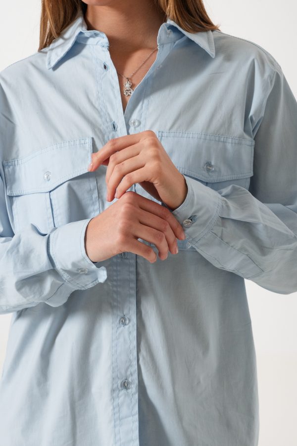 Camisa estilo over confeccionado en tela de poplin con detalle de bolsillos delanteros pinzados y botones.