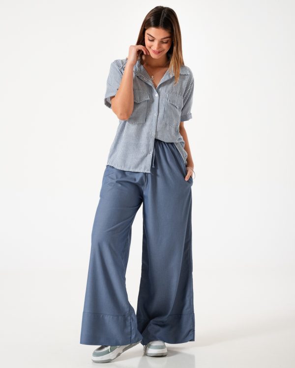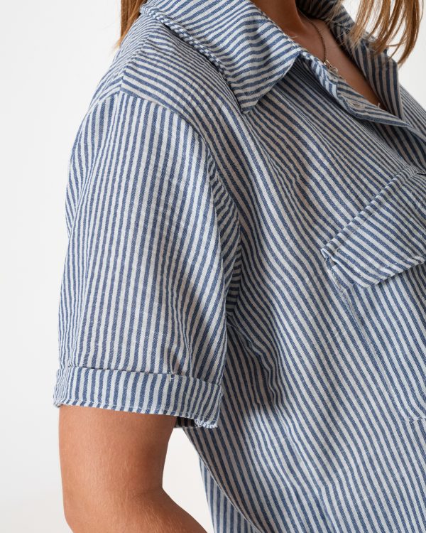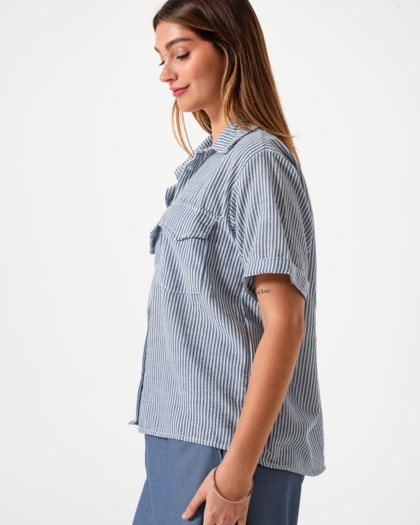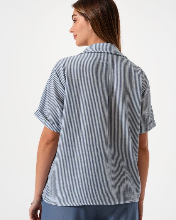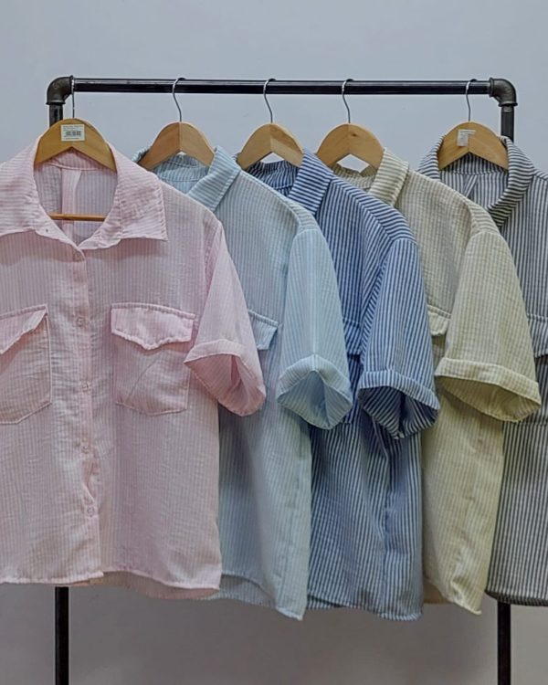 Camisa estilo corta confeccionado en tela de lino rayado con detalle de botones y bolsillos.