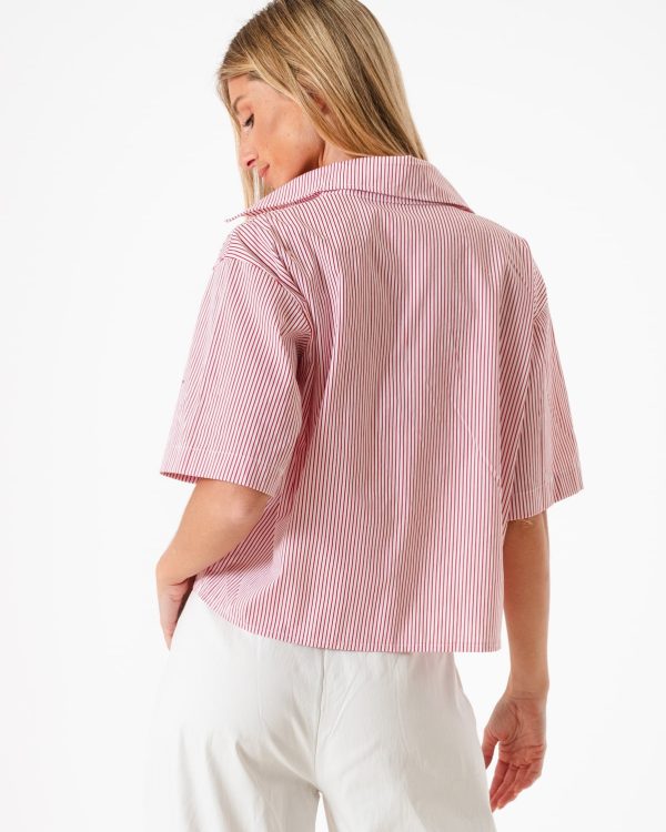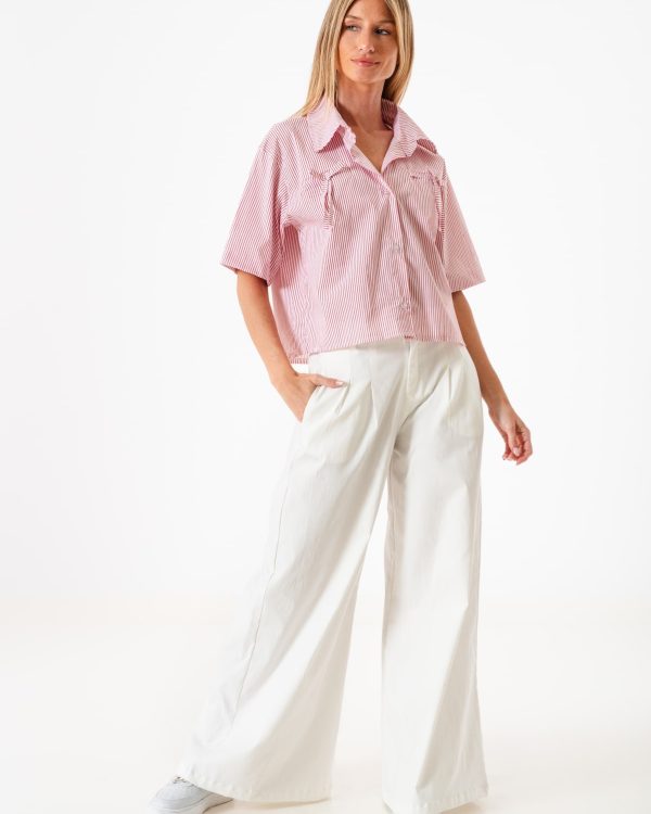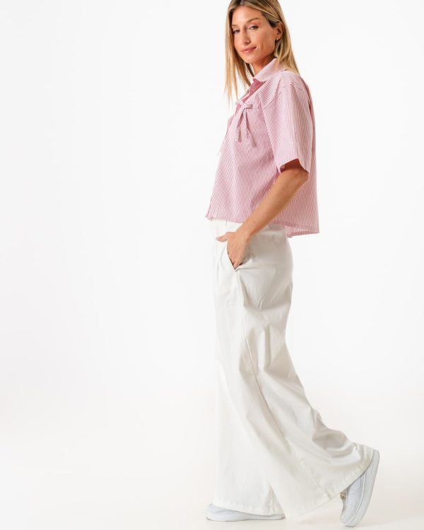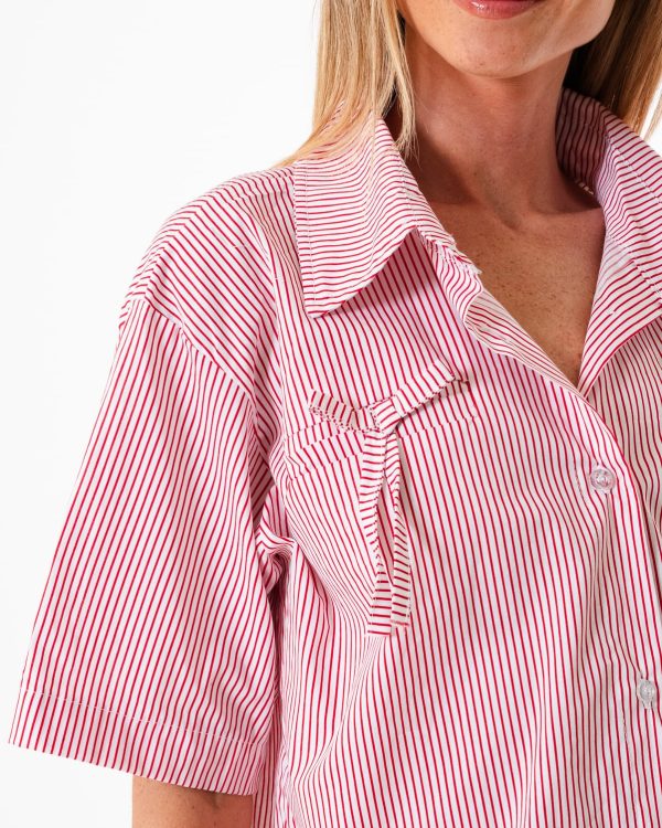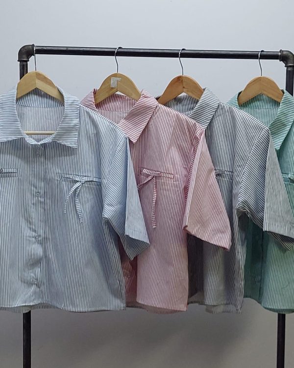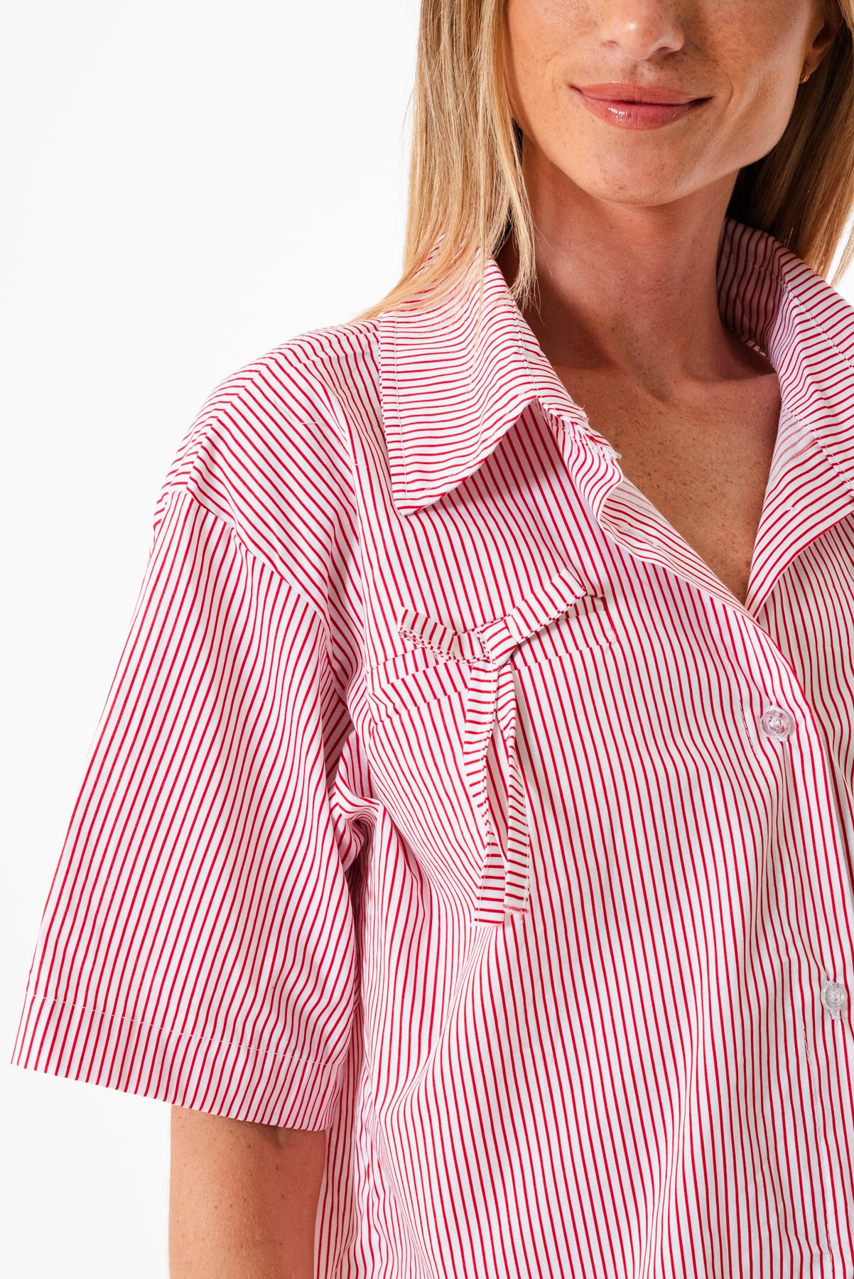 Camisa estilo corta confeccionado en tela de poplin rayado con detalle de bolsillos, moño y botones.