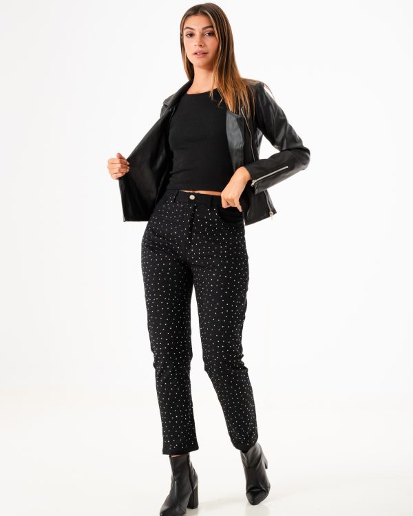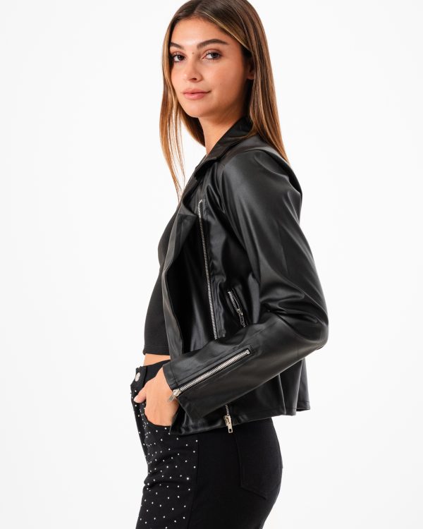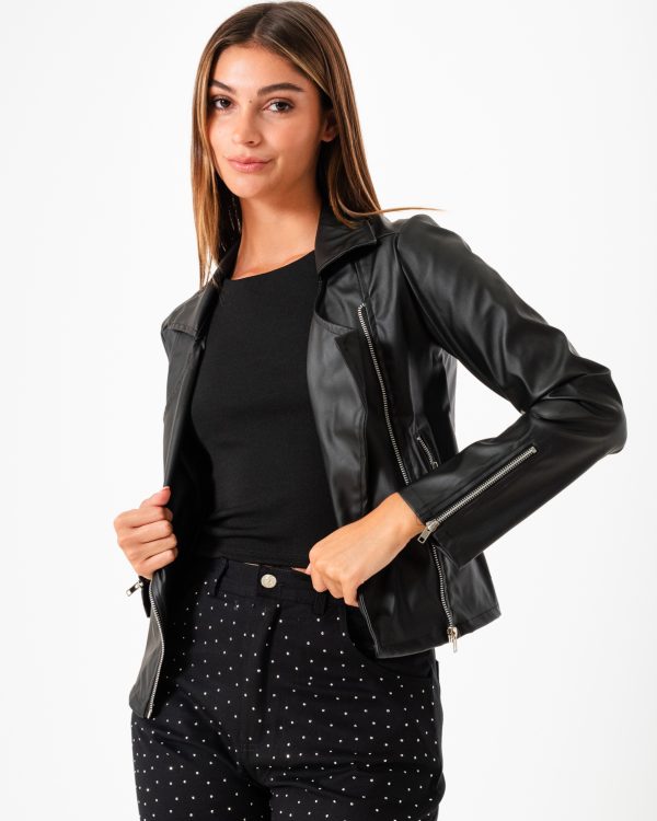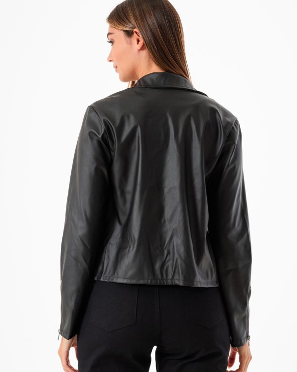 Campera confeccionada en tela de ecocuero con detalle de 4 cierre y bolsillos.
