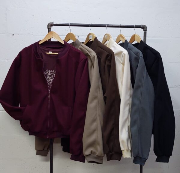 Campera confeccionada en tela de paño con detalle de bolsillos y cierre
