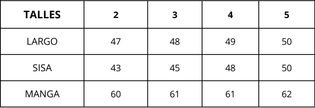 | Talles | 2, 3, 4, 5 |