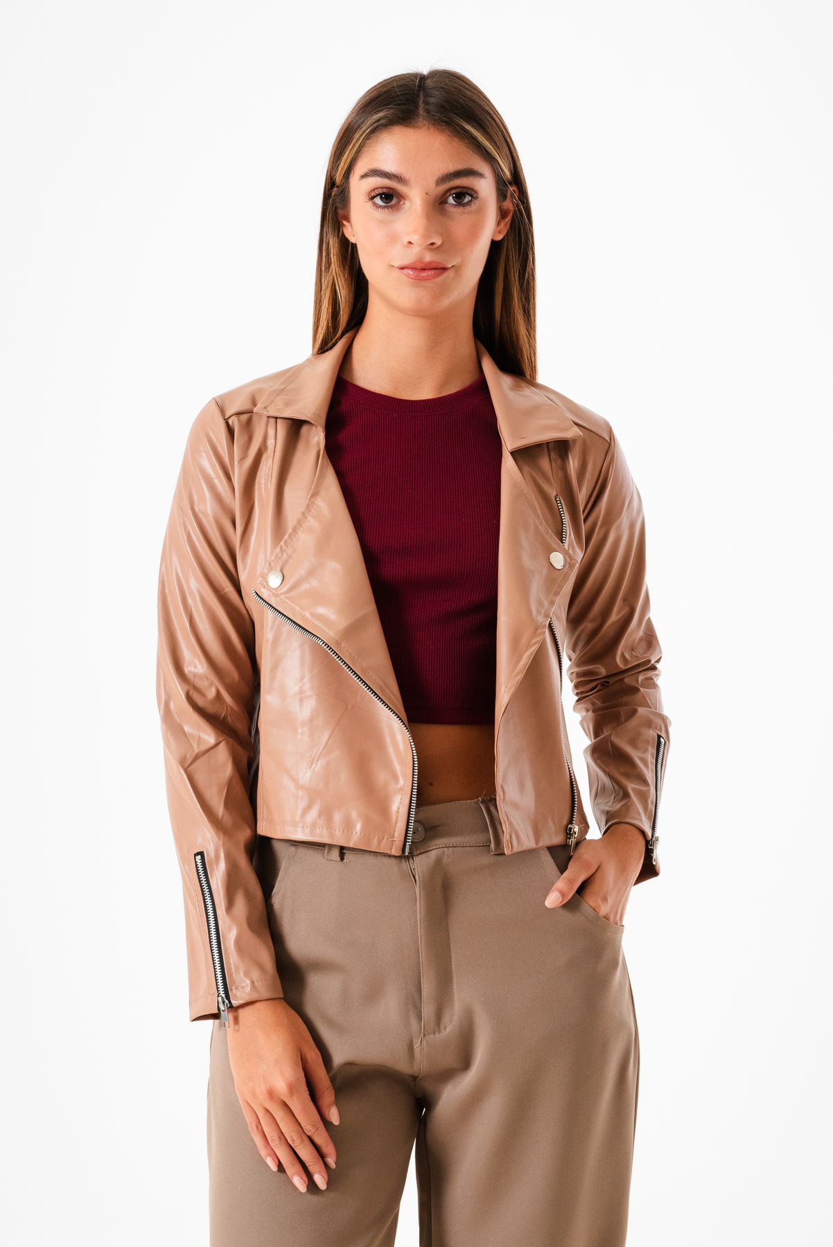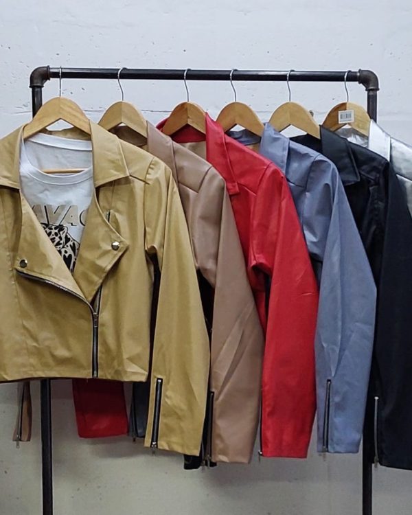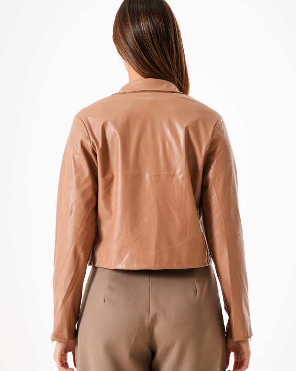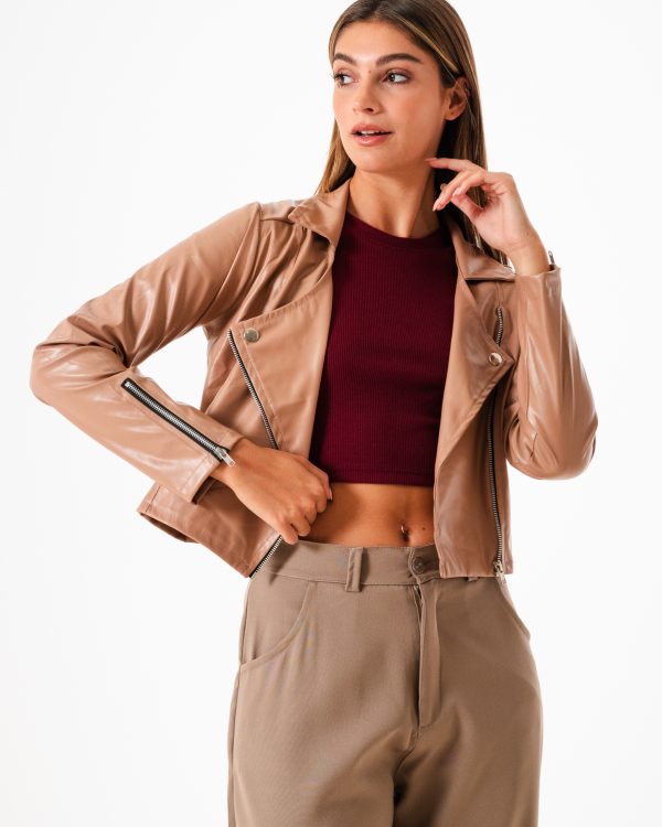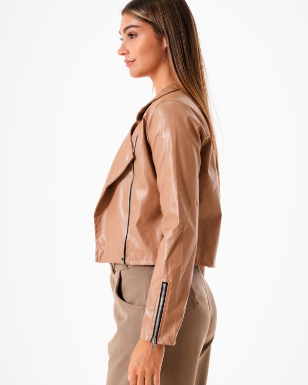 Campera confeccionada en tela de ecocuero con detalle de cierre cruzado y bolsillos.