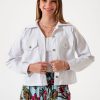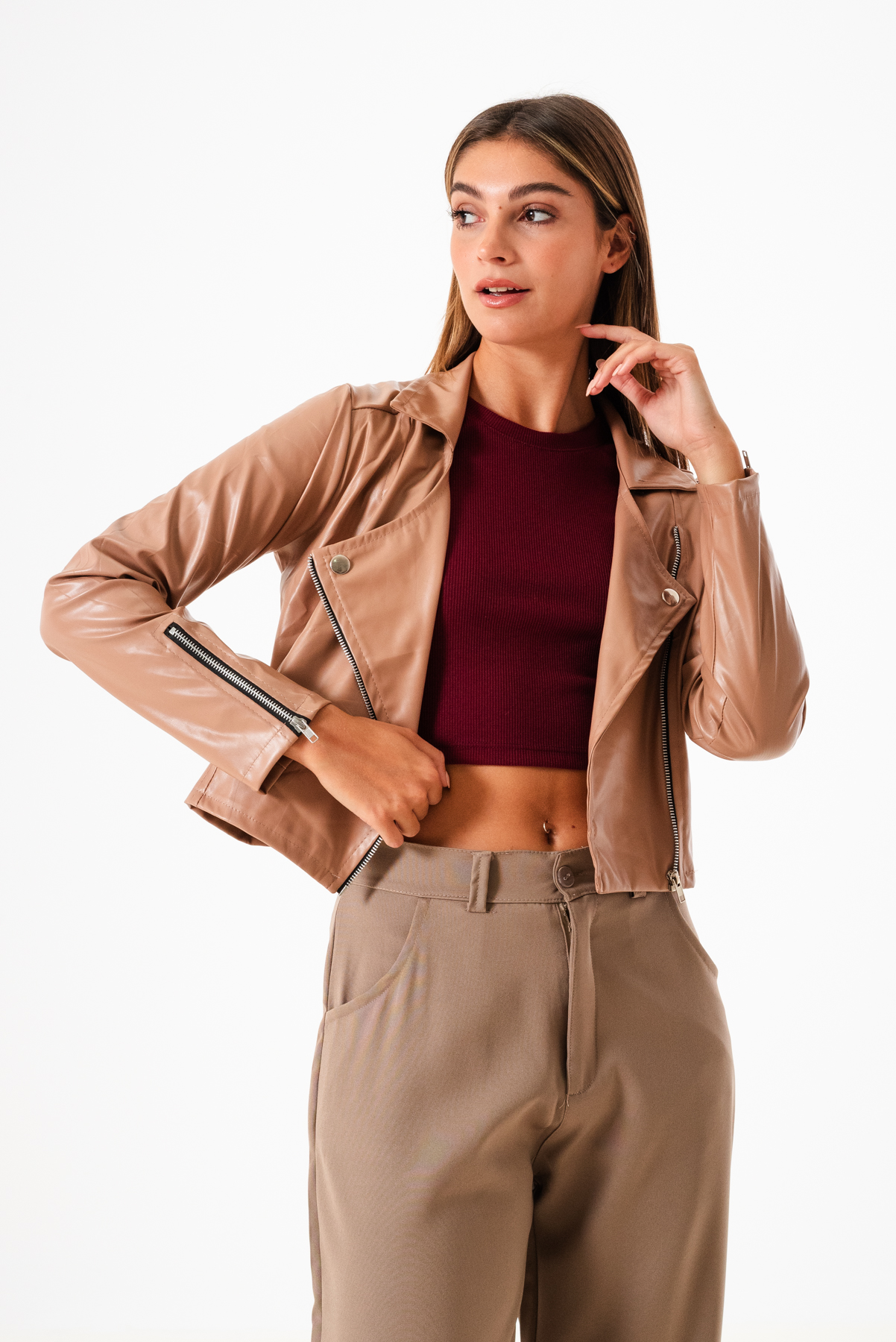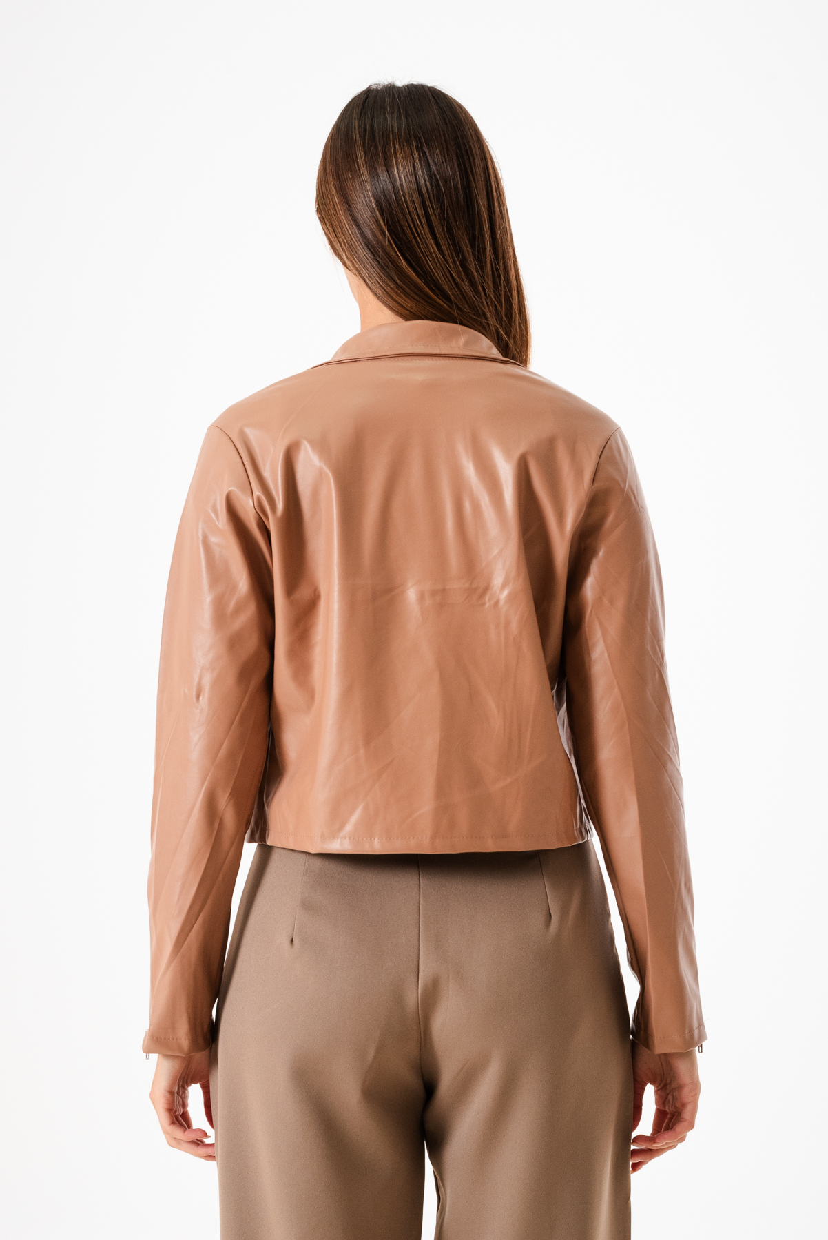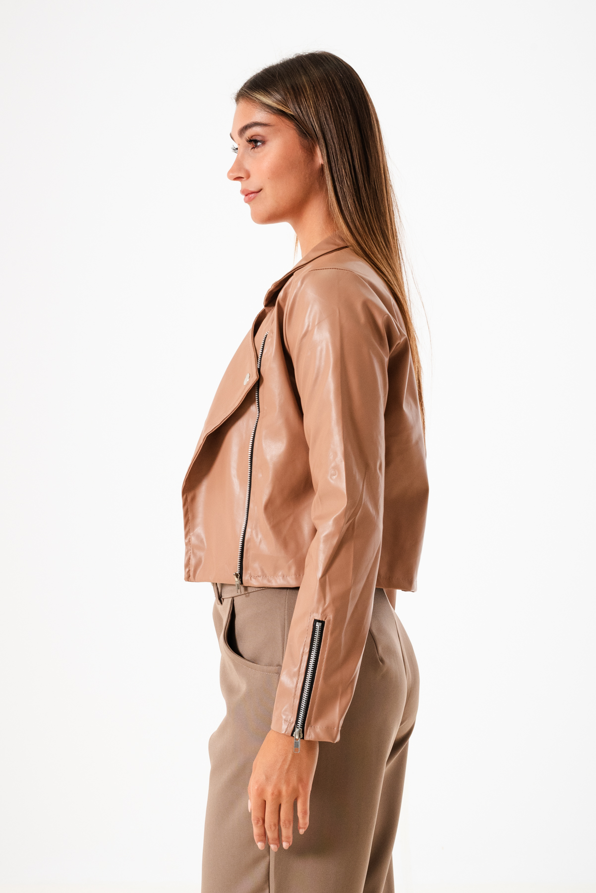 Campera confeccionada en tela de ecocuero con detalle de cierre cruzado y bolsillos.