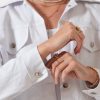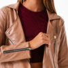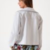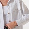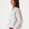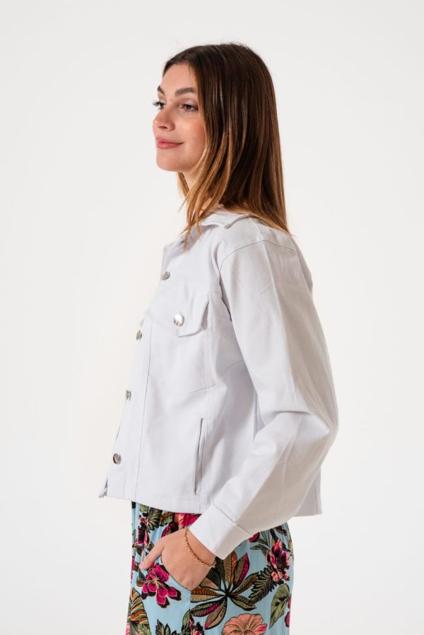 Campera estilo mom confeccionada en tela de gabardina con detalle de botones y bolsillos delanteros.