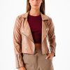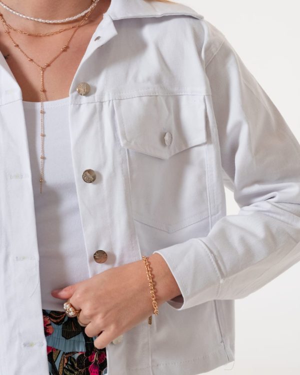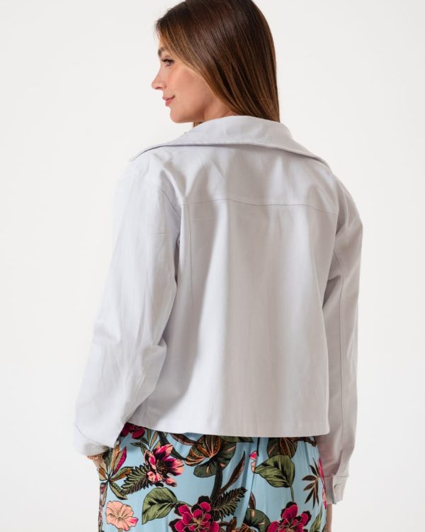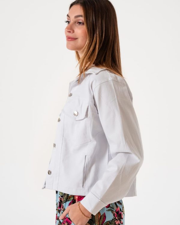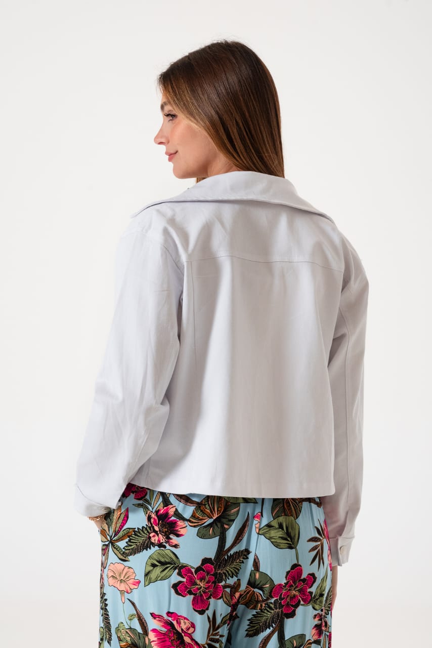Campera estilo mom confeccionada en tela de gabardina con detalle de botones y bolsillos delanteros.
