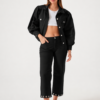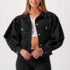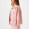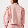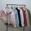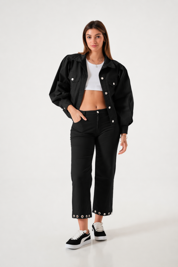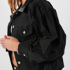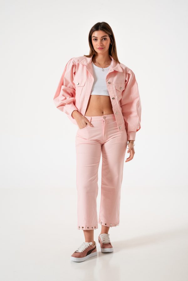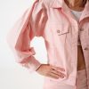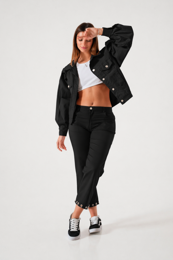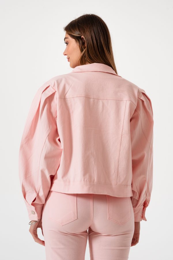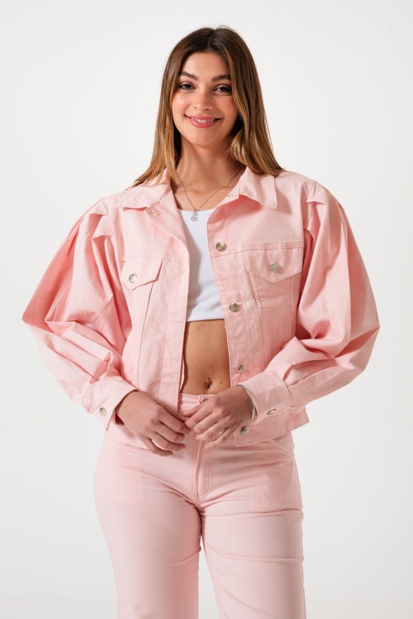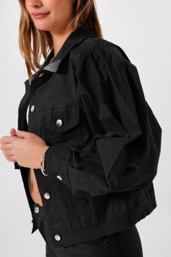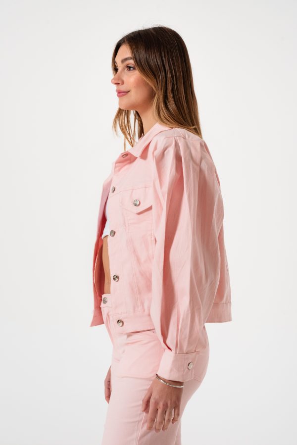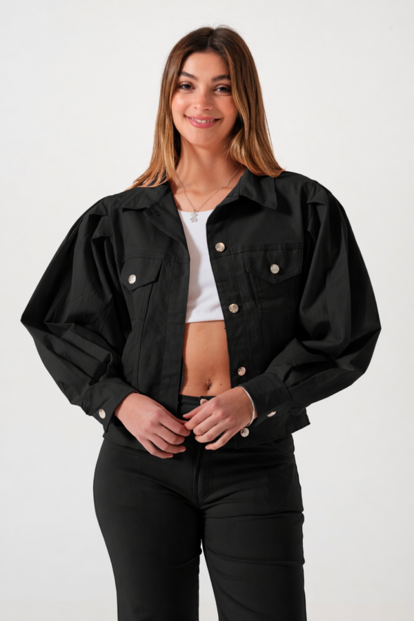 Campera estilo manga princesa confeccionada en tela de gabardina con detalle de bolsillos delanteros y botones