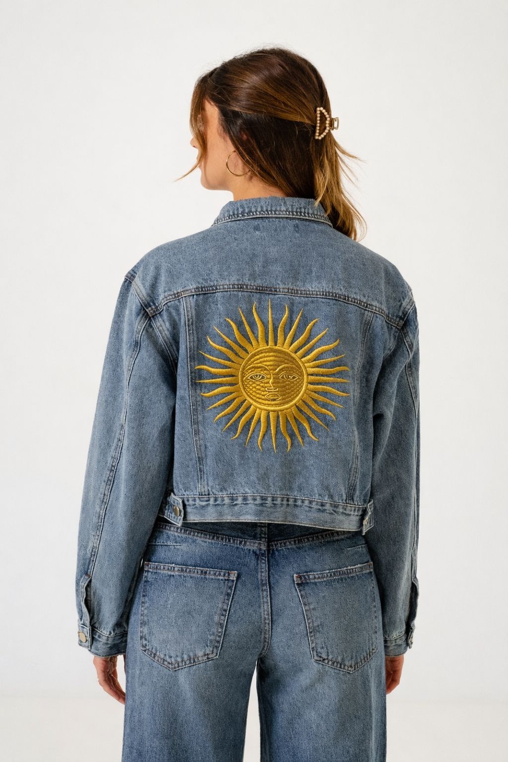 Campera confeccionada en tela de jean con detalle de sol de mayor bordado en espalda y botones