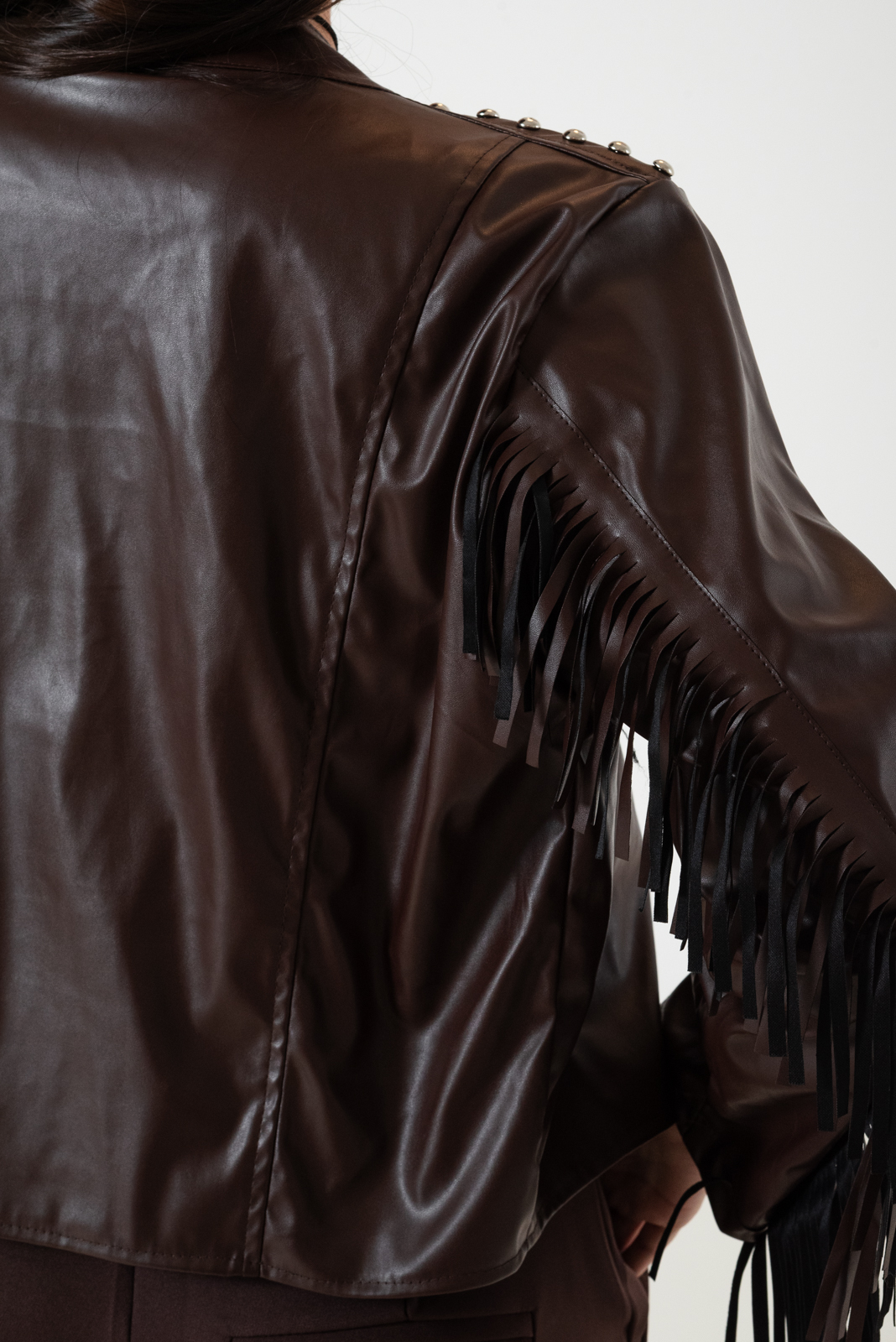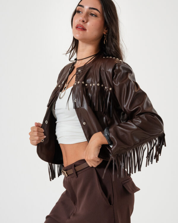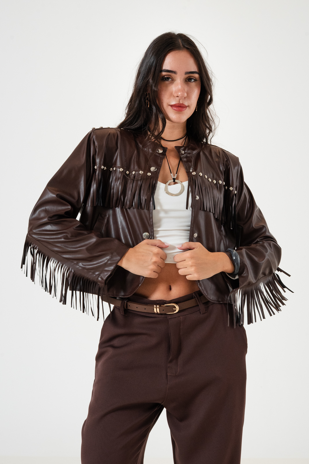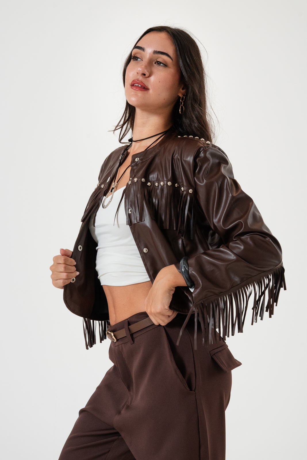 Casaca confeccionada en tela de ecocuero con detalle de botones, flecos en su parte delantera y en mangas con tachas incluidas