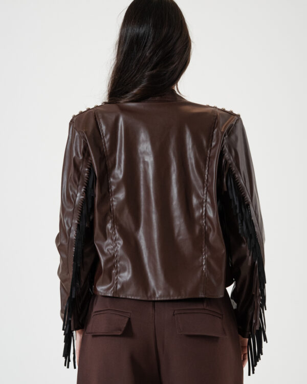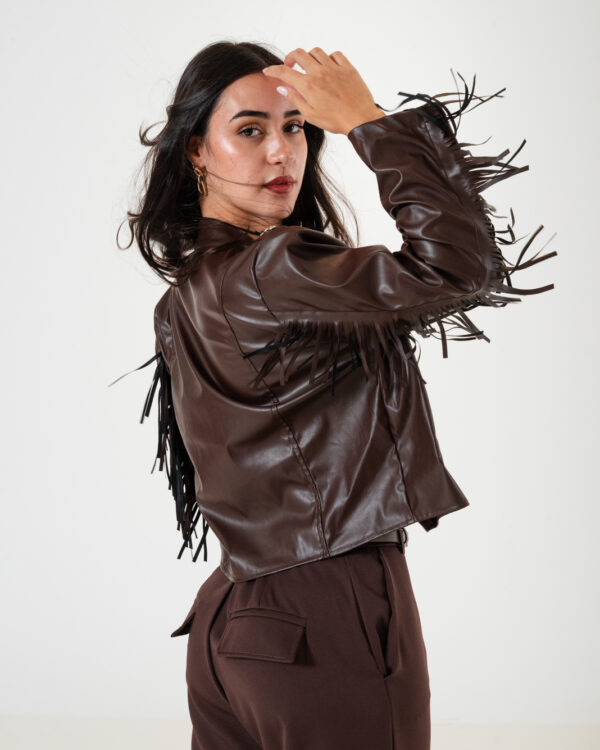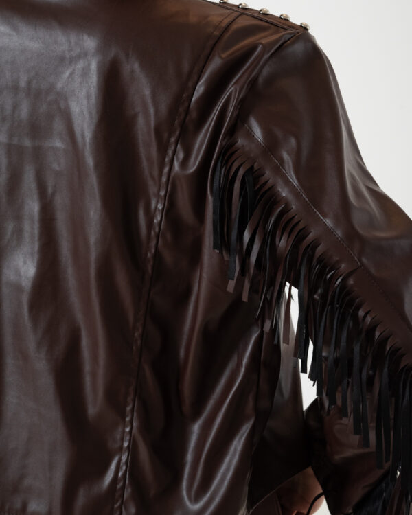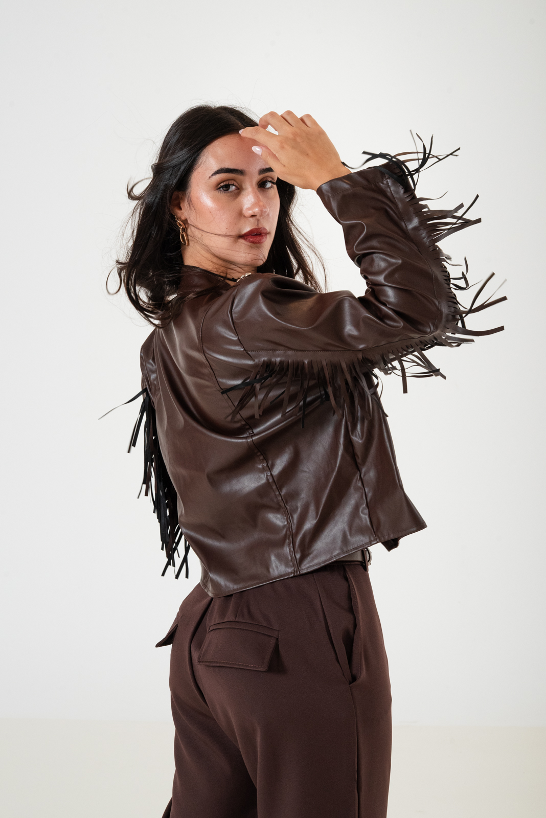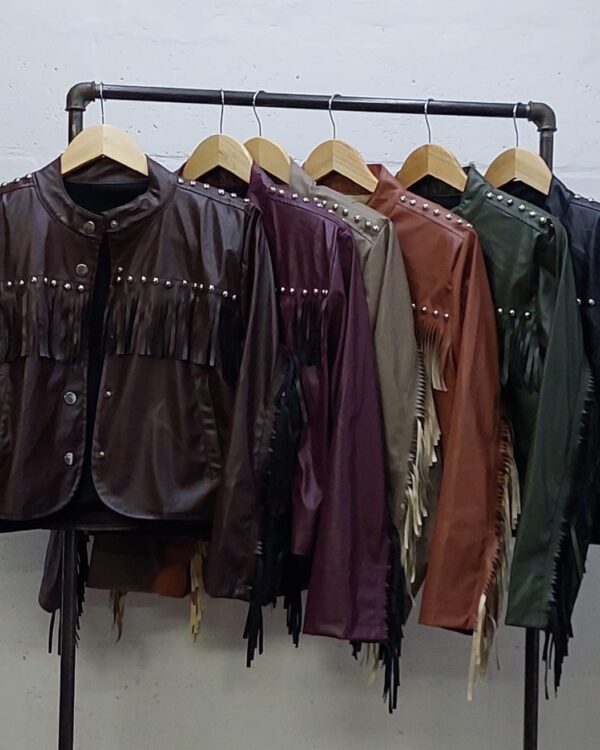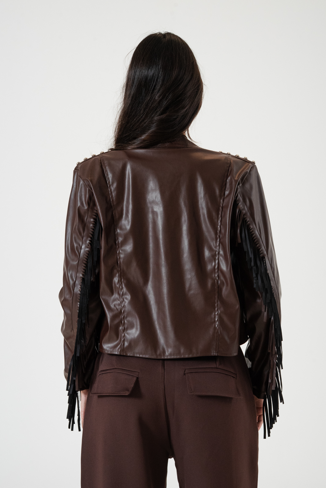 Casaca confeccionada en tela de ecocuero con detalle de botones, flecos en su parte delantera y en mangas con tachas incluidas