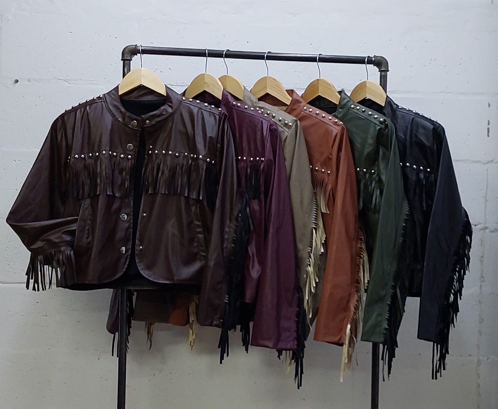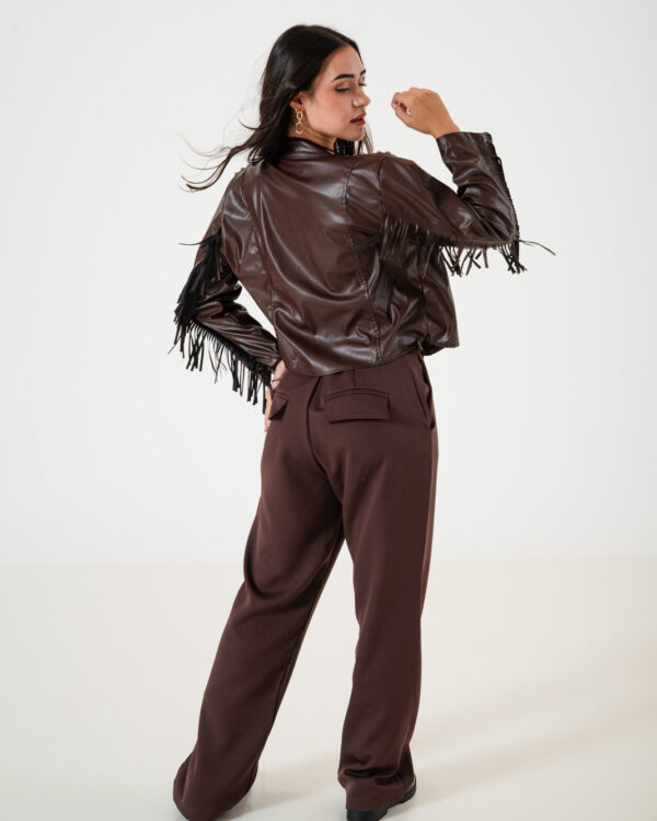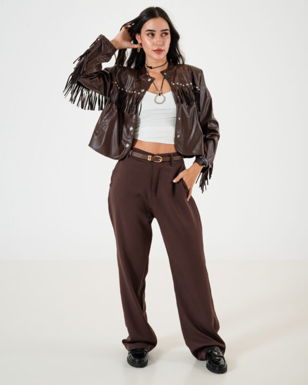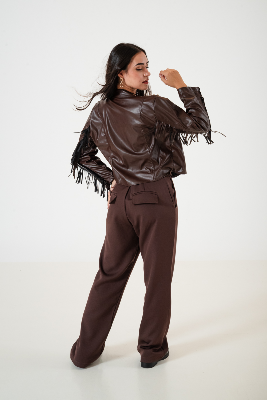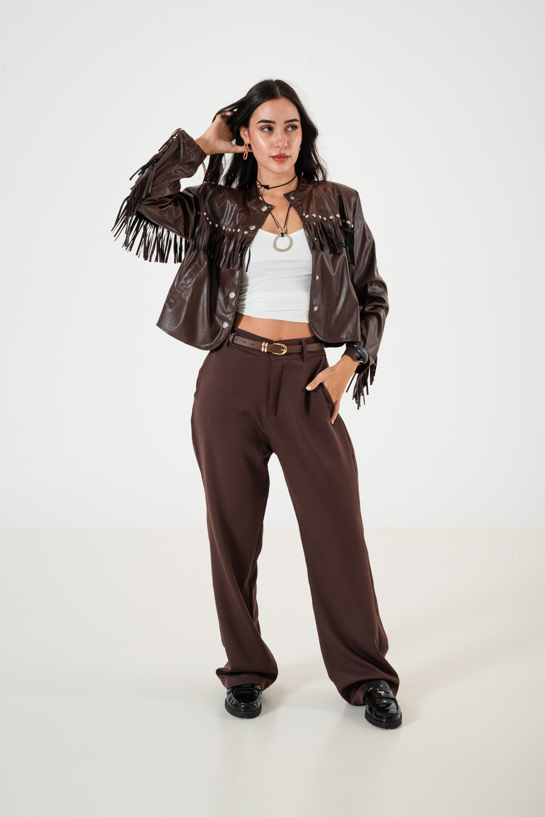 Casaca confeccionada en tela de ecocuero con detalle de botones, flecos en su parte delantera y en mangas con tachas incluidas