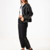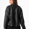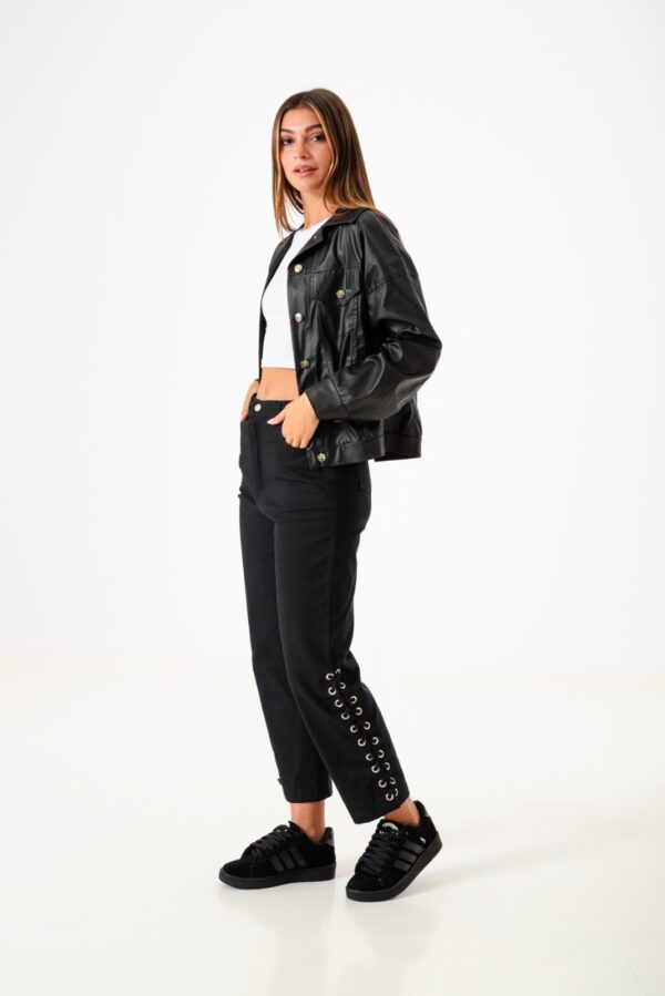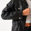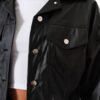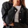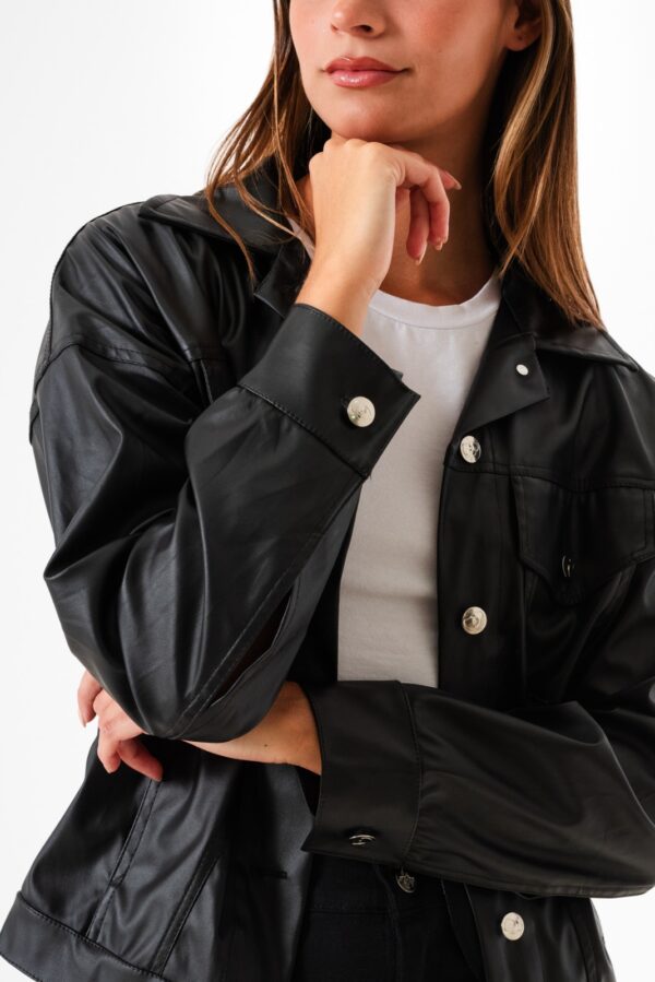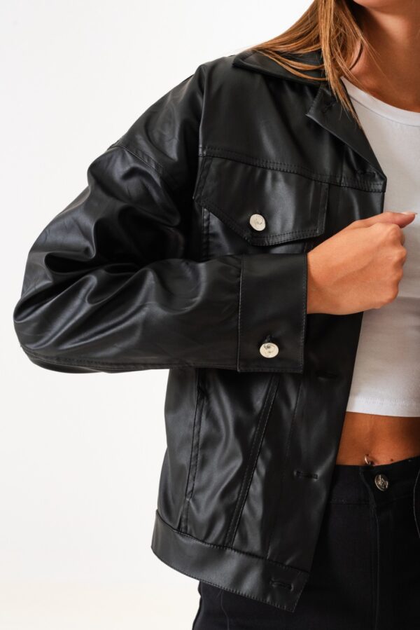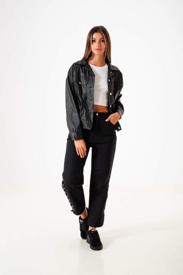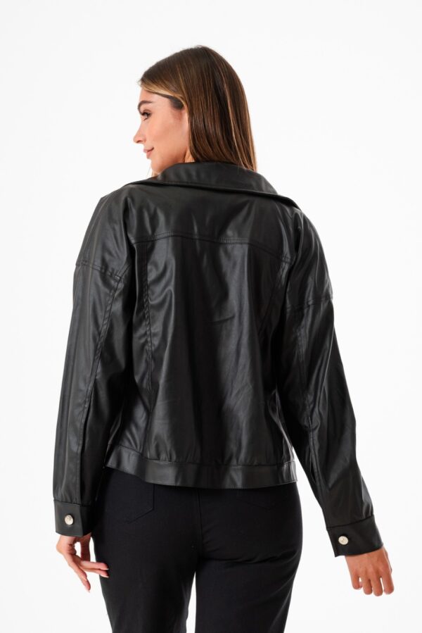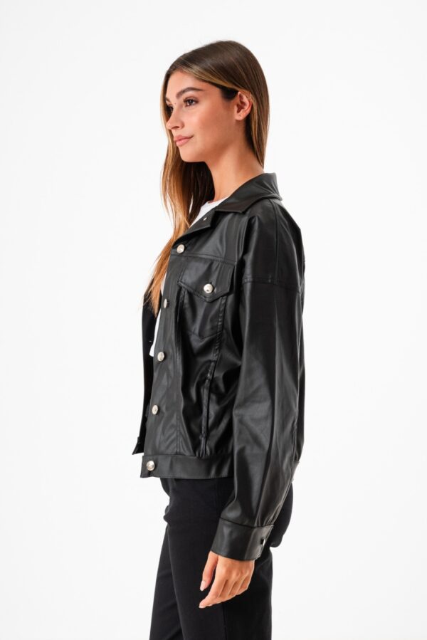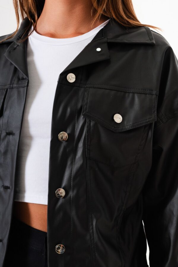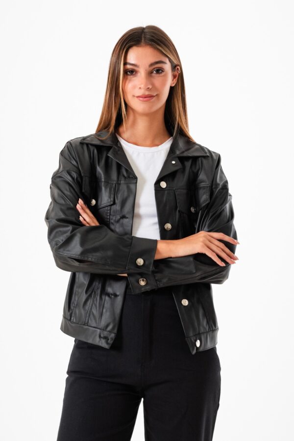 Campera estilo casaca confeccionada en tela de simil ecocuero con detalle de bolsillos delanteros y botones