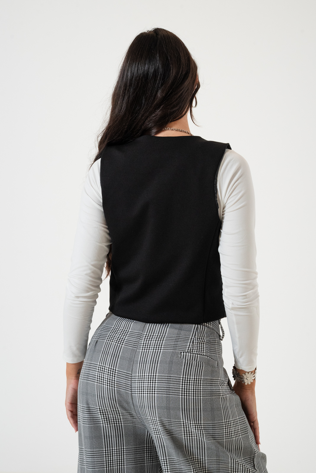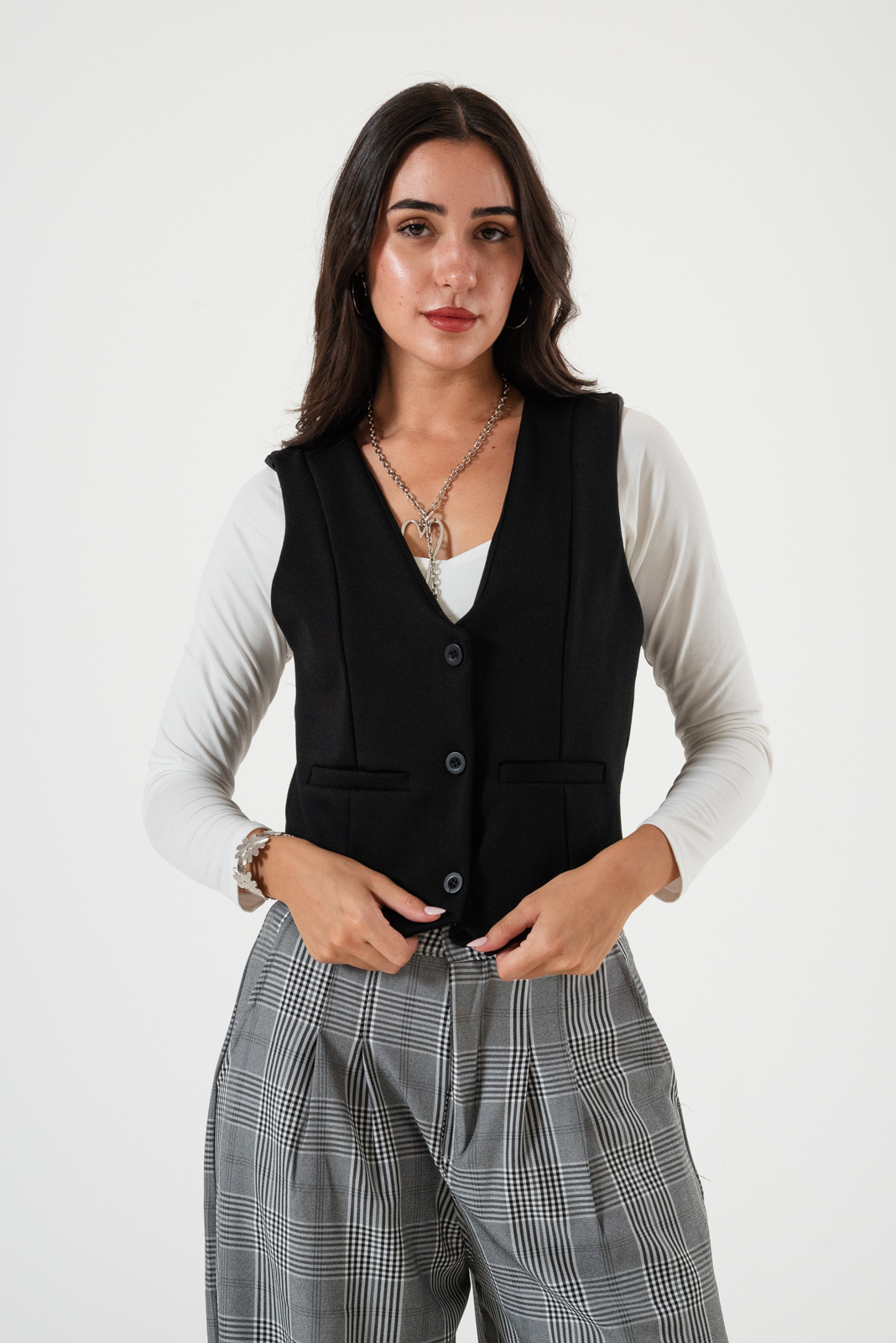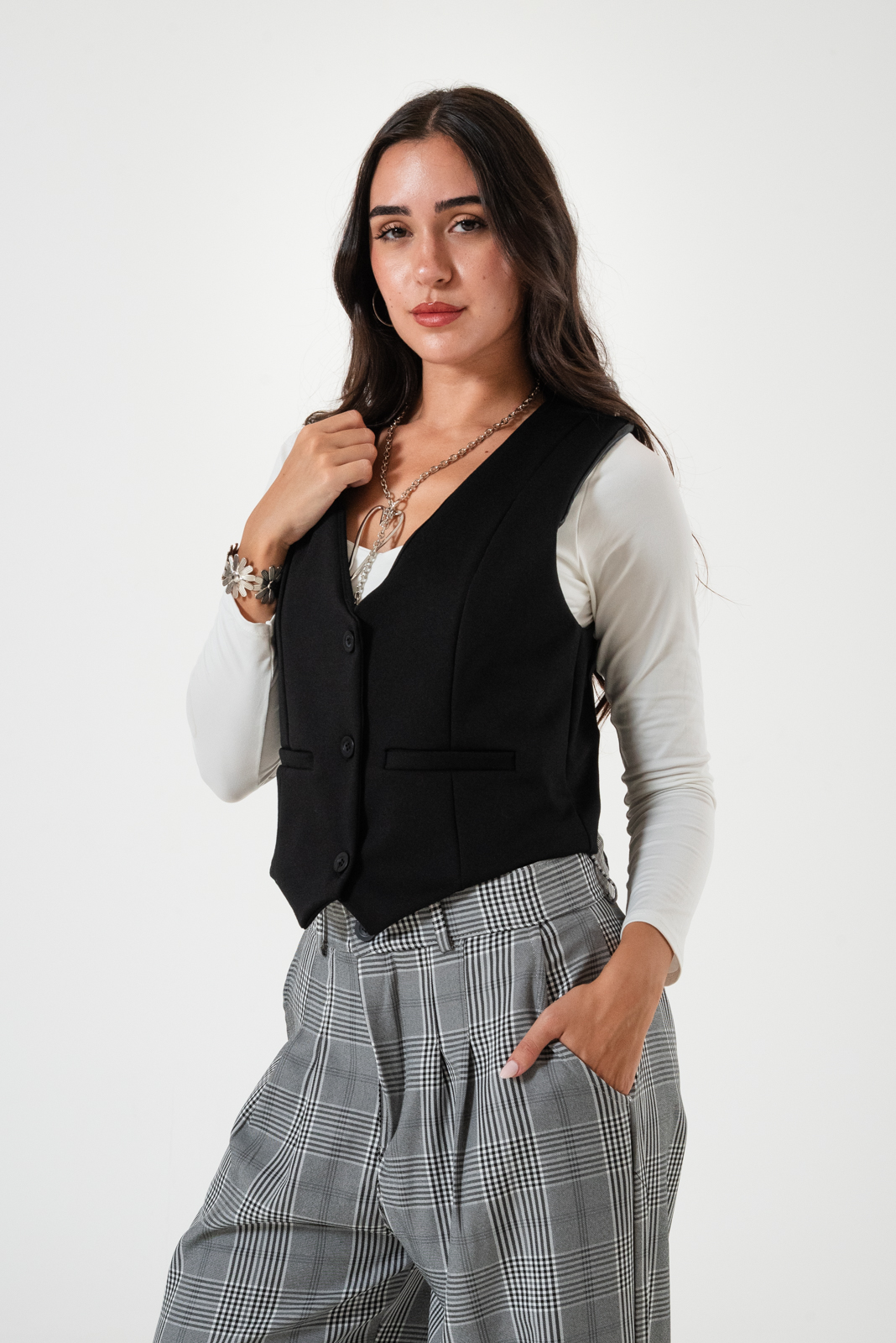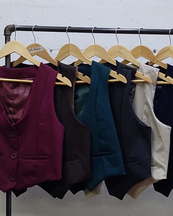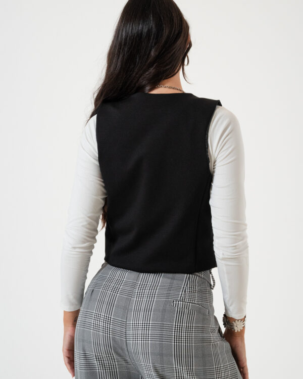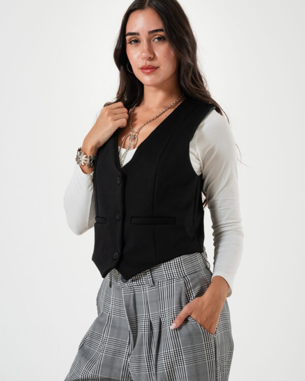 Chaleco confeccionado en tela de punto roma con detalle de botones y forrado en su interior