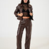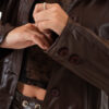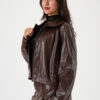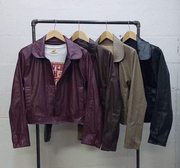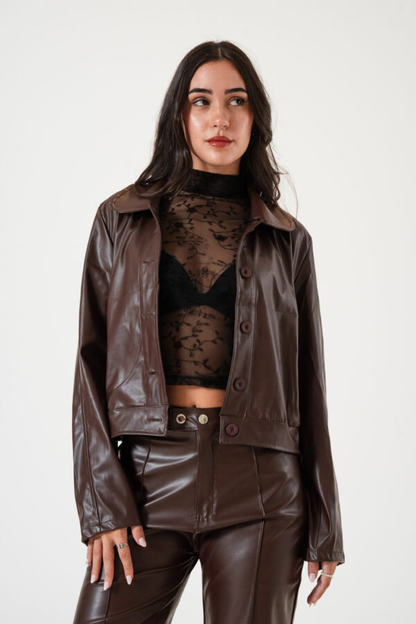 Campera estilo chaqueta confeccionada en tela de ecocuero con detalle de botones y bolsillos.