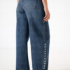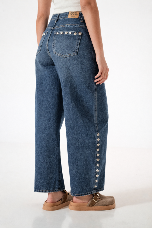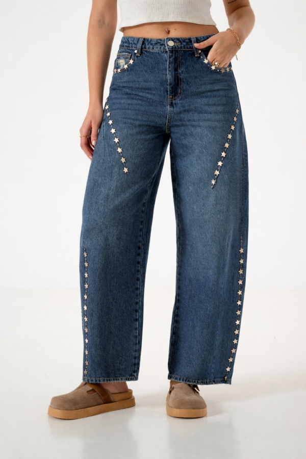 Jean estilo baloon con detalle de tachas en forma de estrellas, bolsillos, pasacinto, cierre y boton
