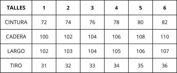 | Talles | 1, 2, 3, 4, 5, 6 |