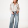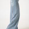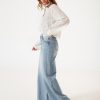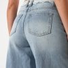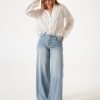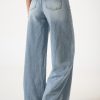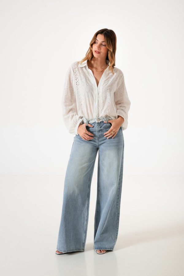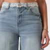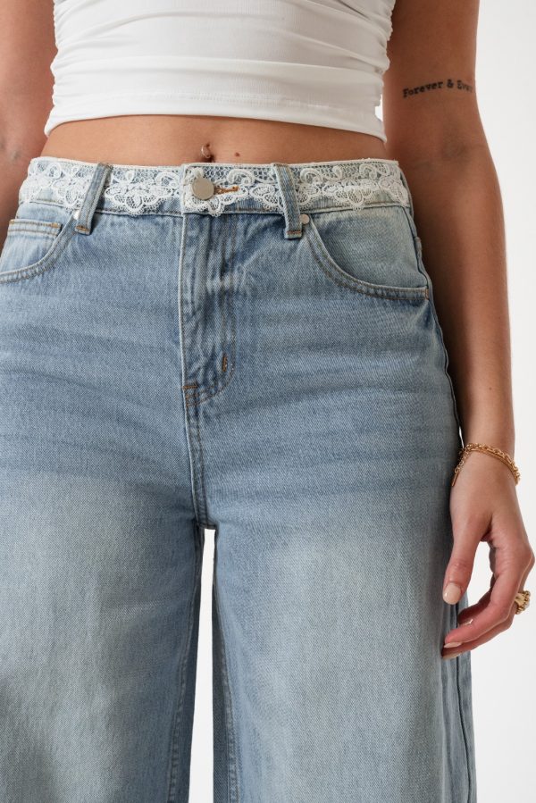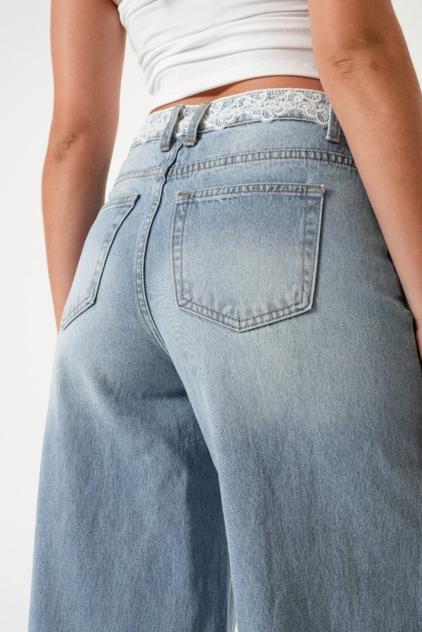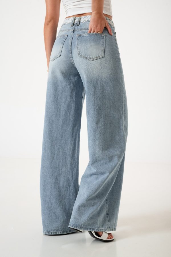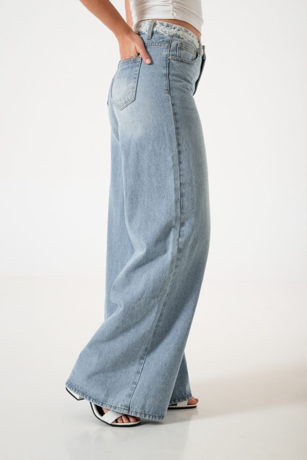 Vaquero estilo wid leg confeccionado en tela de jean con detalle de encaje en su cintura, bolsillos, pasacinto, cierre y boton.