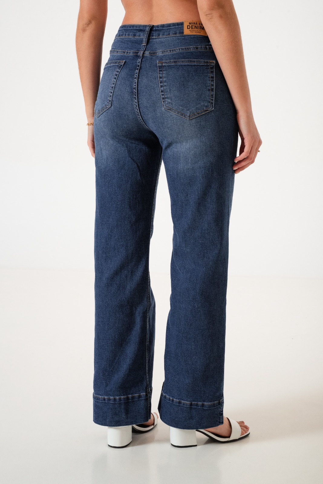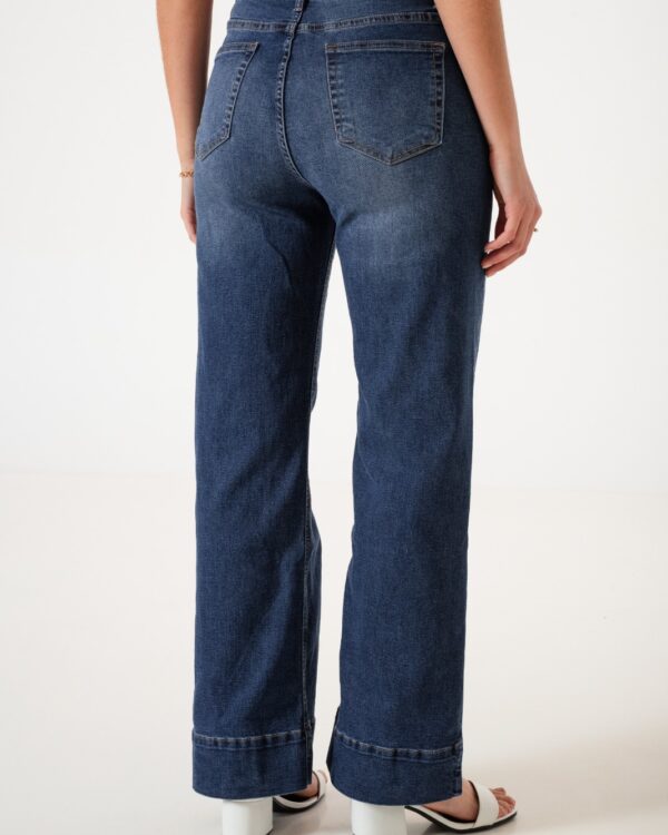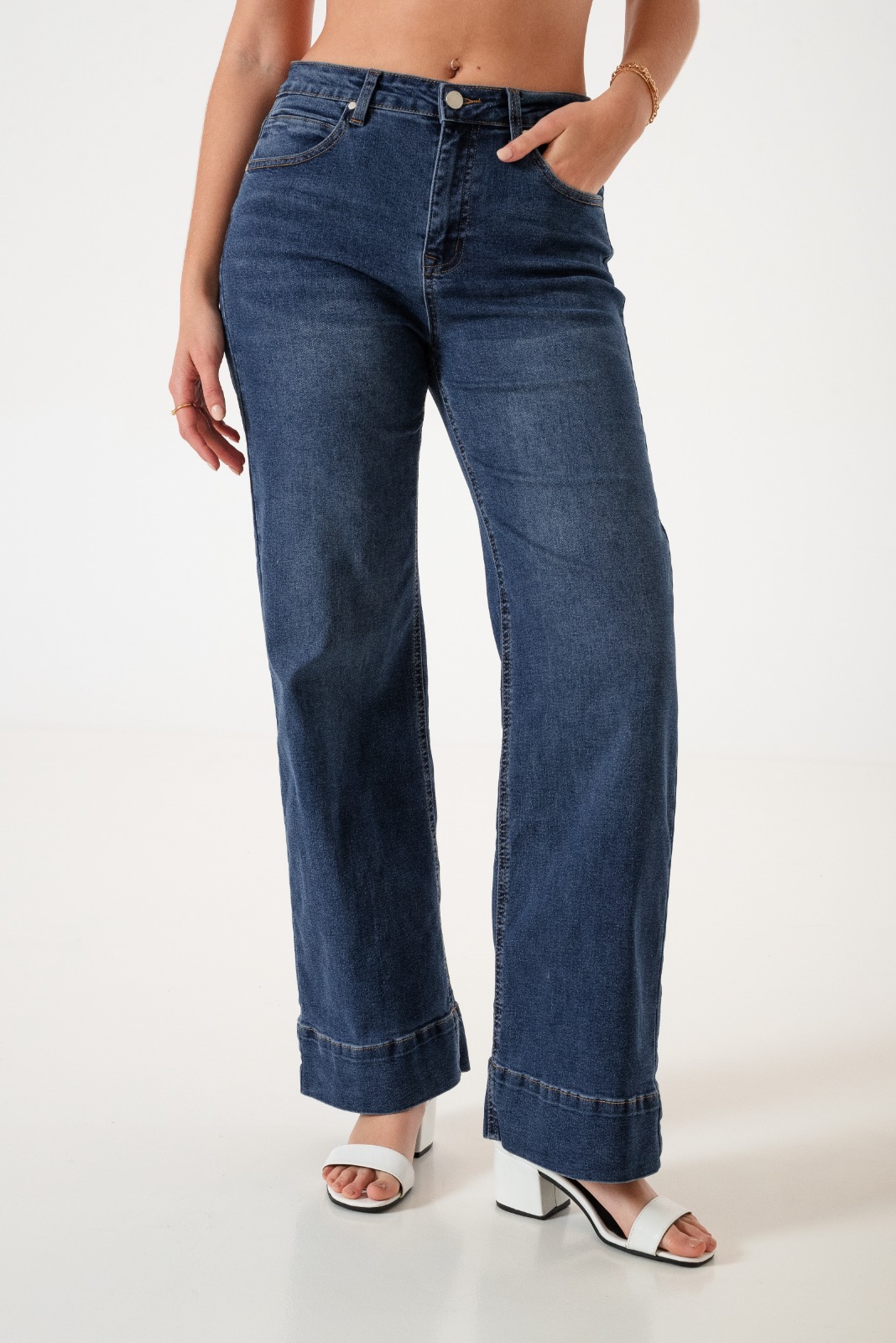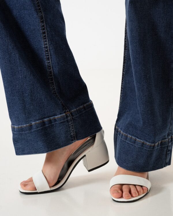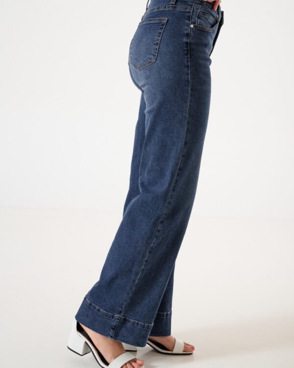 Jean estilo wid leg con detalle de botamanga, bolsillos, pasacinto, cierre y boton.
