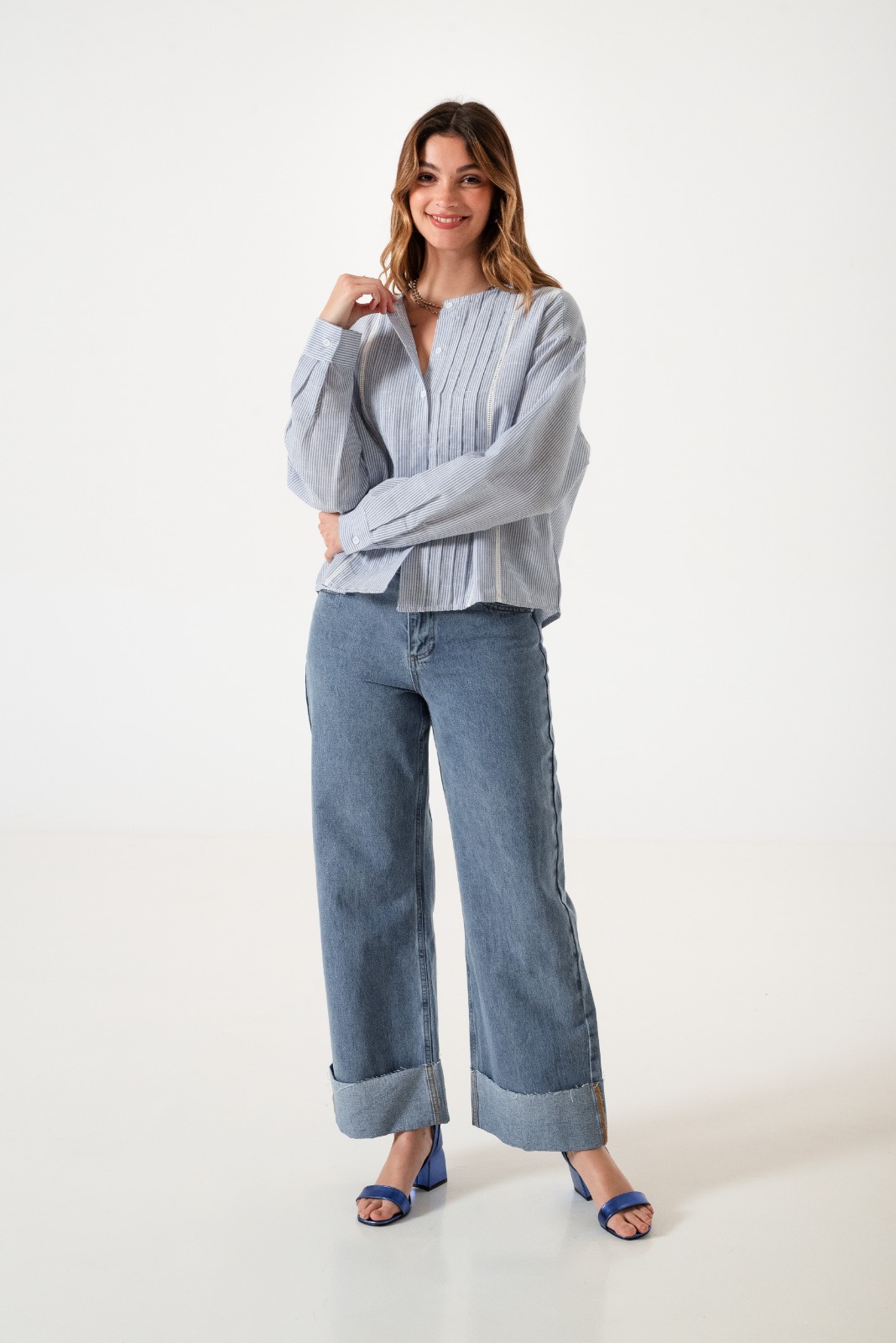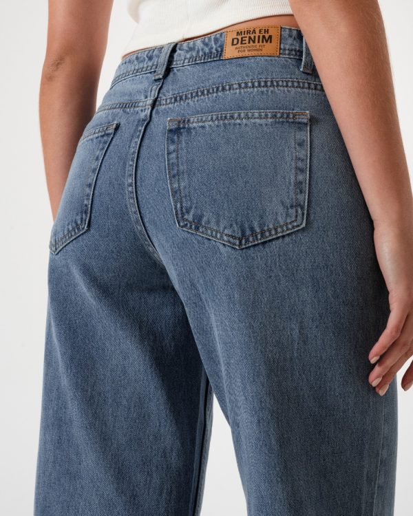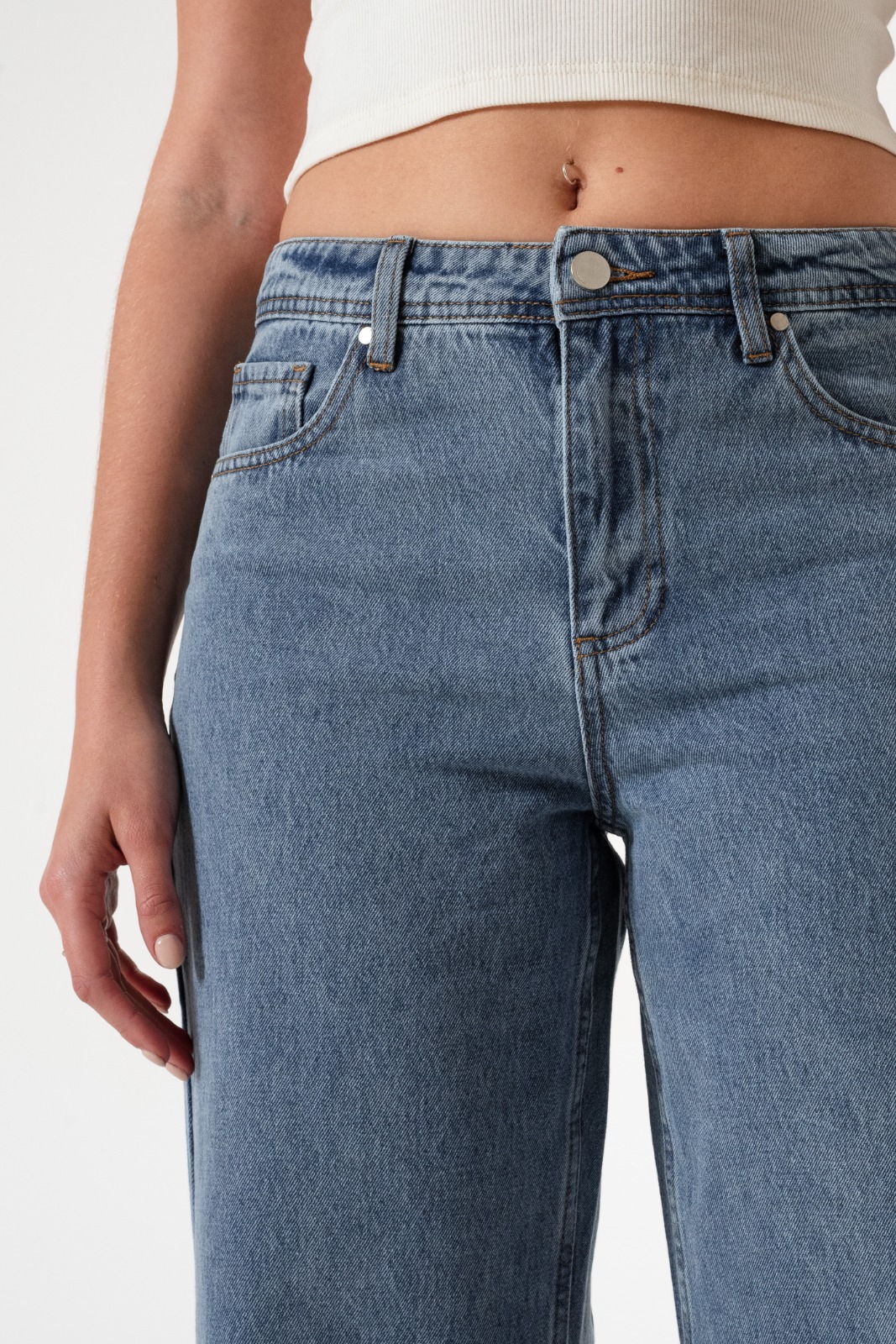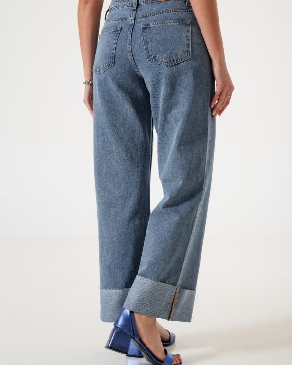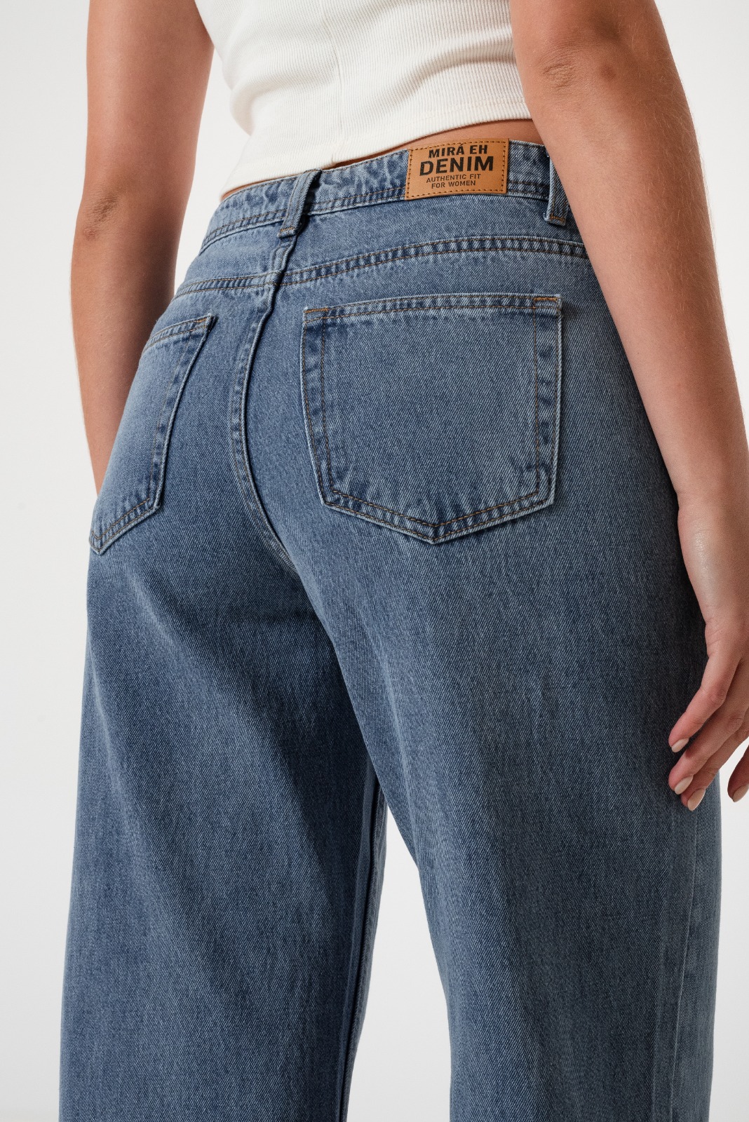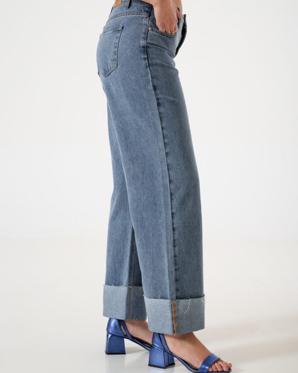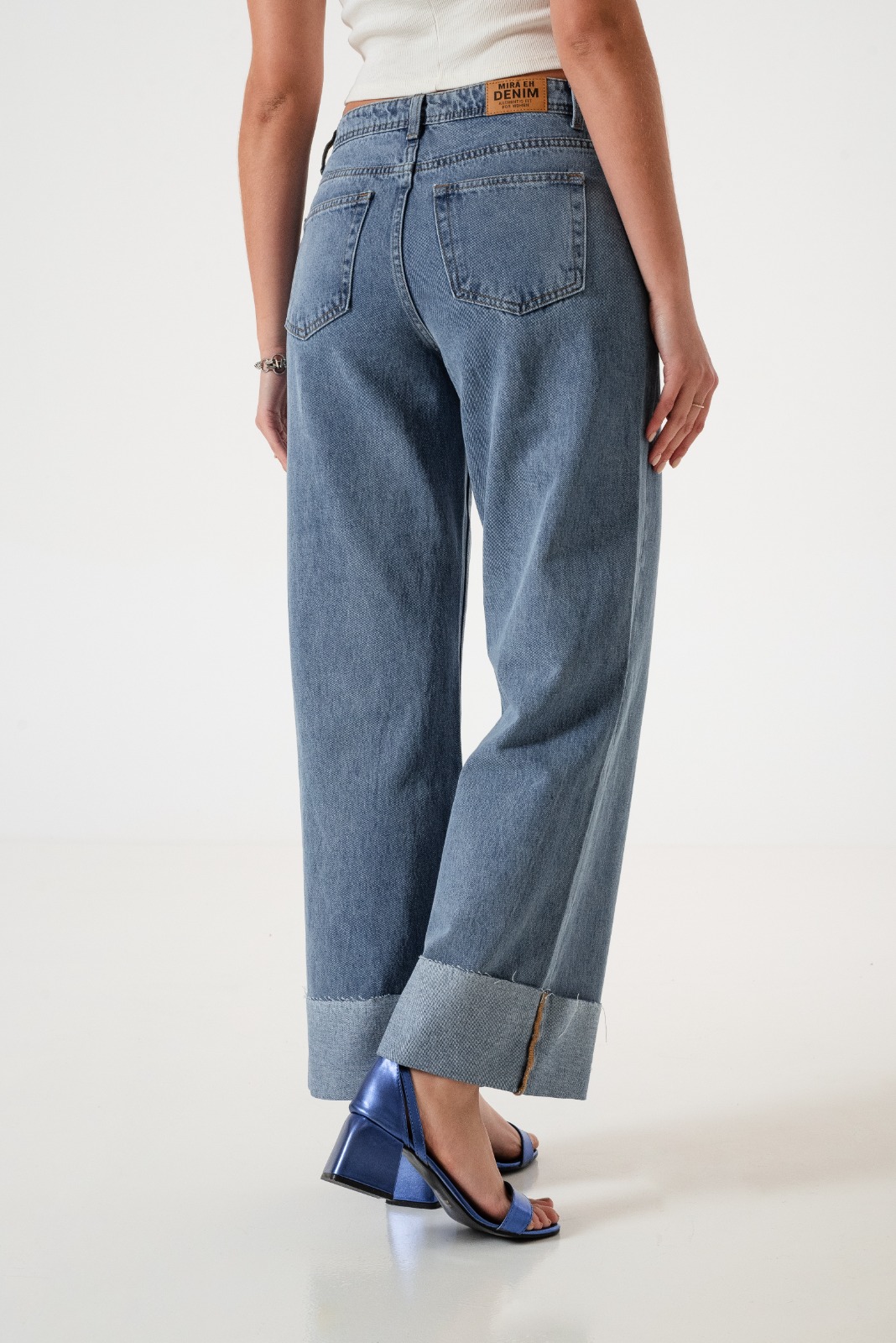 Vaquero estilo wid leg confeccionado en tela de jean con detalle de botamanga marcada, bolsillos, pasacinto, cierre y boton