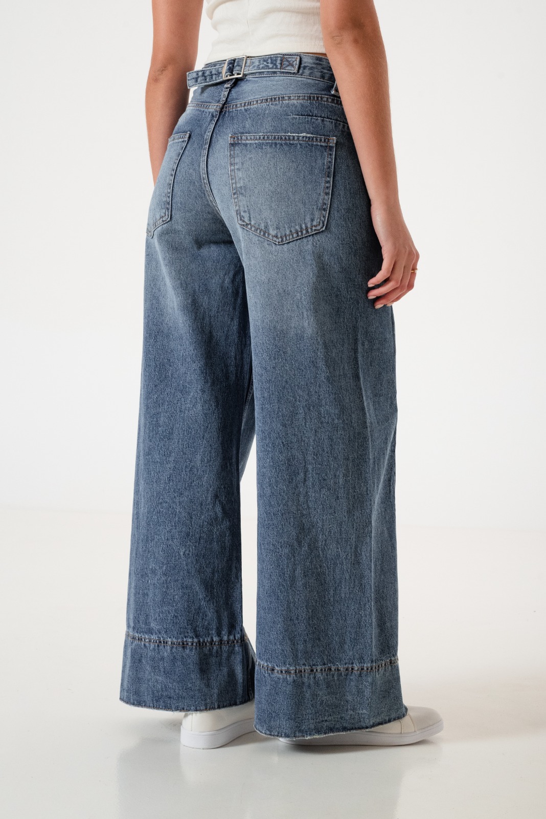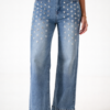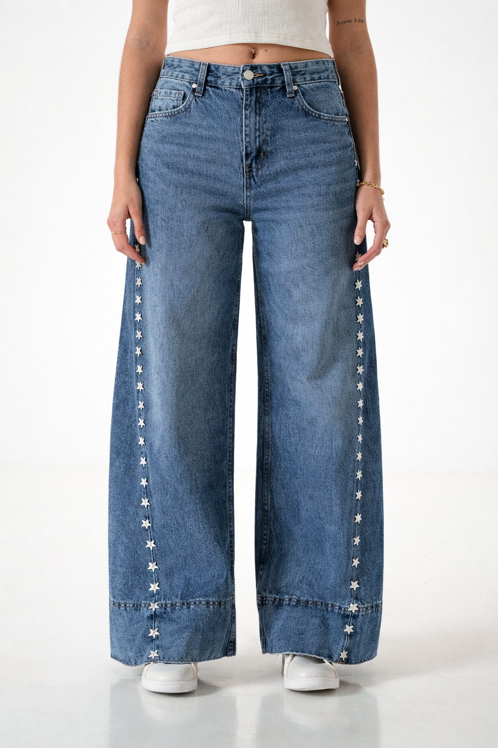Jean estilo wid leg con detalle de tachas con formas de estrellas en su parte delantera