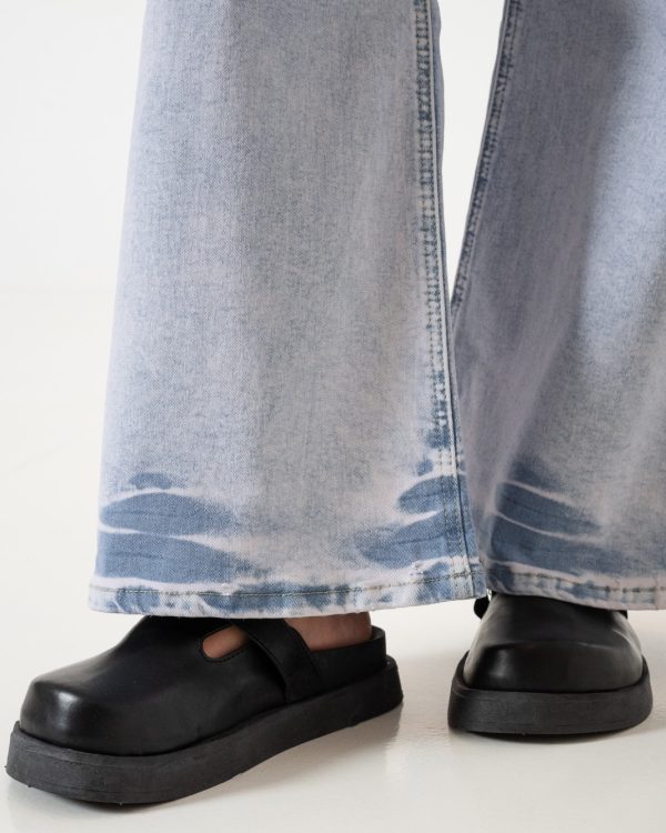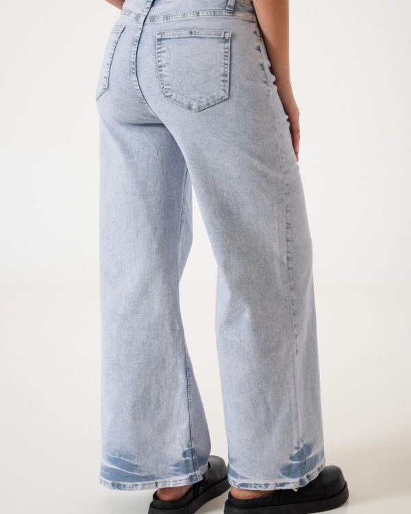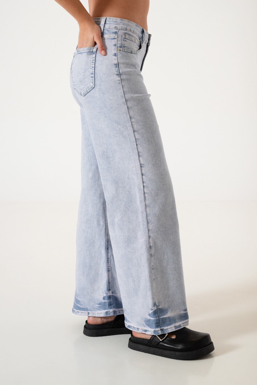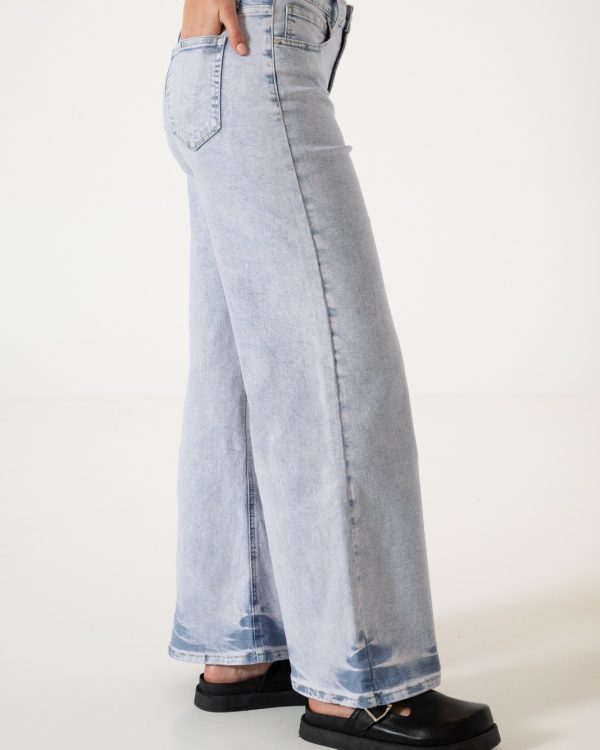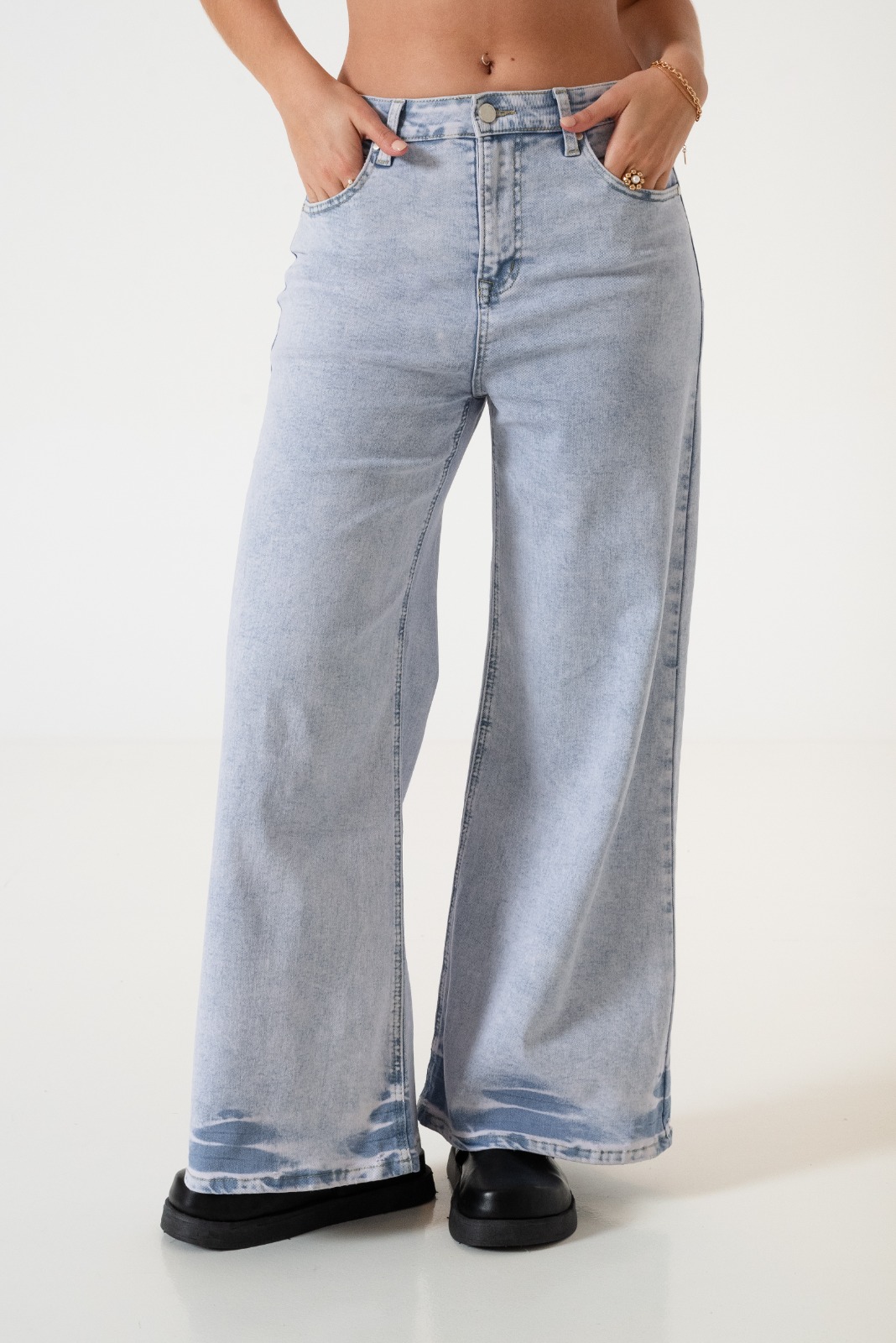 Vaquero estilo wid leg confeccionado en tela de jean con detalle de bolsillos, pasascinto, cierre y boton