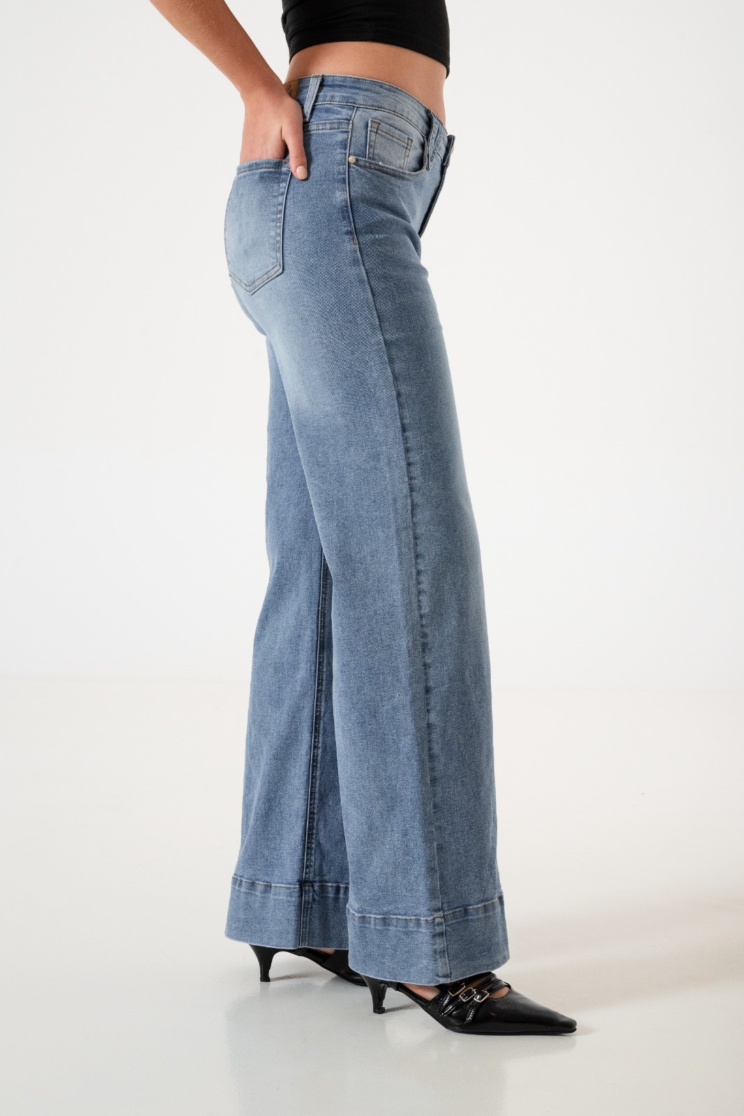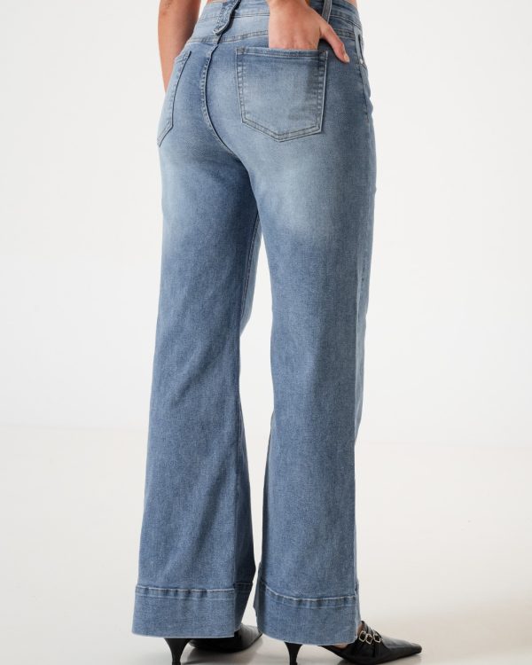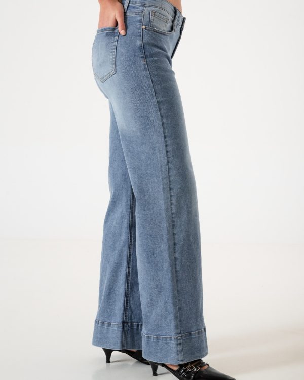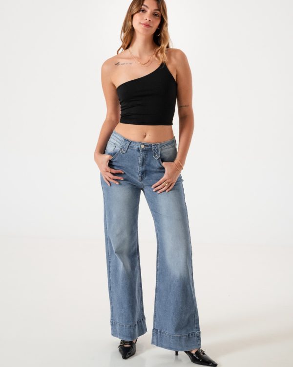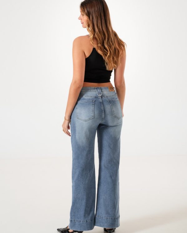Vaquero estilo wid leg confeccionado en tela de jean con detalle de bolsillos, pasacinto, cierre y boton.