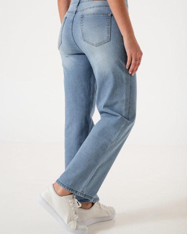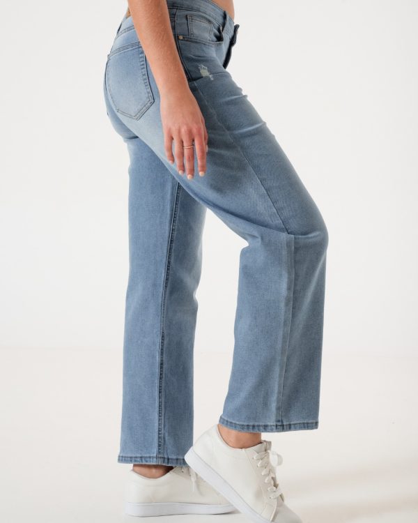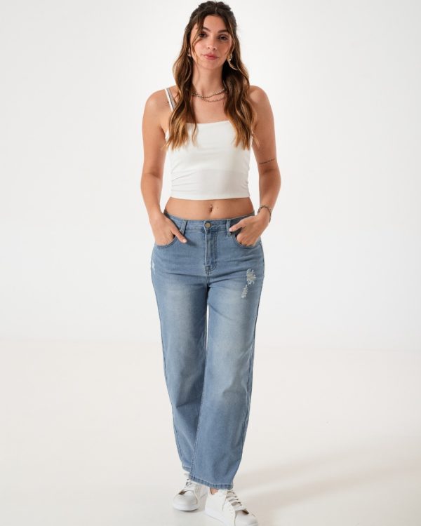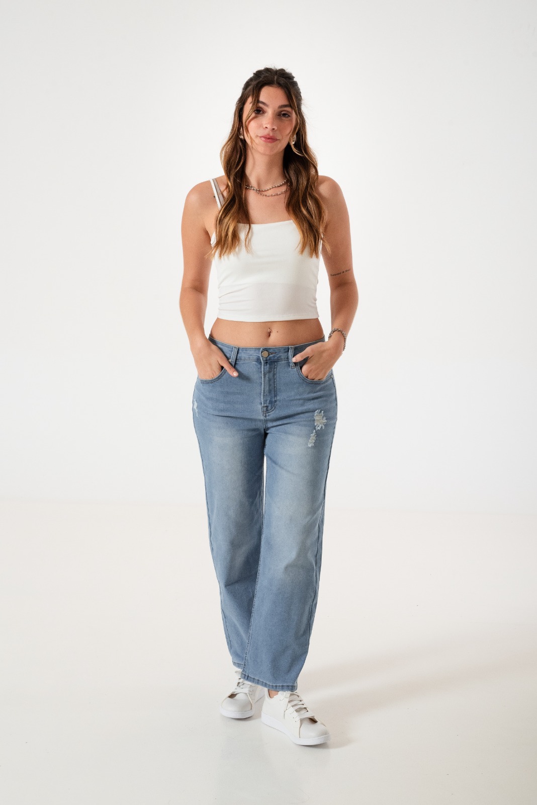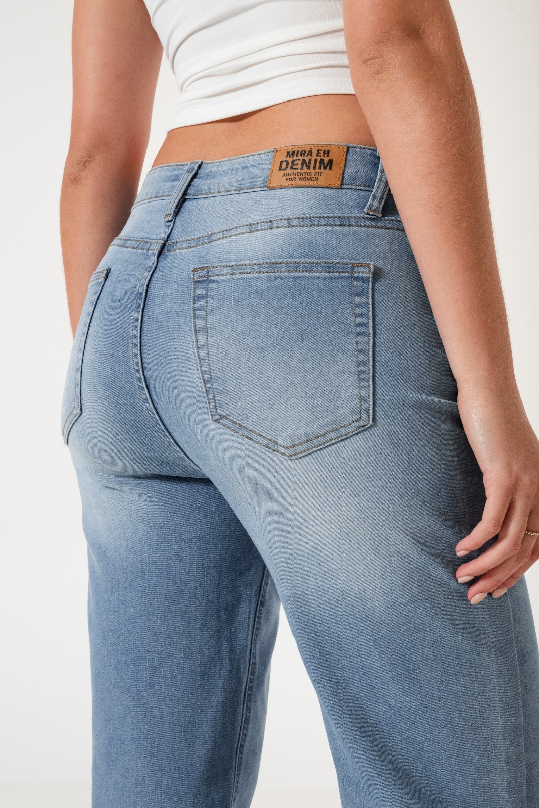 Vaquero estilo wid leg confeccionado en tela de jean con detalle de bolsillos, pasacinto, cierre y boton.
