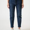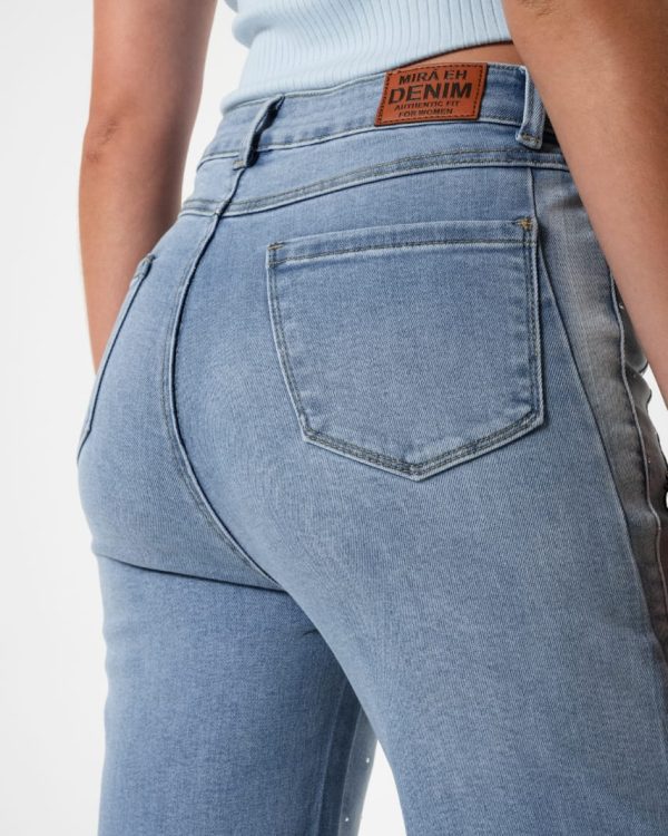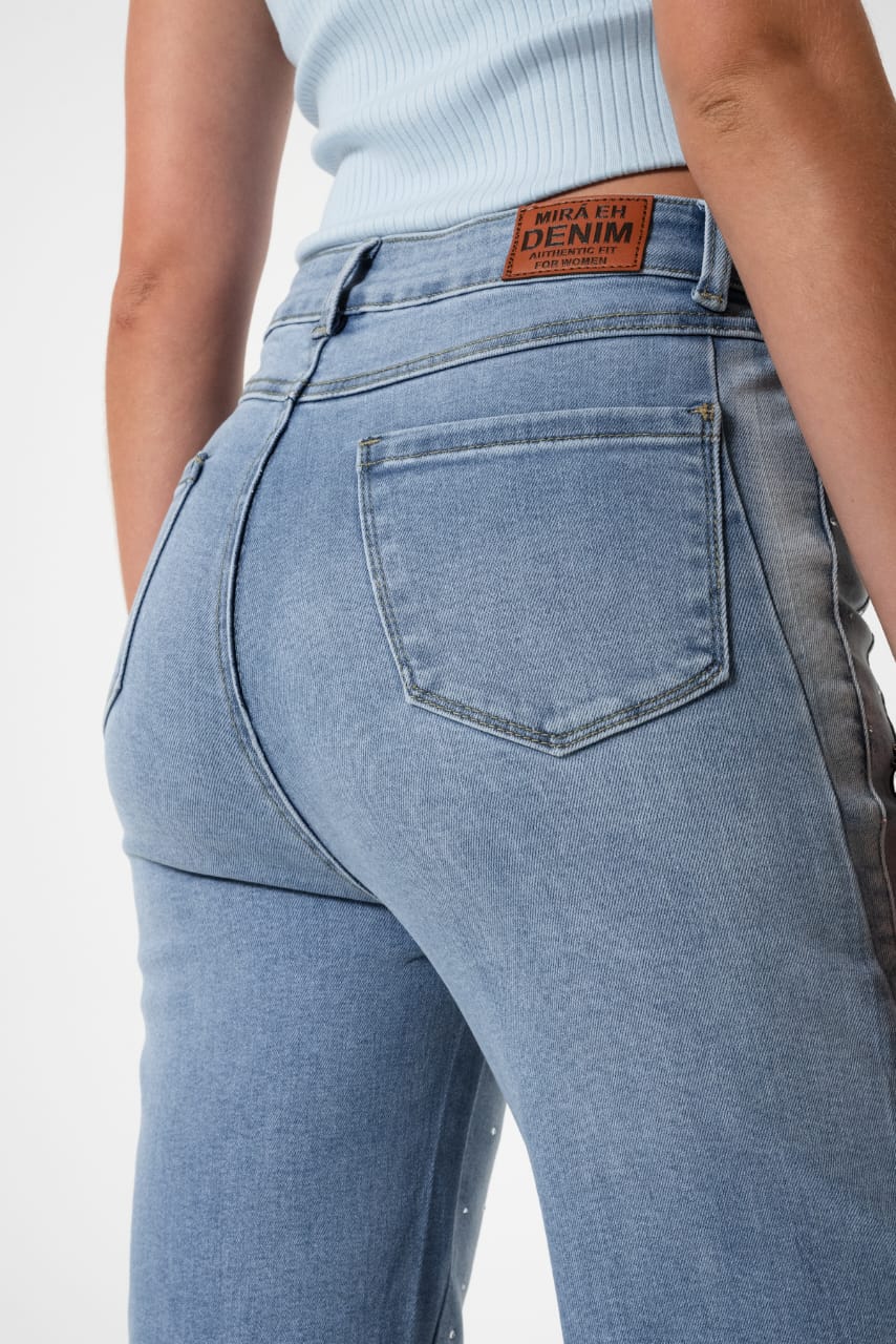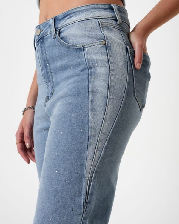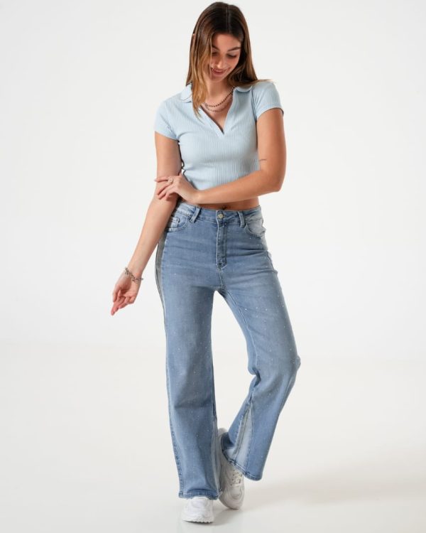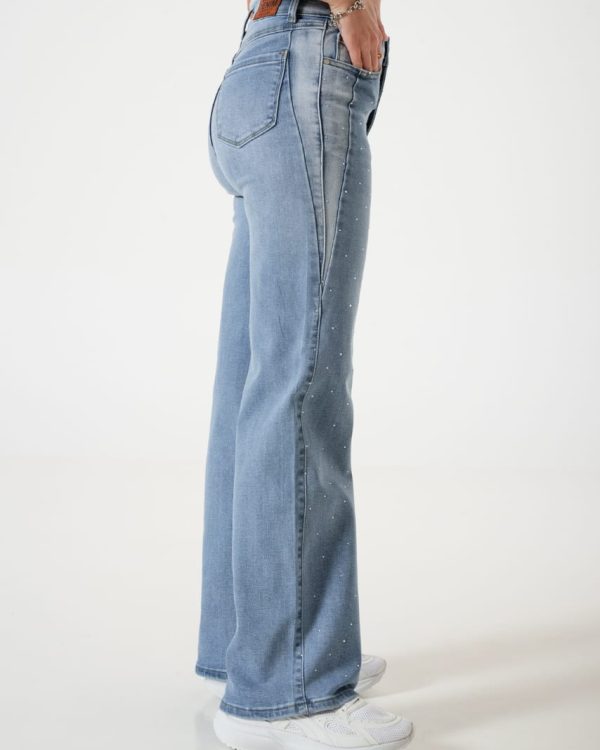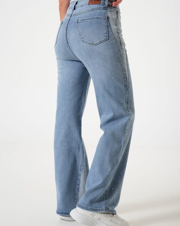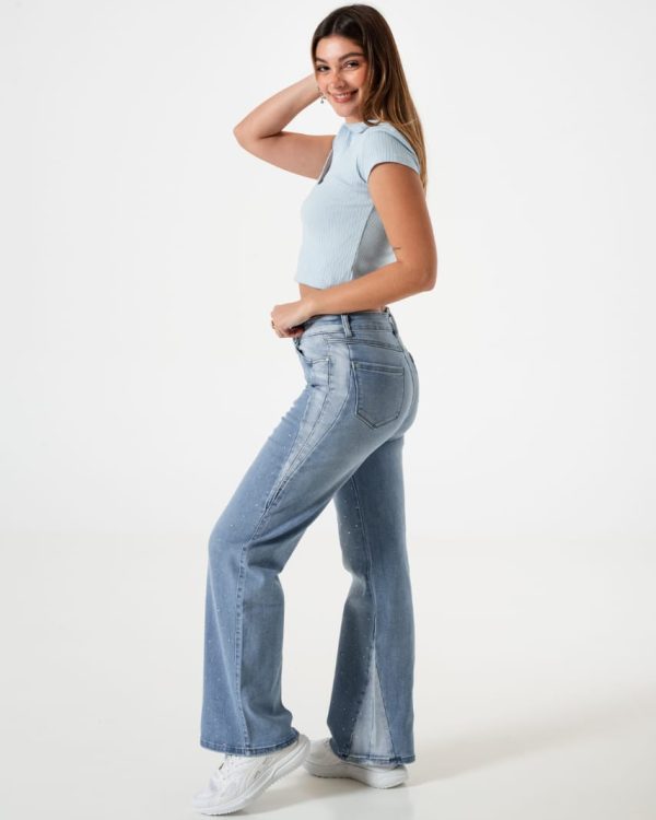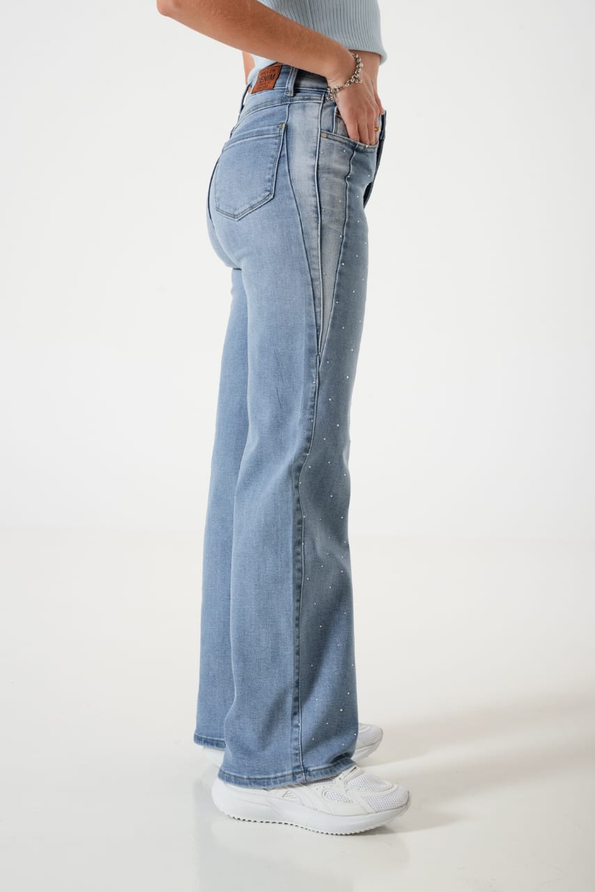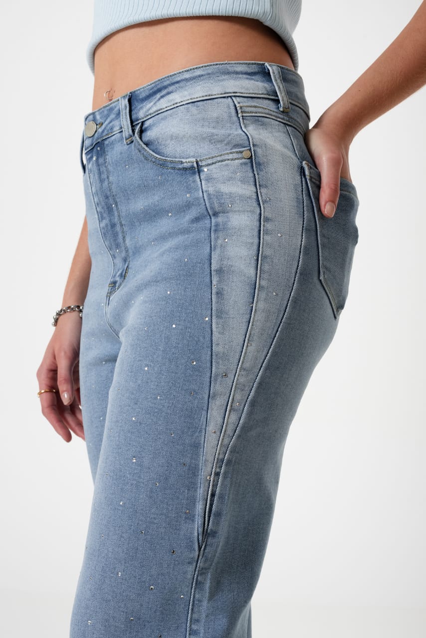 Vaquero estilo wid leg confeccionado en tela de jean con detalle de strass, bolsillos, pasacinto, cierre y boton.