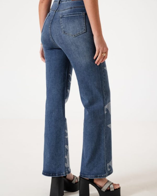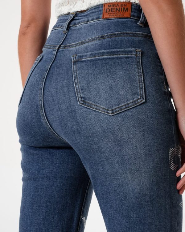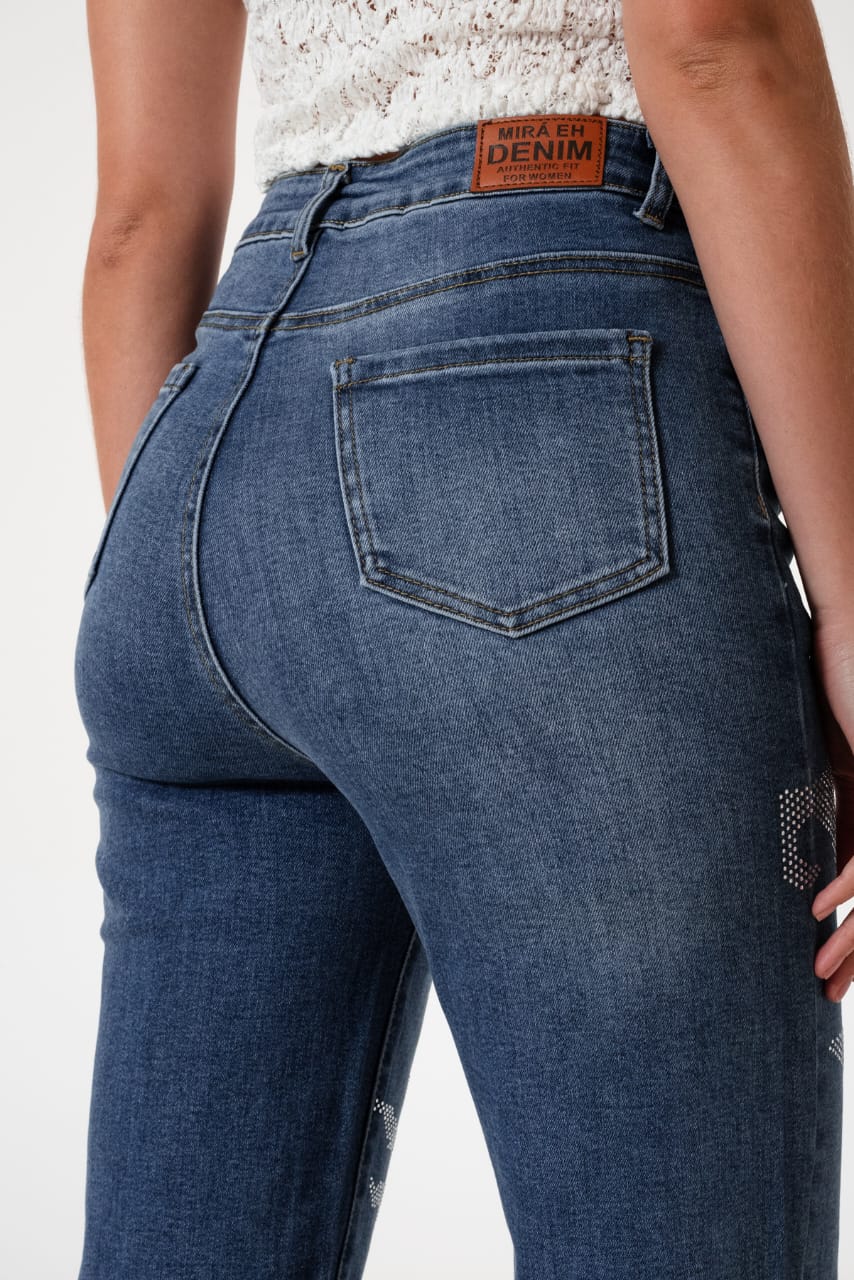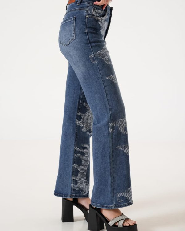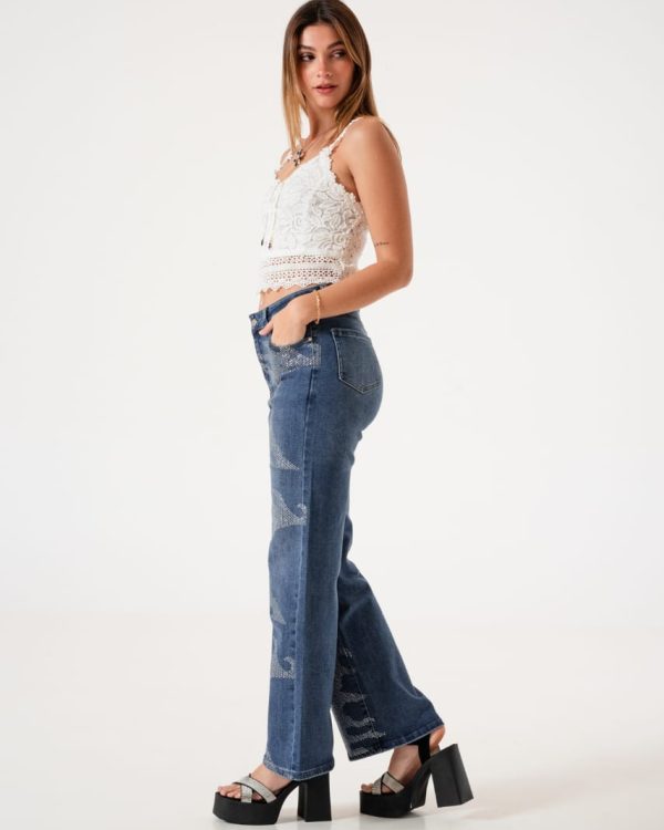 Vaquero estilo wid leg confeccionado en tela de jean con detalle de strass, bolsillos, pasacinto, cierre y boton.