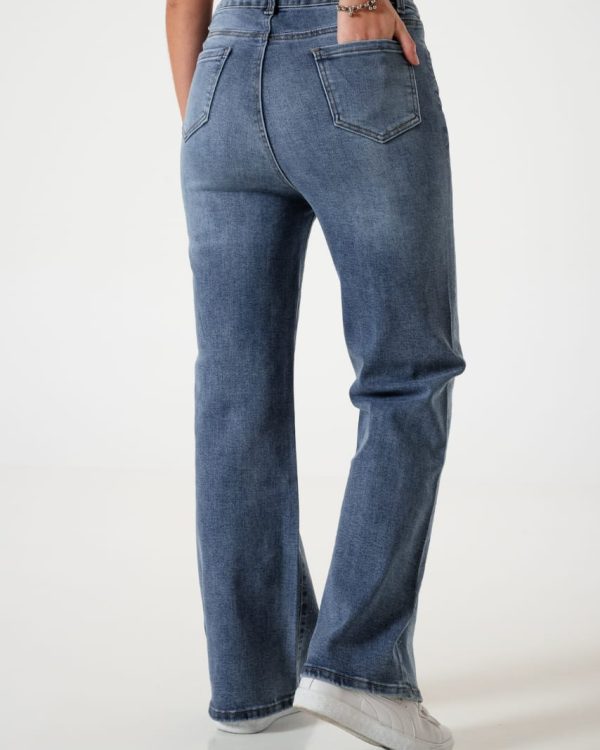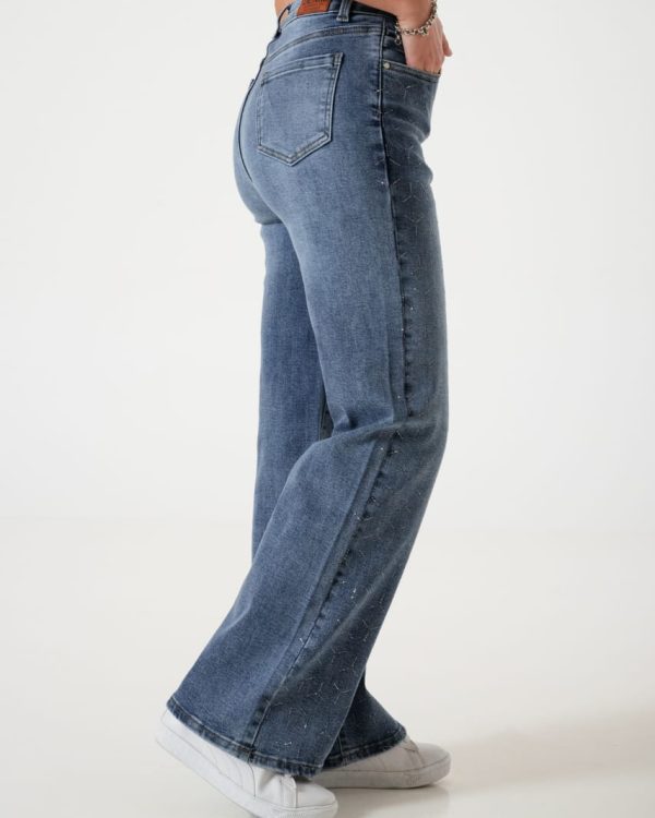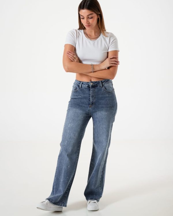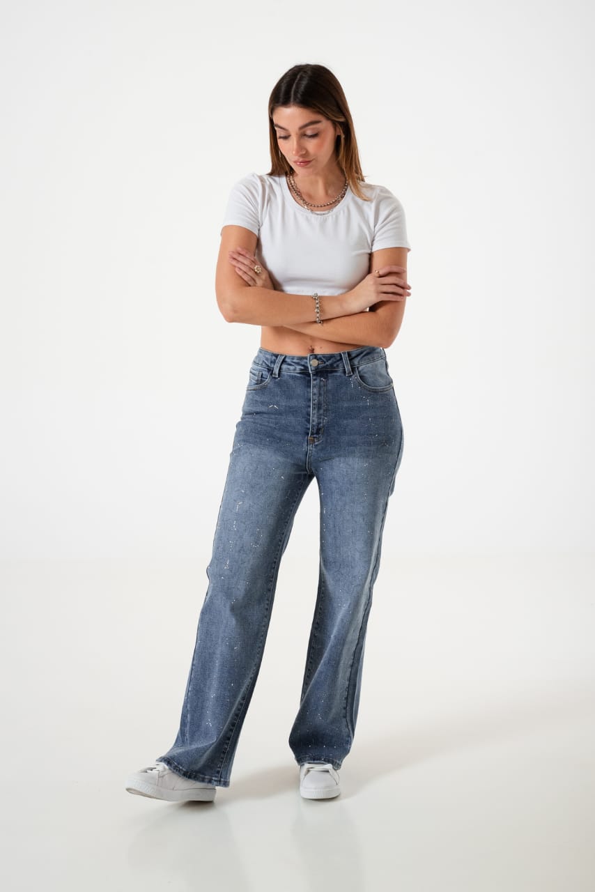 Vaquero estilo wid leg confeccionado en tela de jean con detalle de stass, bolsillos, pasacinto, cierre y boton.