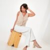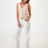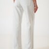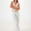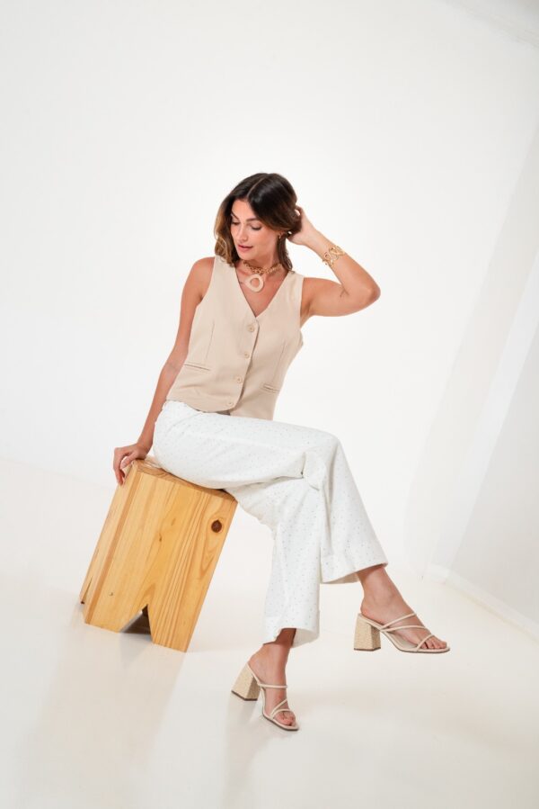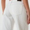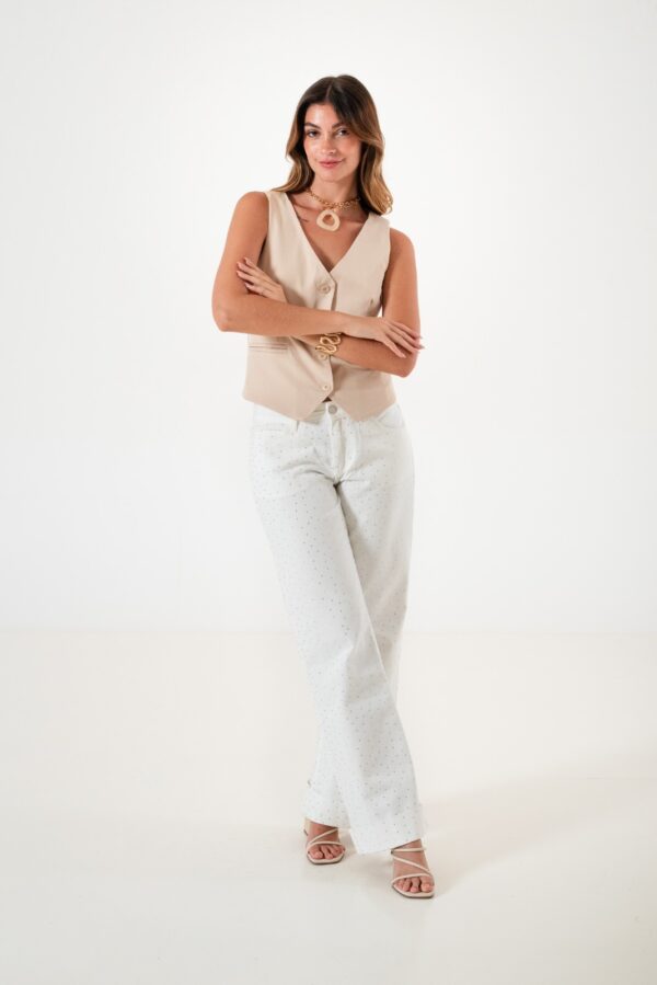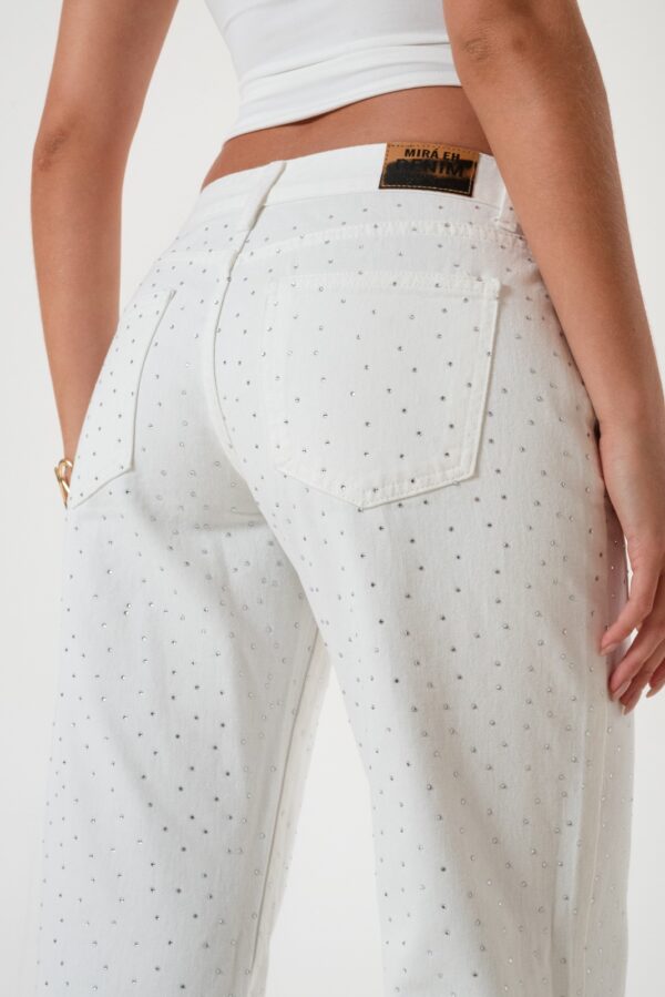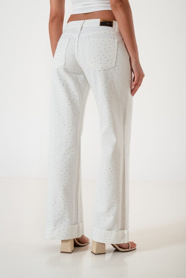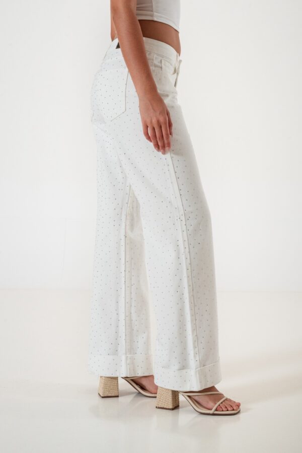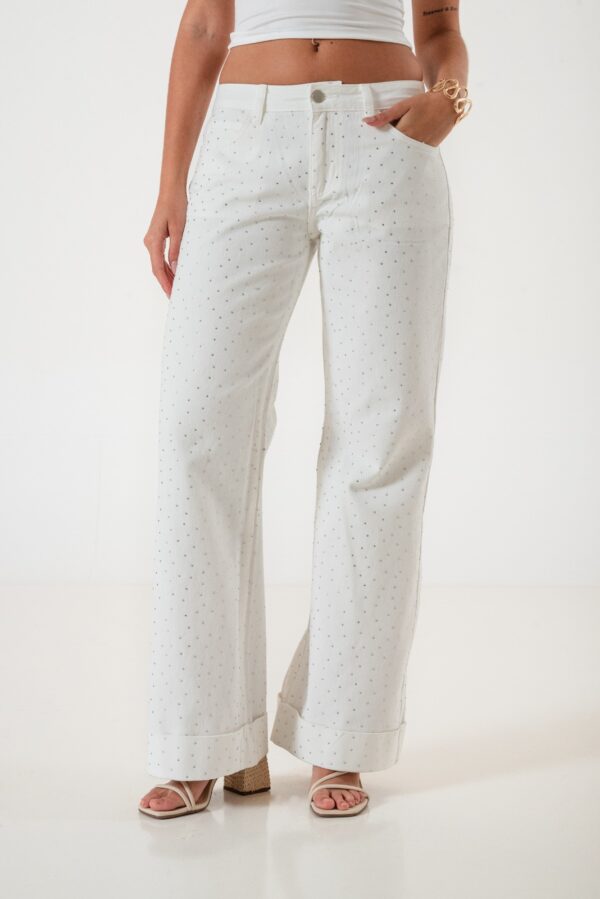 Vaquero estilo wid leg confeccionado en tela de jean con detalle de strass, botamanga, bolsillos, cierre y boton