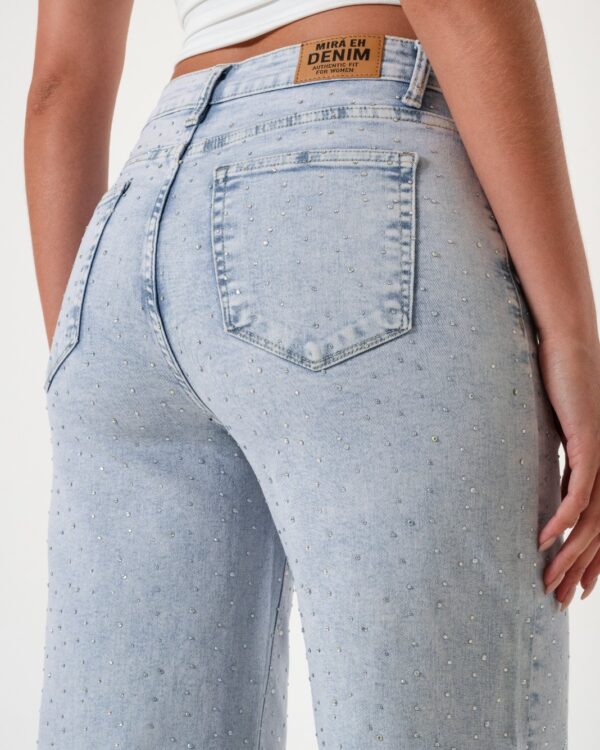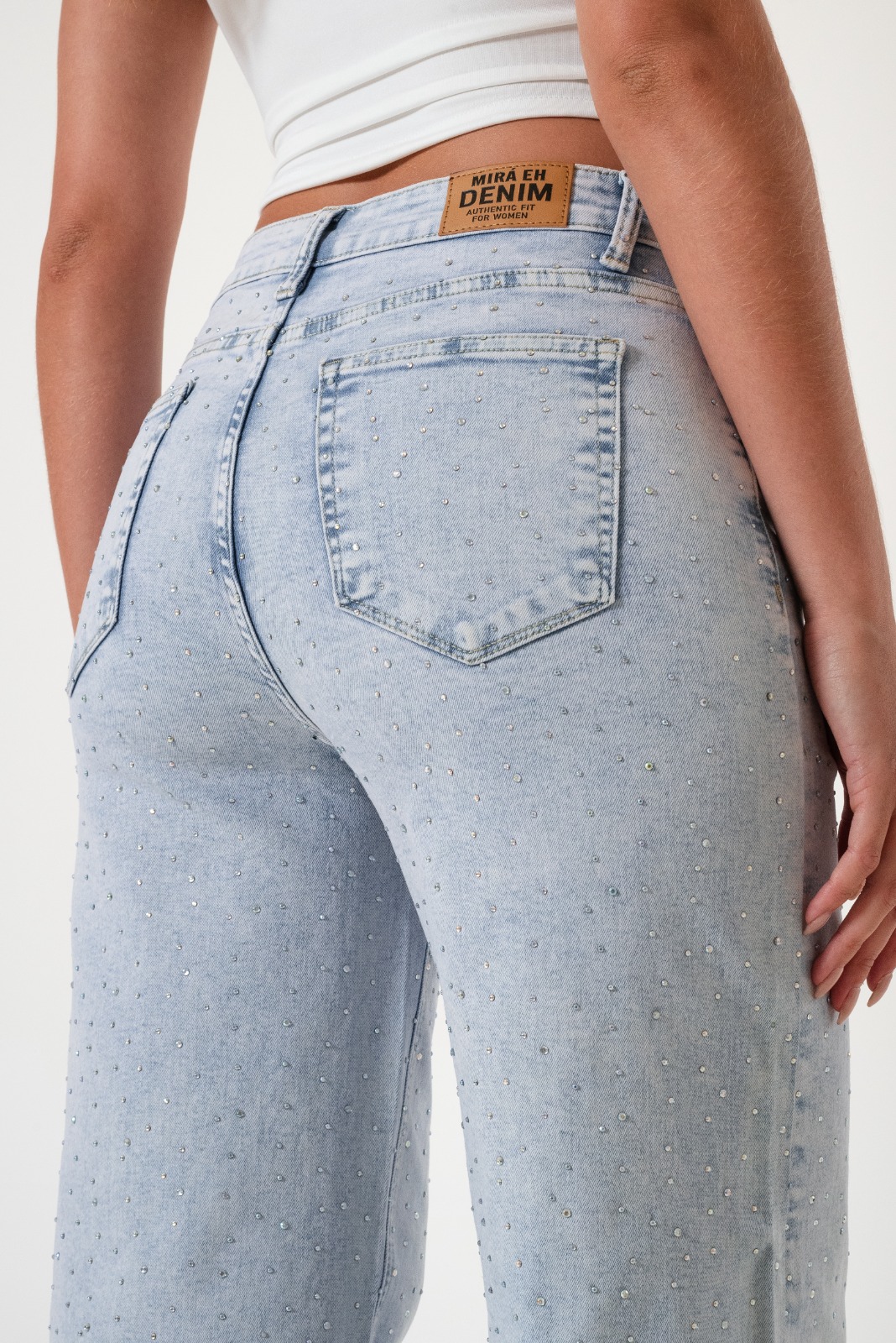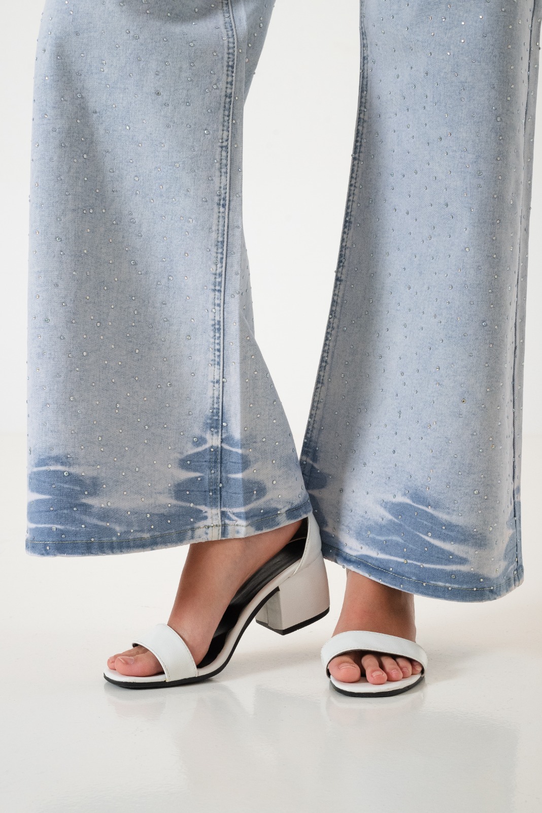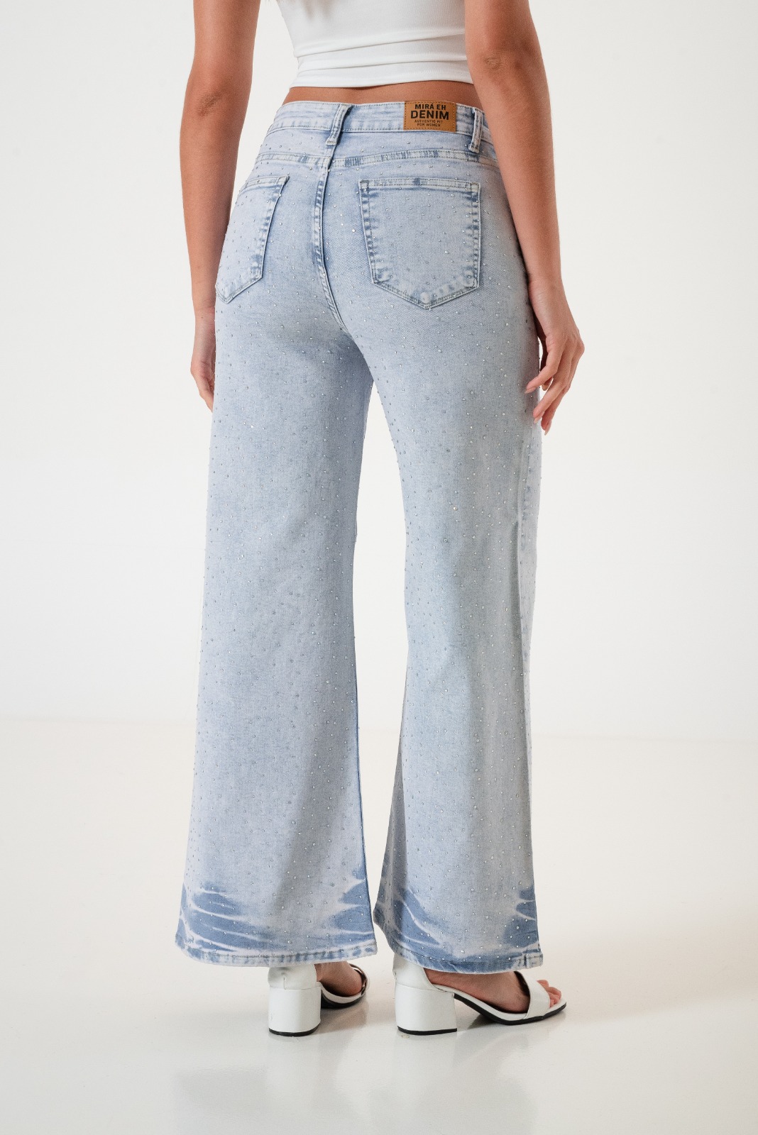 Vaquero estilo wid leg confeccionado en tela de jean con detalle de strass, bolsillos, pasacinto, cierre y boton