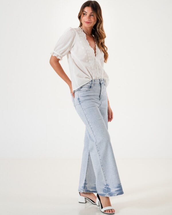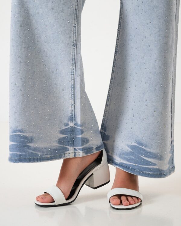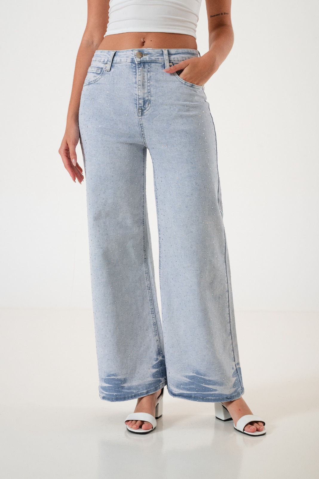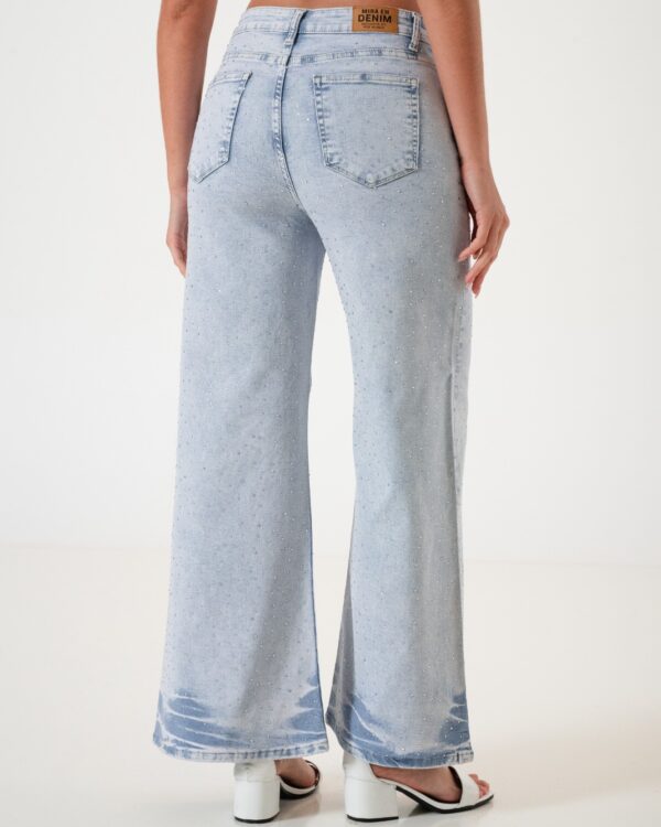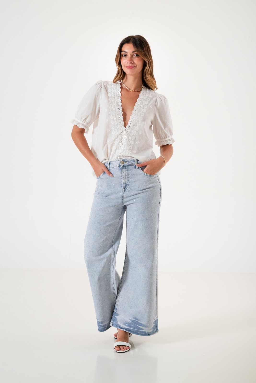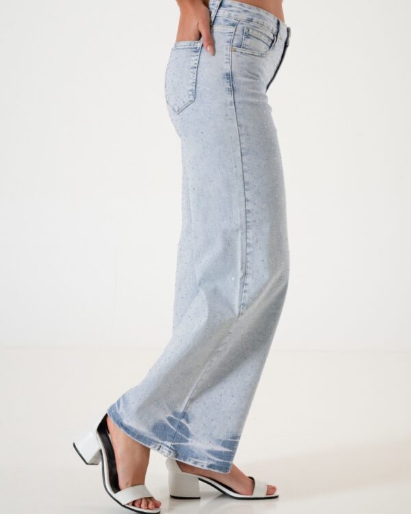 Vaquero estilo wid leg confeccionado en tela de jean con detalle de strass, bolsillos, pasacinto, cierre y boton