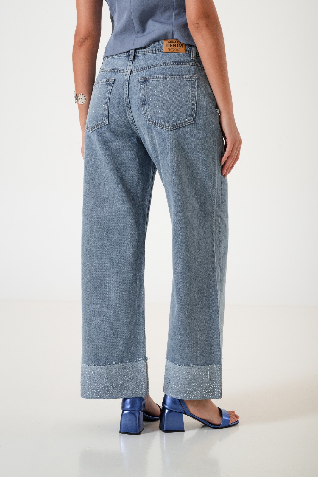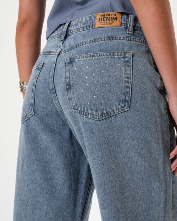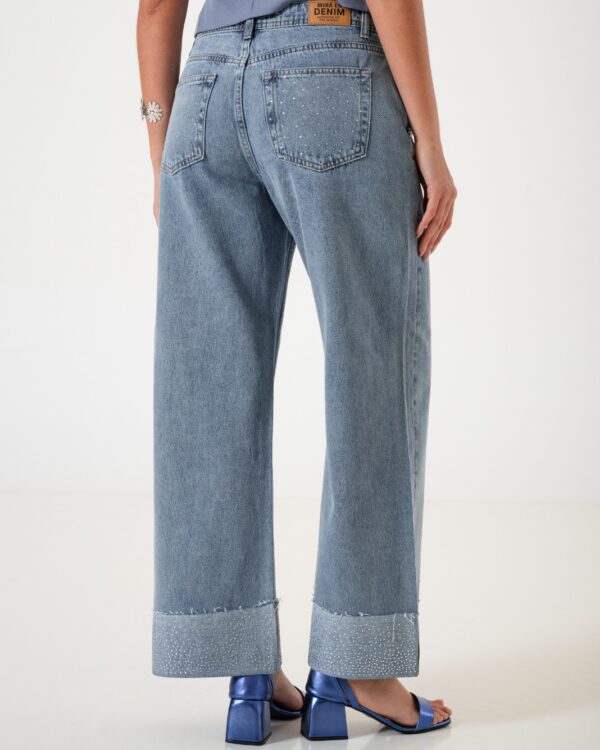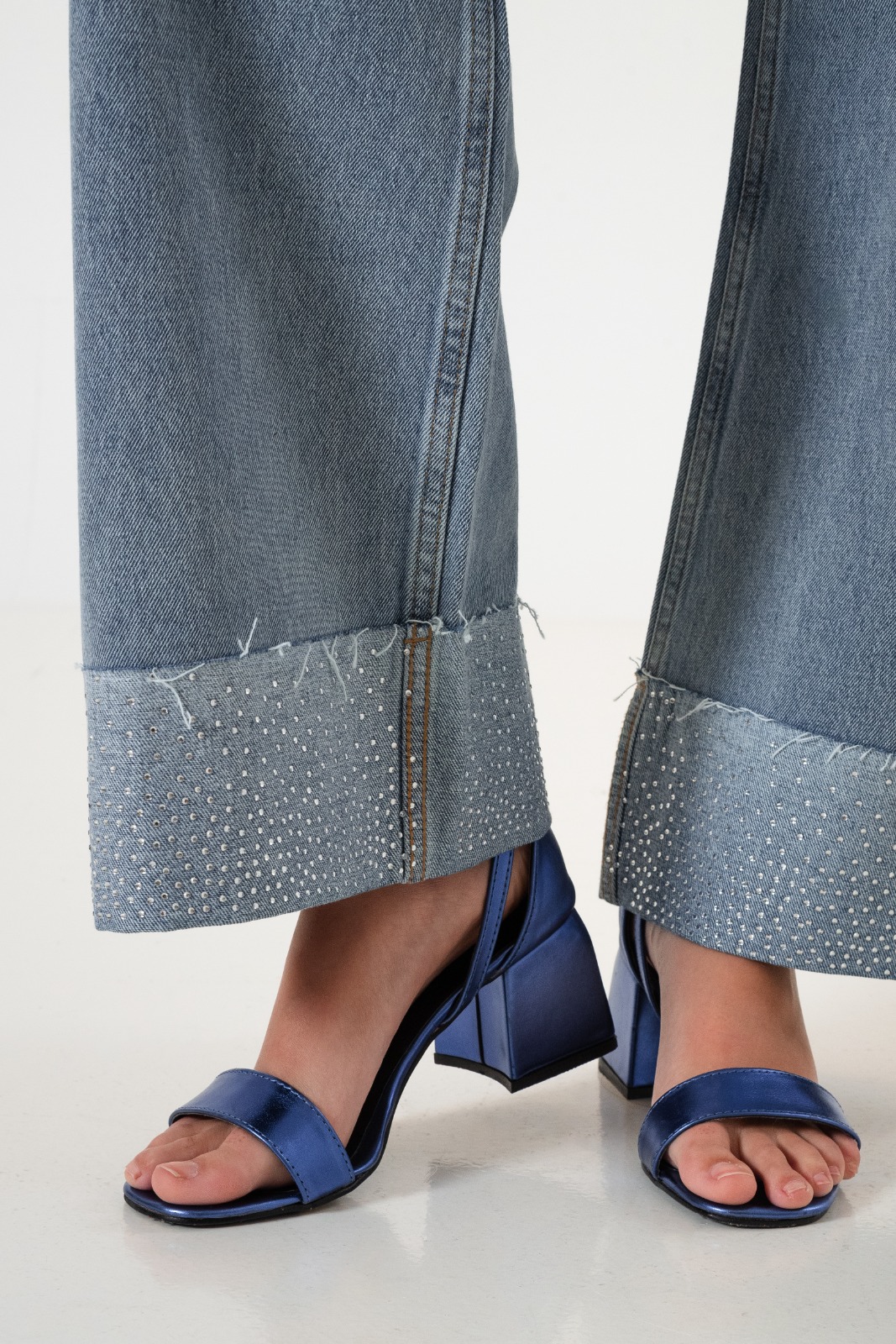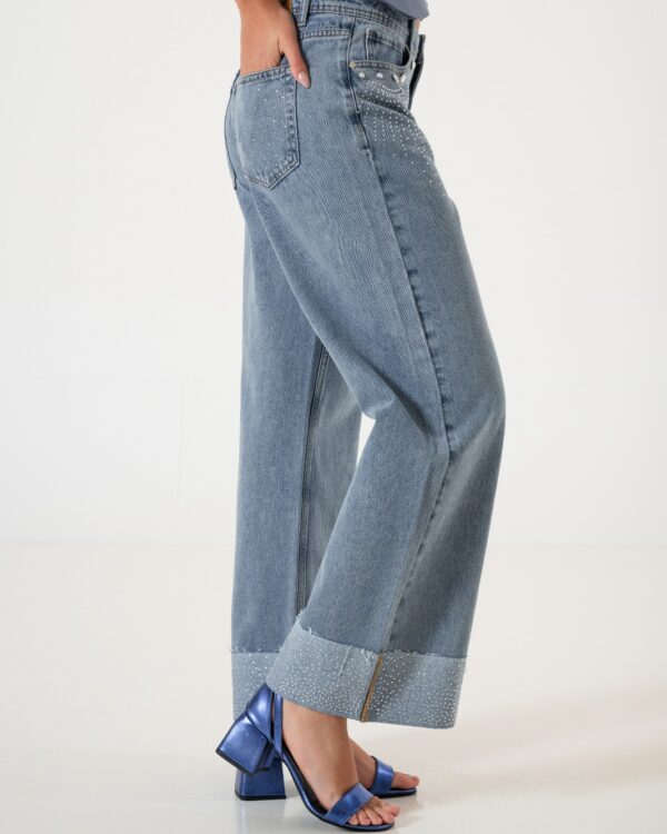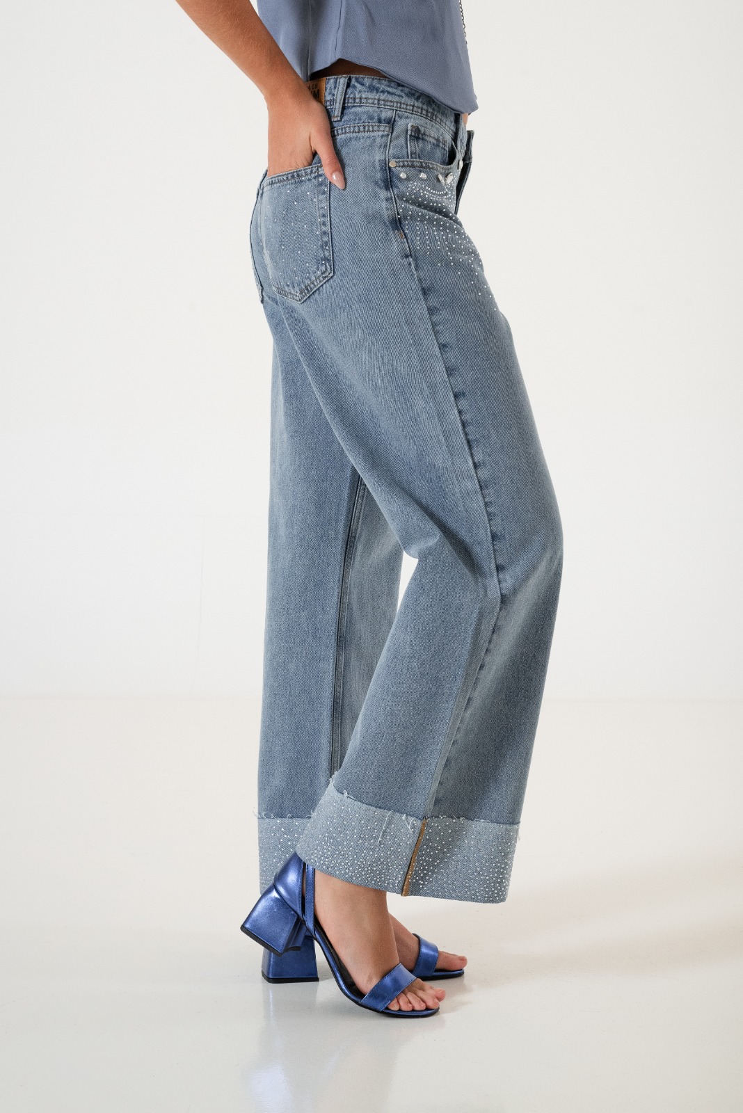 Vaquero estilo wid leg confeccionado en tela de jean con detalle de strass, botamanga, bolsillos, pasacinto, cierre y boton.
