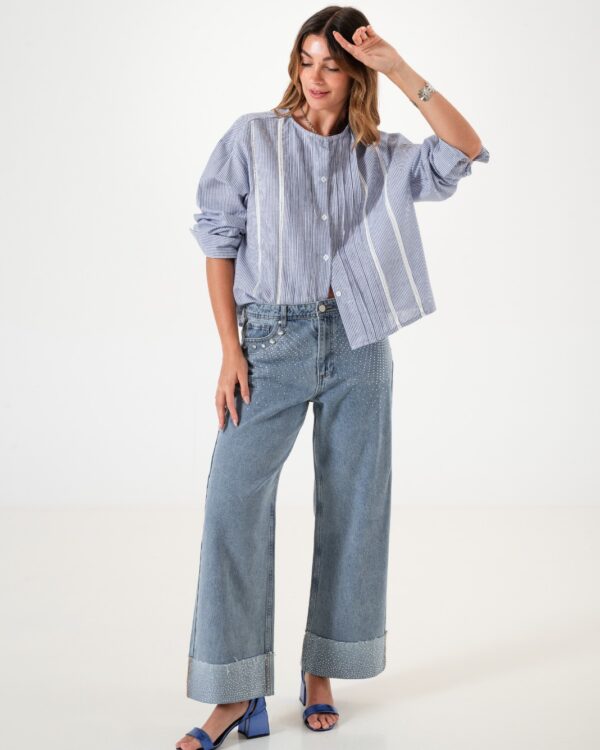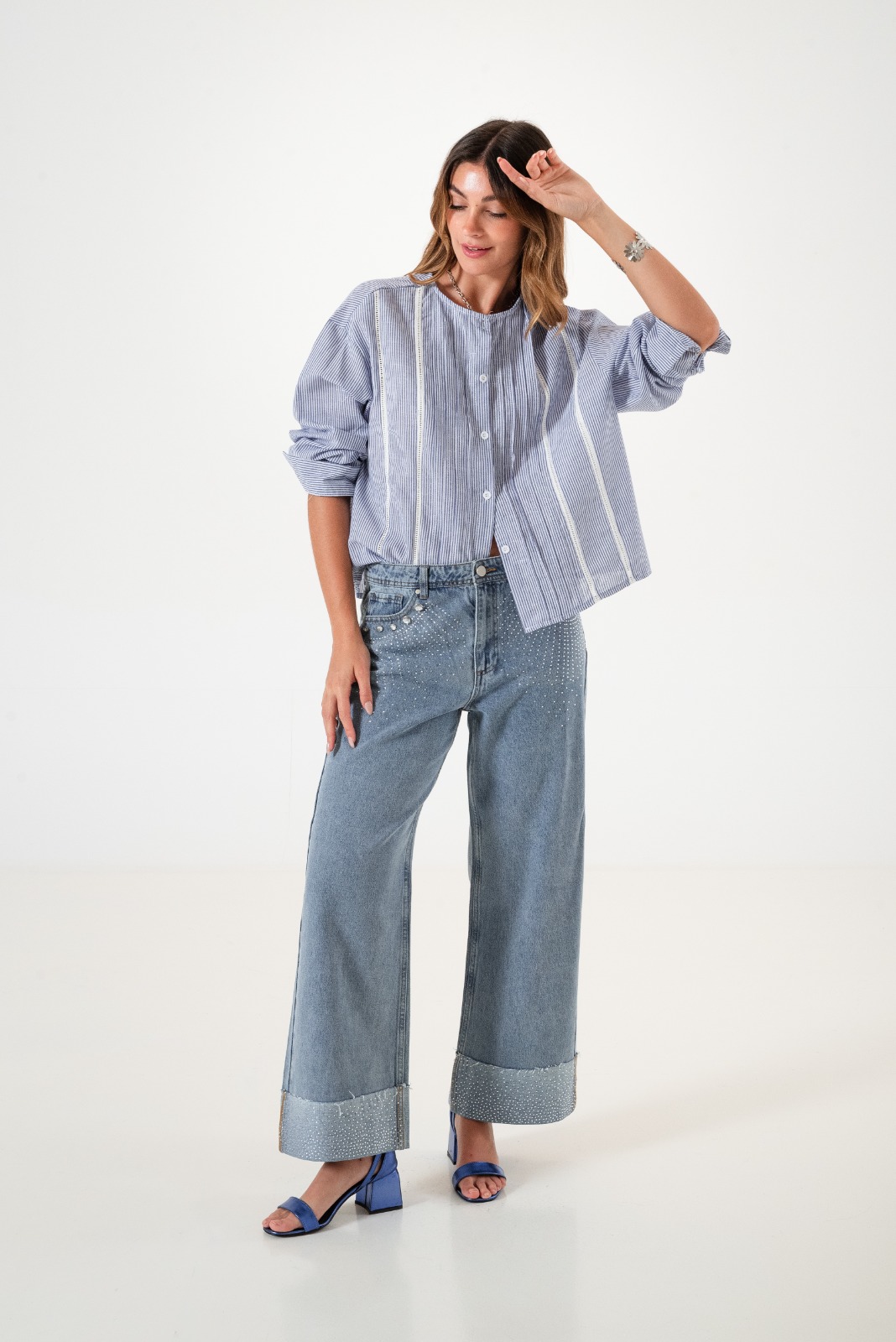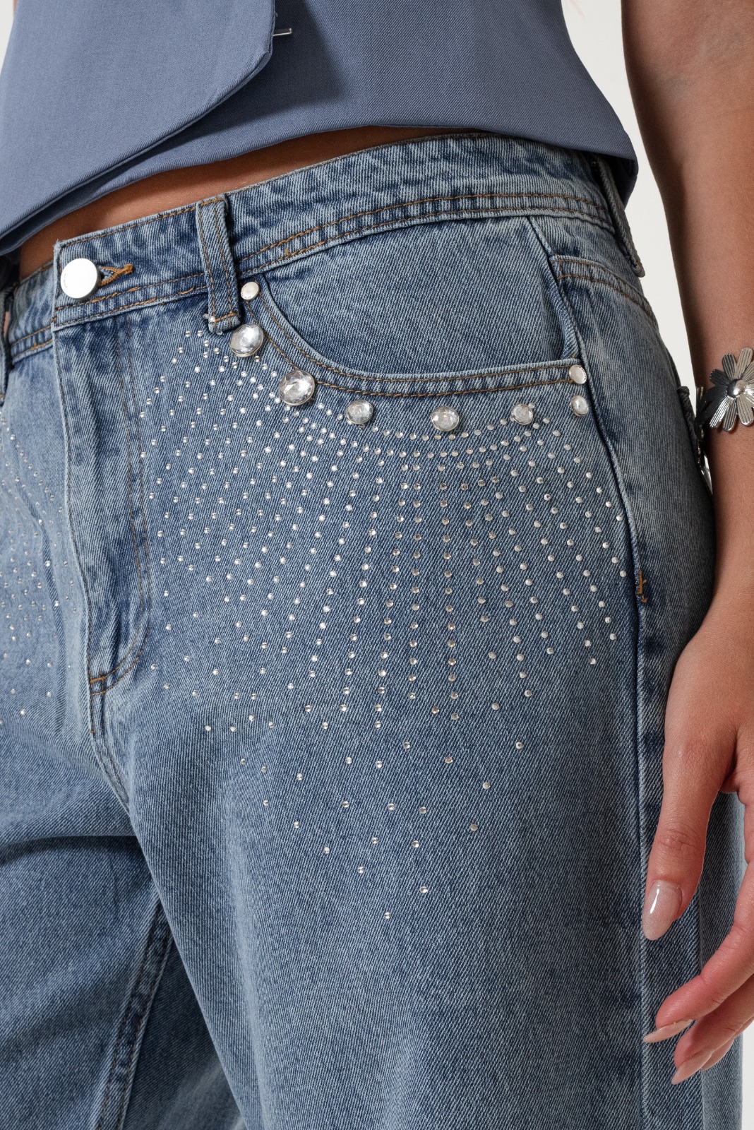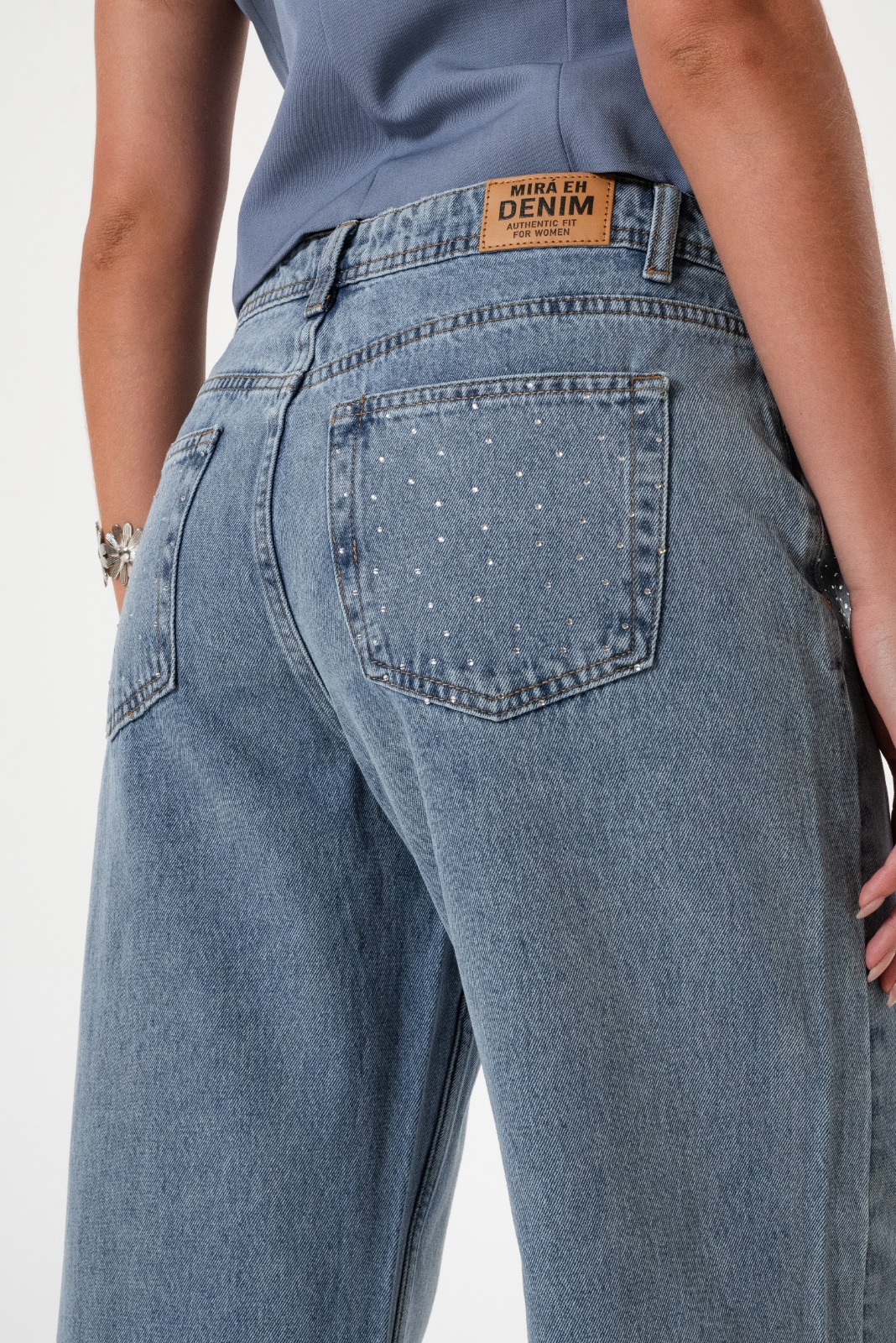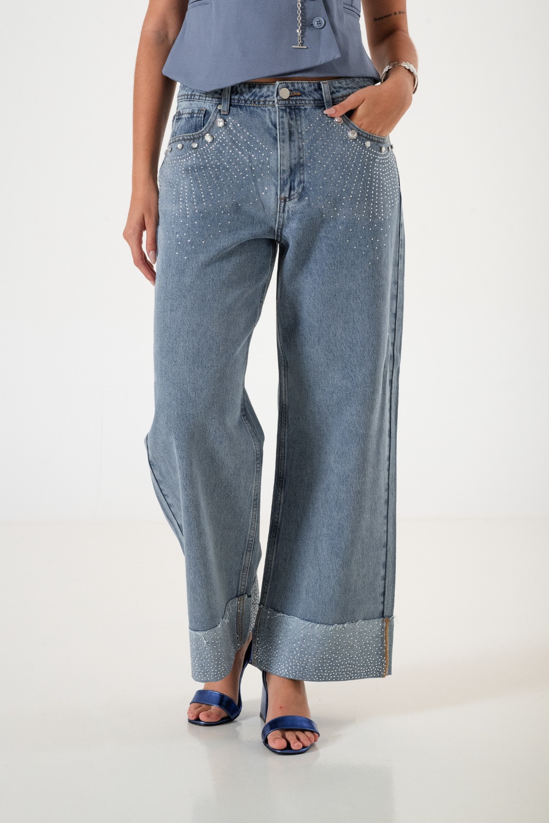Vaquero estilo wid leg confeccionado en tela de jean con detalle de strass, botamanga, bolsillos, pasacinto, cierre y boton.