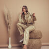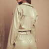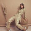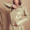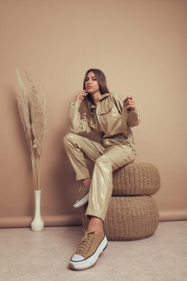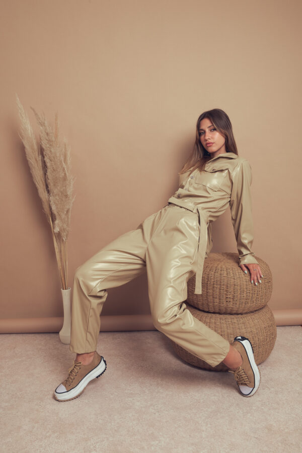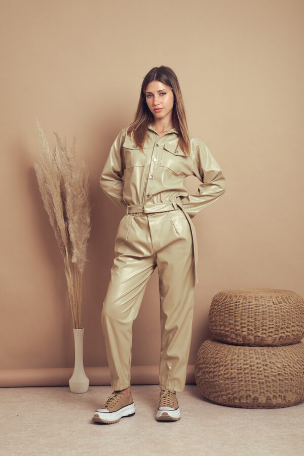 Mameluco confeccionado en tela de ecocuero con detalle de bolsillos, botones y cinturon.