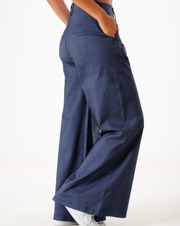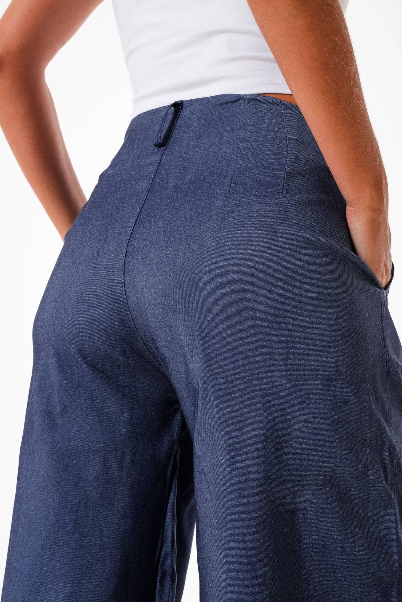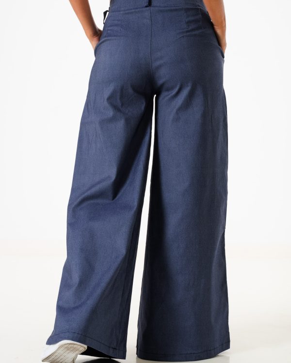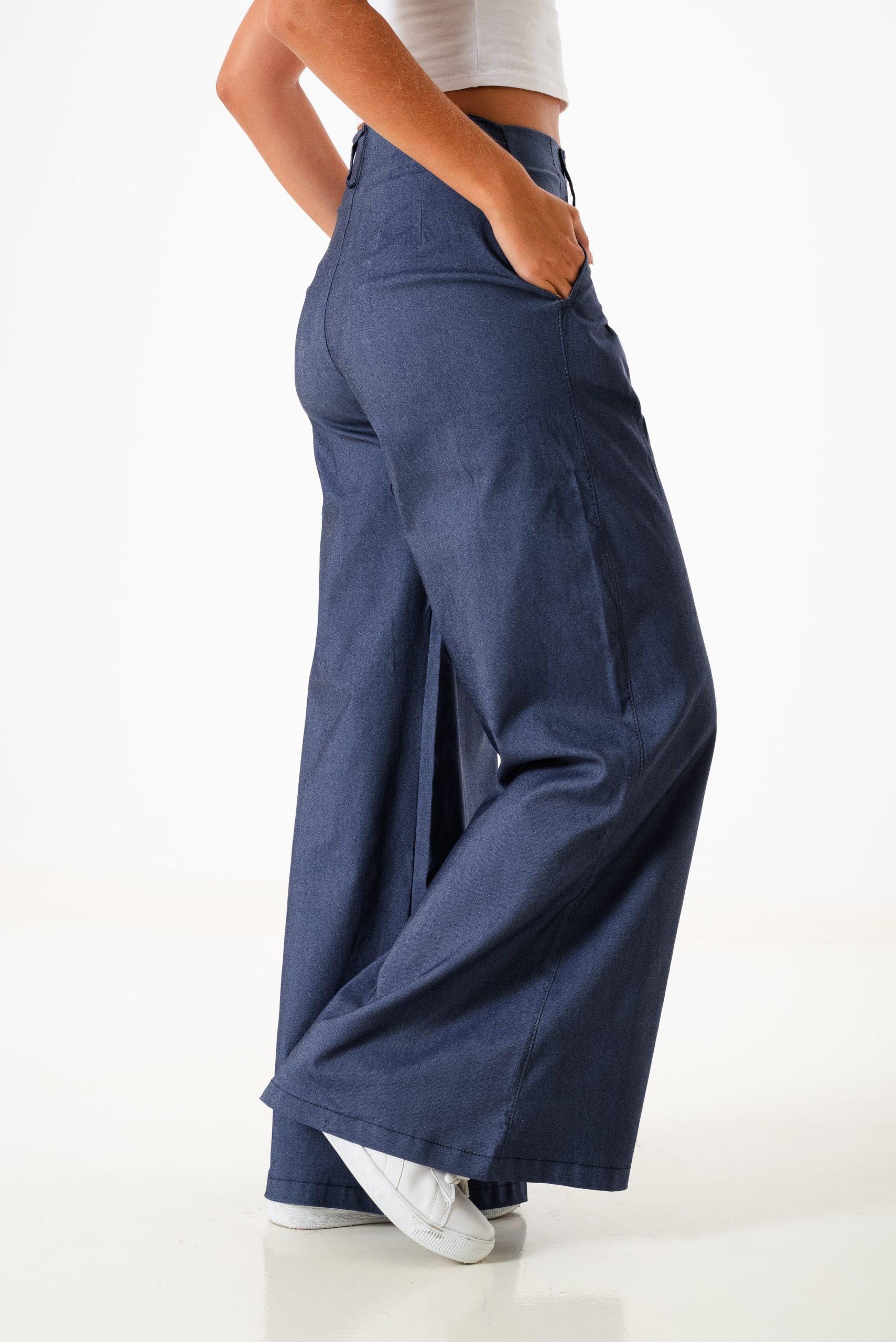Pantalon estilo maxi palazo confeccionado en tela de bengalina simil jean con detalle de cintura avispa, bolsillos, cierre y boton.