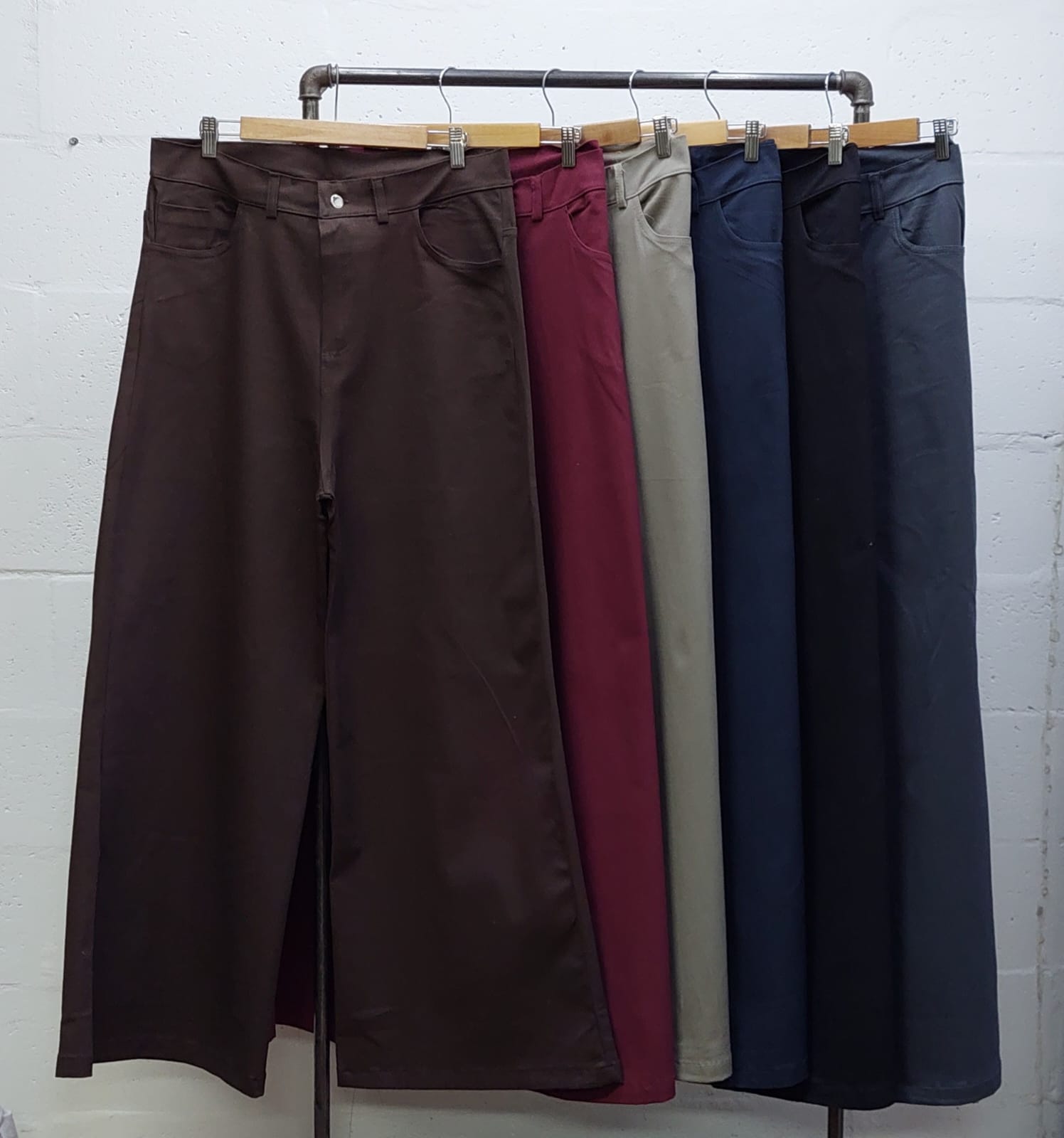 Pantalon estilo maxi palazo confeccionado en tela de gabardina con detalle de bolsillos, pasacinto, cierre y boton.
