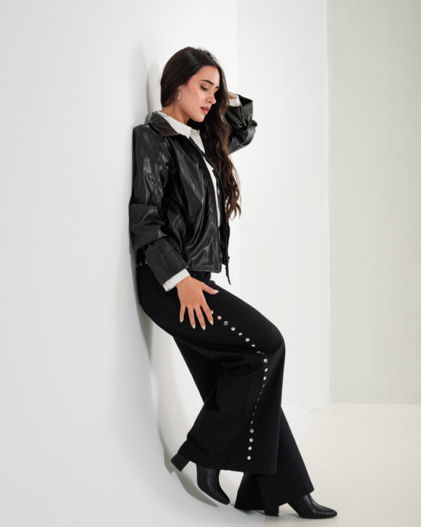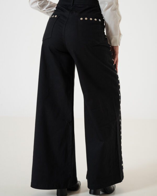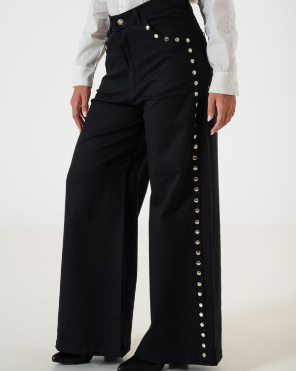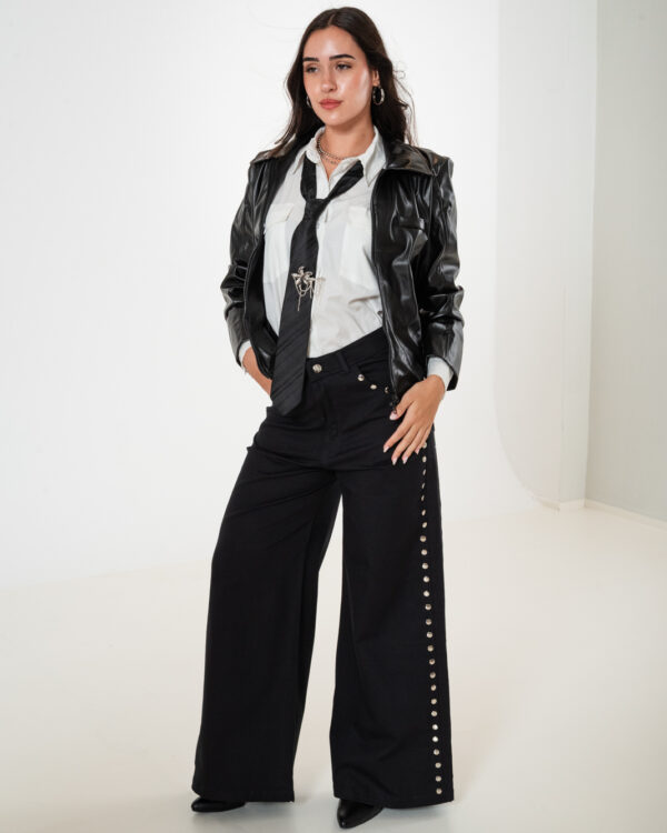 Pantalon estilo maxi erika confeccionado en tela de gabardina con detalle de tachas, bolsillos, pasacinto, cierre y boton.