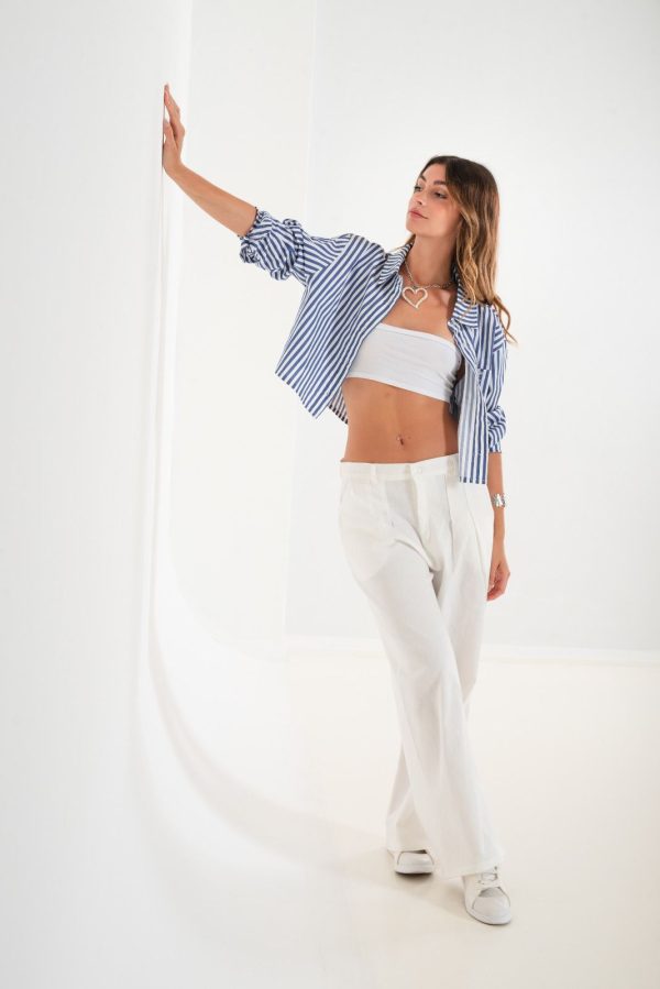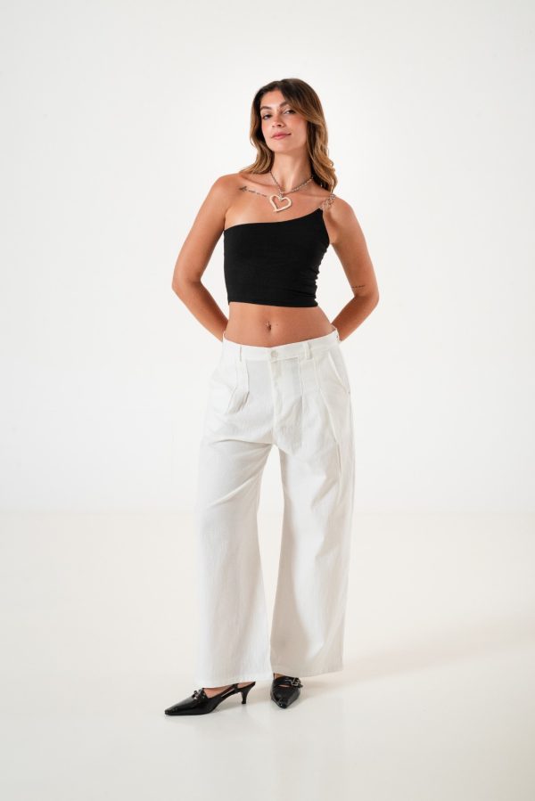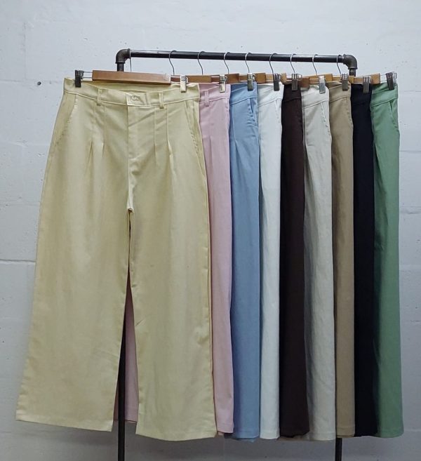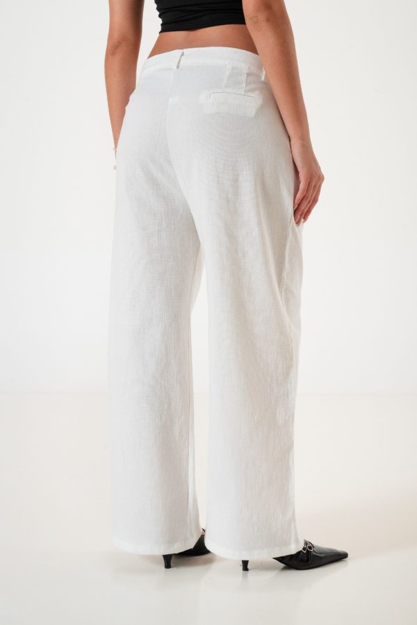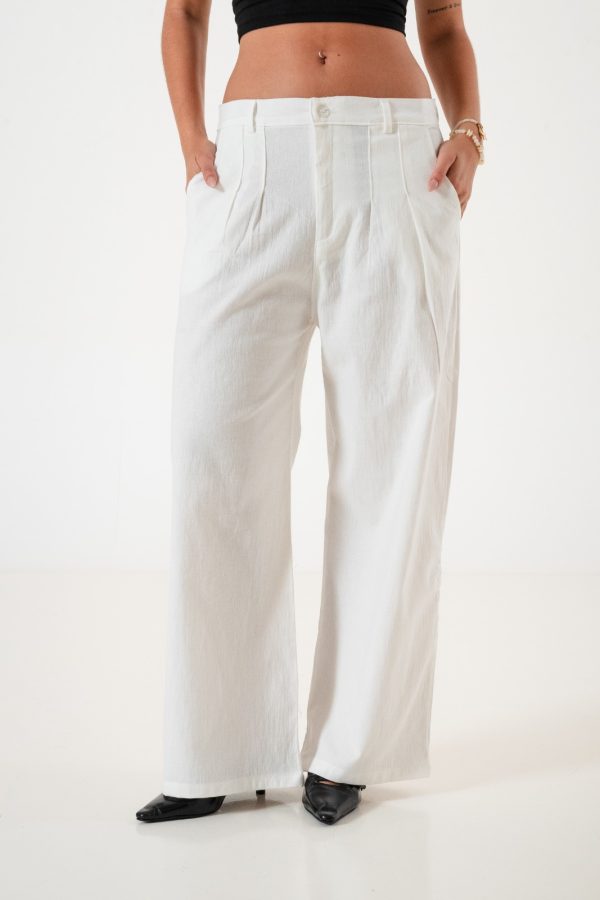 Pantalon estilo maxi palazo 40 confeccionado en tela de lino con detalle de pinzaz delanteras, bolsillos, pasacinto, cierre y boton.