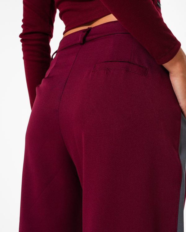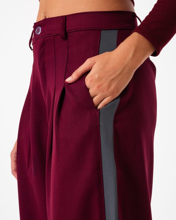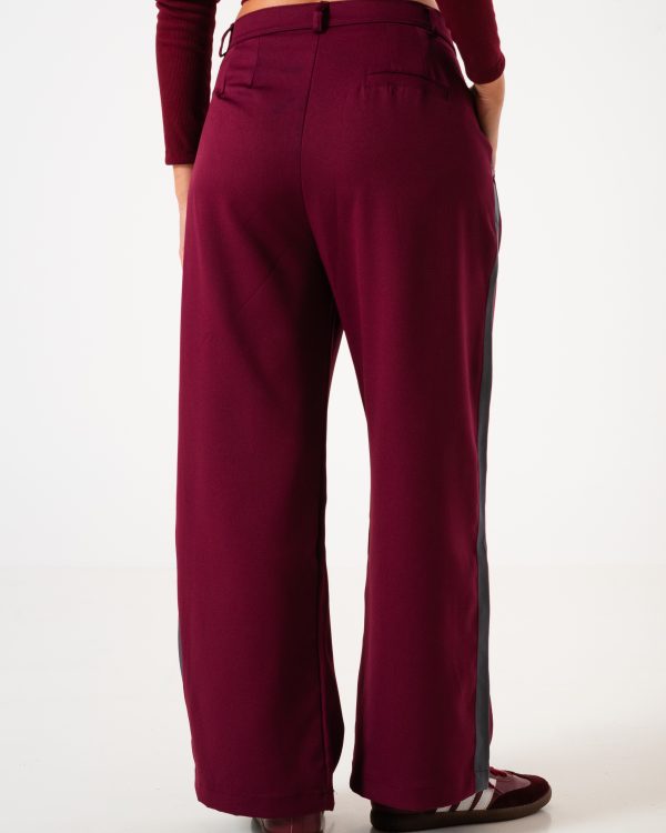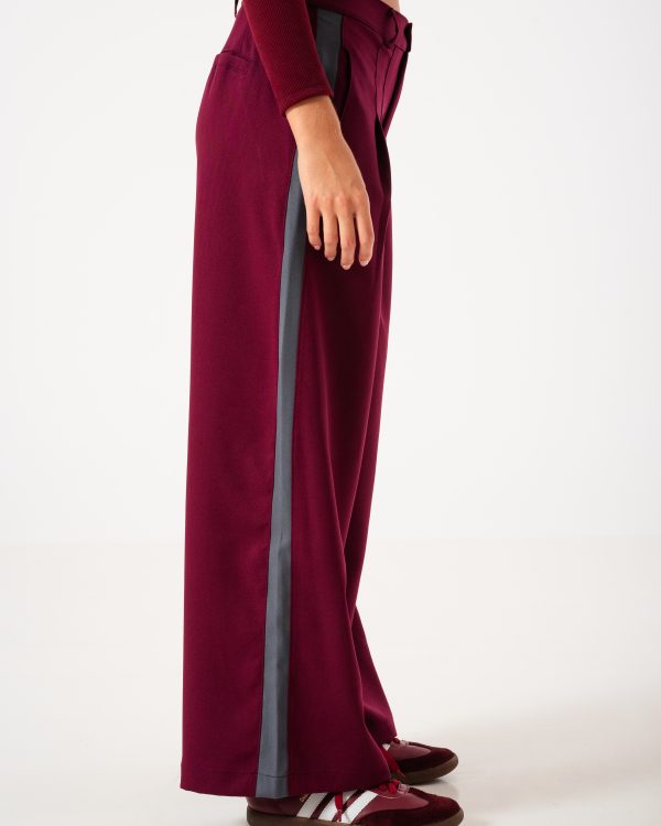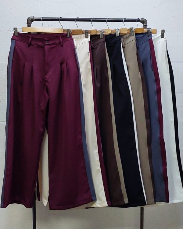Pantalon estilo maxi palazo confeccionado en tela de sastrero con detalle de franja en sus laterales, bolsillos, pinzas delanteras, pasacinto, cierre y boton.