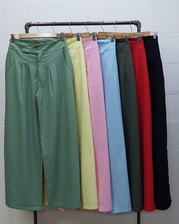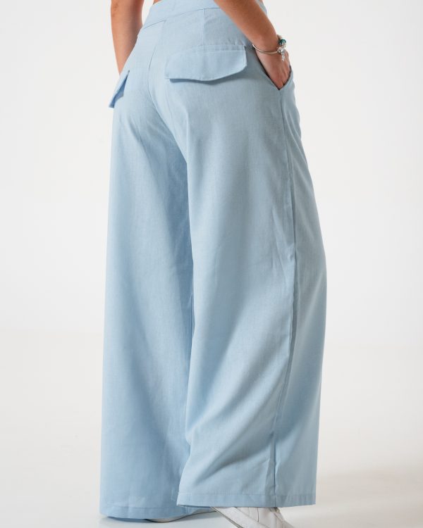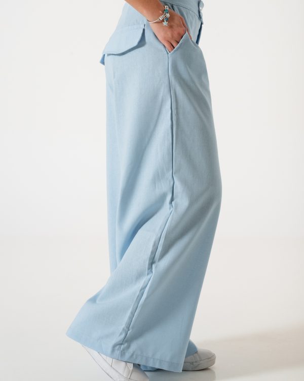 Pantalon estilo maxi palazo confeccionado en tela de lino con detalle de boton cruzado, pinzas delanteras, bolsillos, cierre y boton.