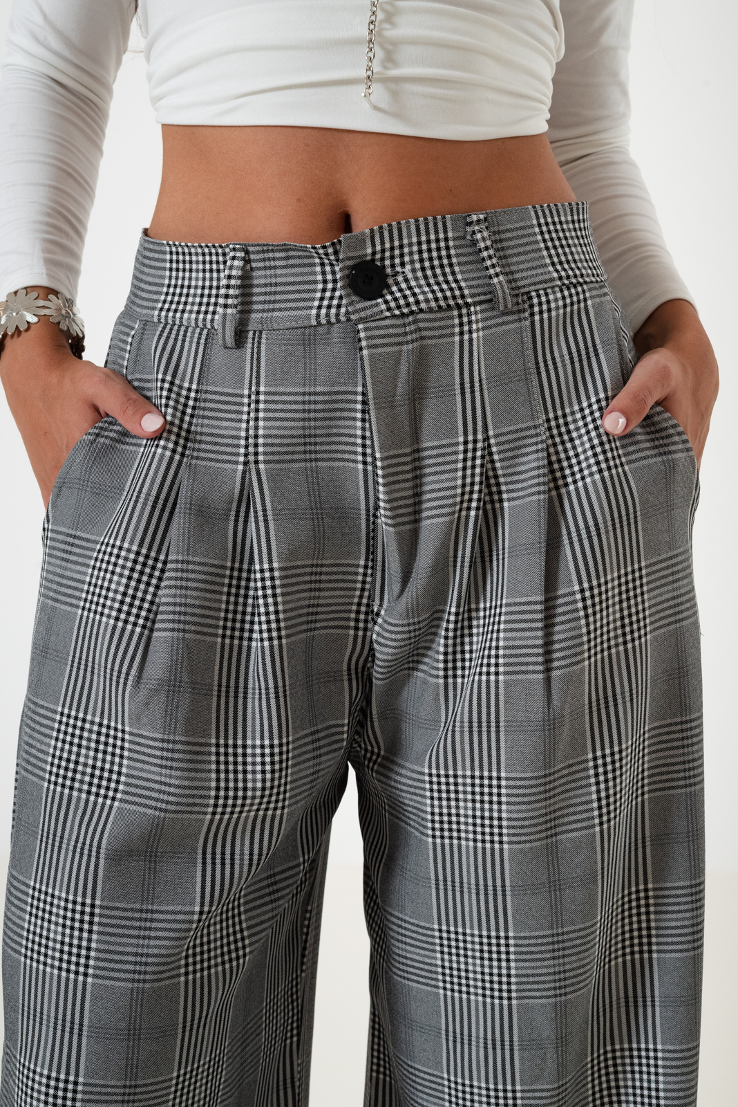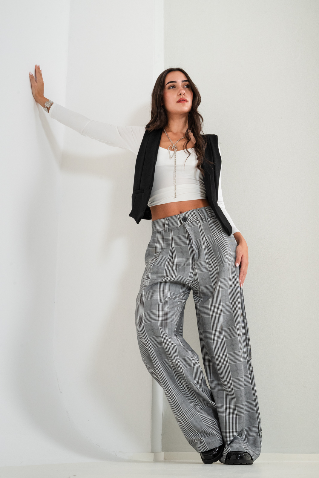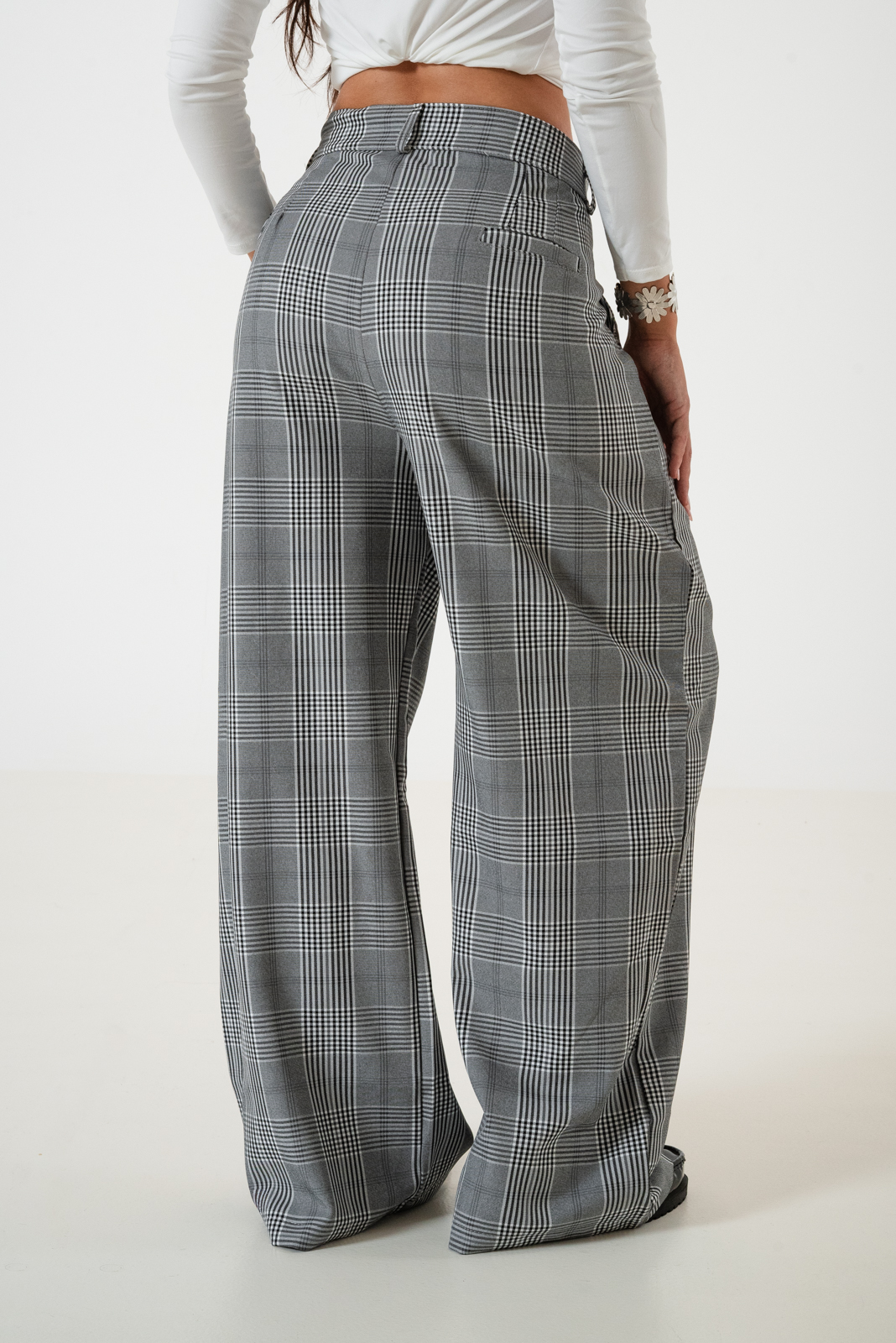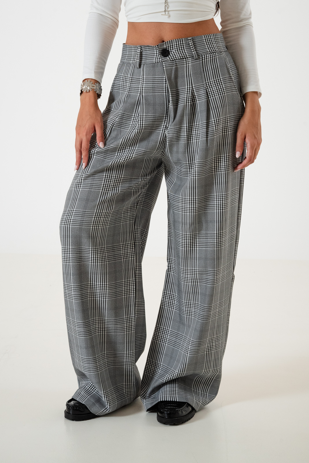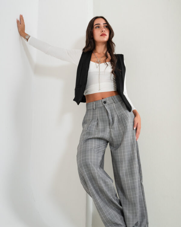 Pantalon estilo maxi palazo confeccionado en tela de sastrero escoses con de pinzas delanteras, bolsillos, pasacinto, cierre y boton.