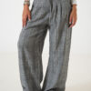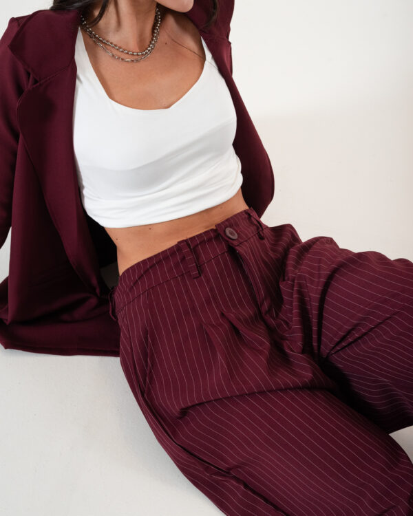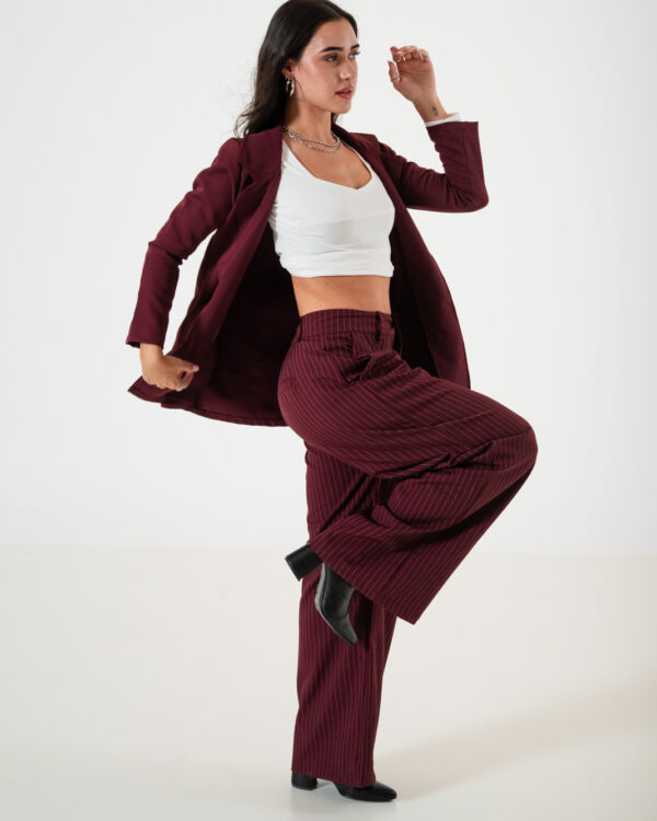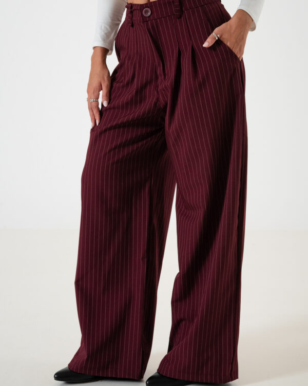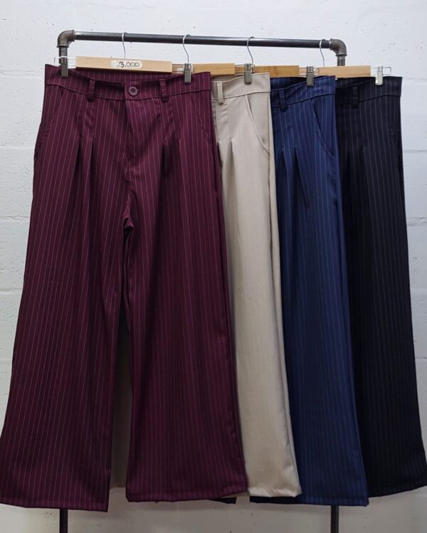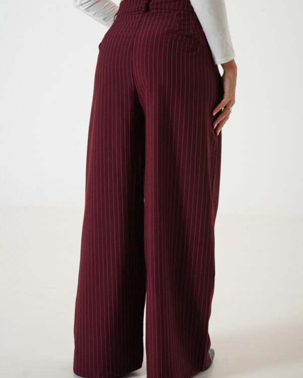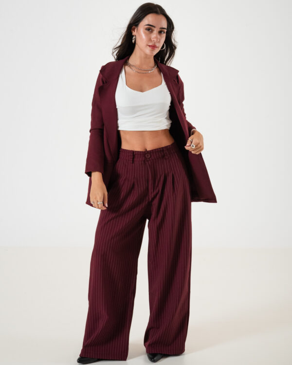 Pantalon estilo maxi palazo confeccionado en tela de sastrero rayado con detalle de doble pinzas delanteras, bolsillos, pasacinto, cierre y boton.