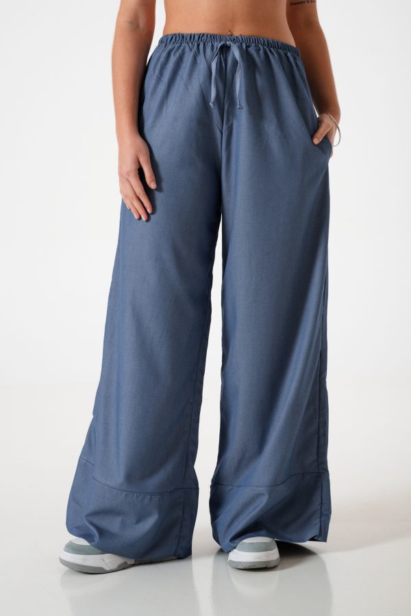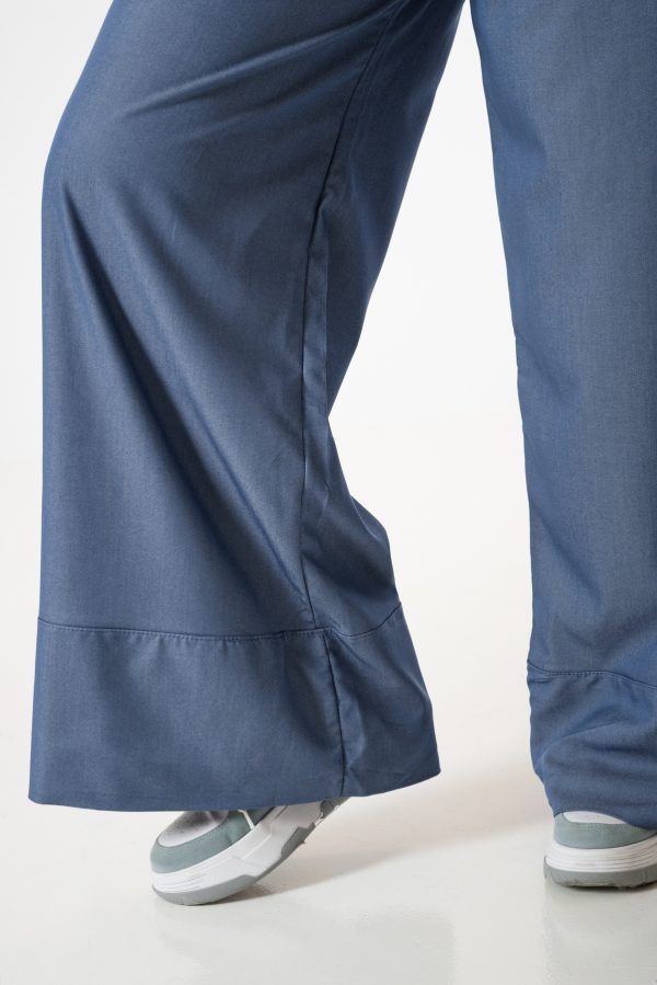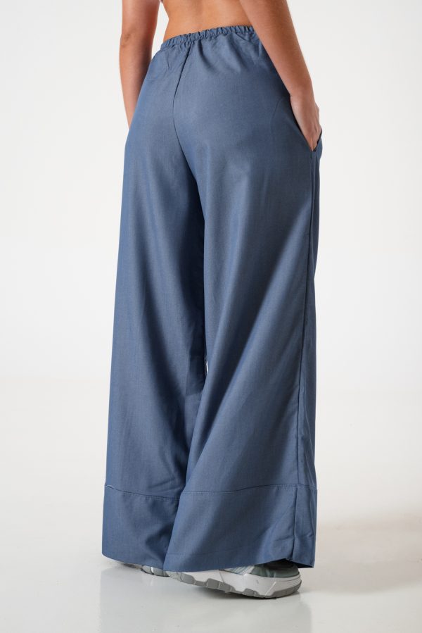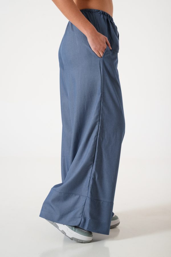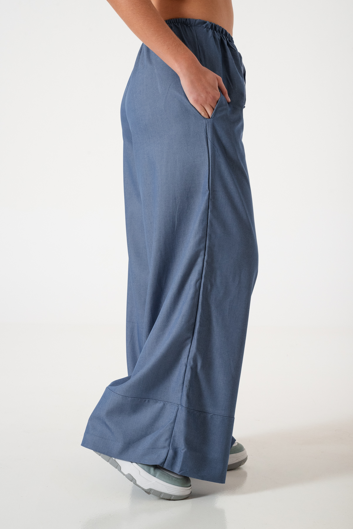 Pantalon estilo maxi palazo confeccionado en tela de simil jean con detalle de cintura elastizada, botamanga marcada y bolsillos.