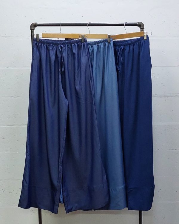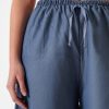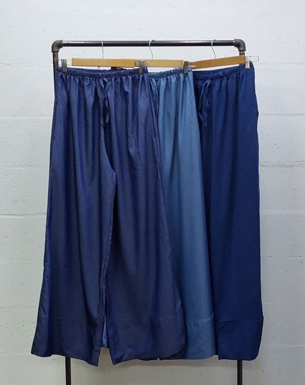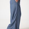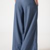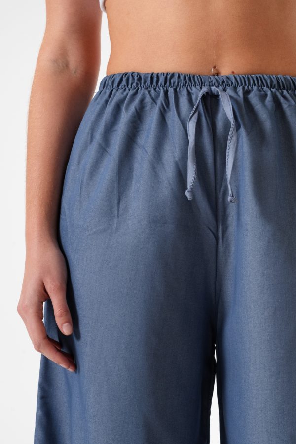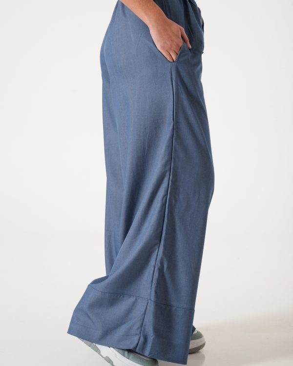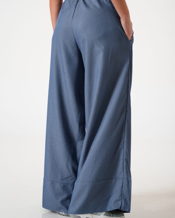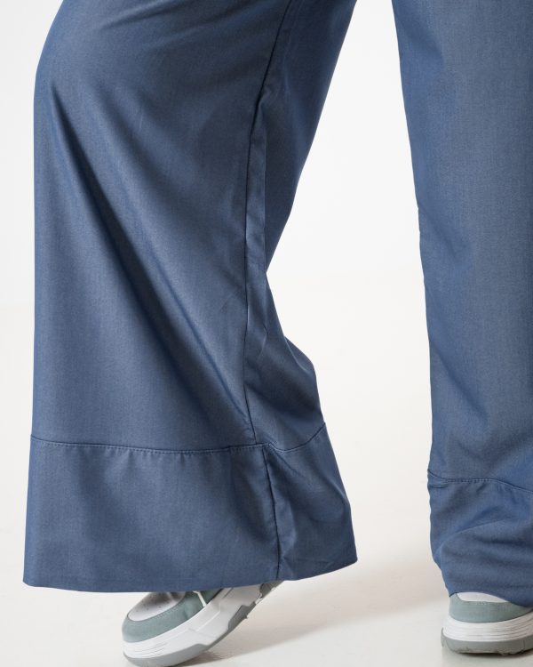 Pantalon estilo maxi palazo confeccionado en tela de simil jean con detalle de cintura elastizada, botamanga marcada y bolsillos.