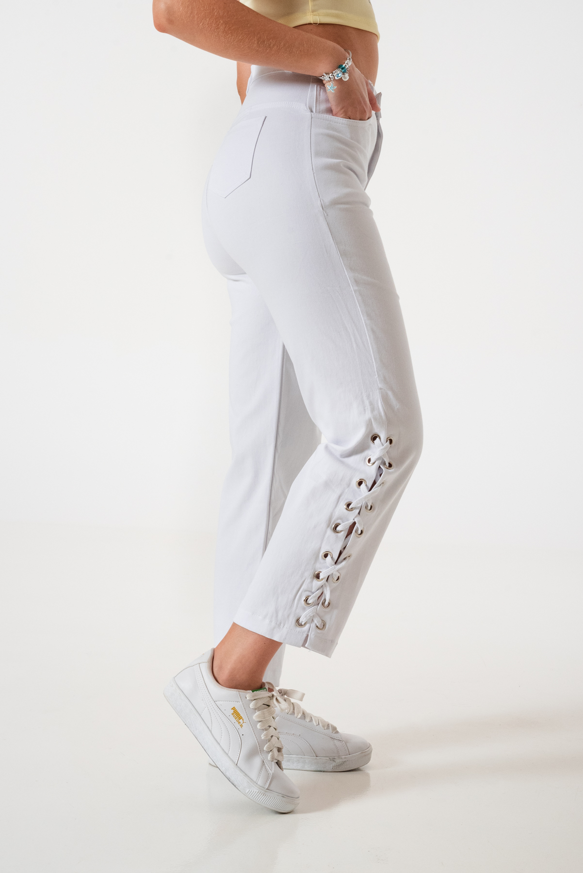 Pantalon estilo mom confeccionado en tela de gabardina con detalle de cordon abajo, bolsillos, pasacinto, cierre y boton