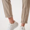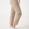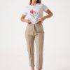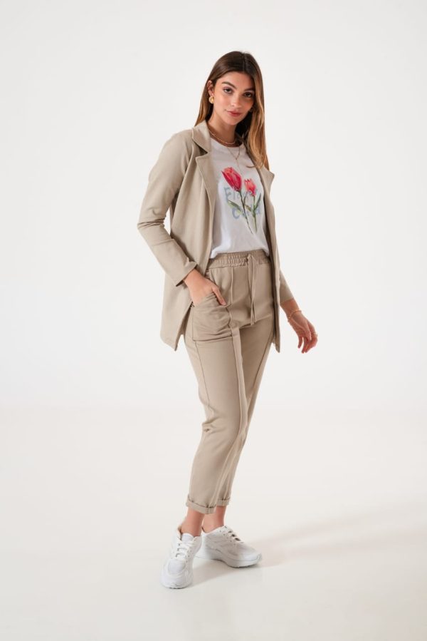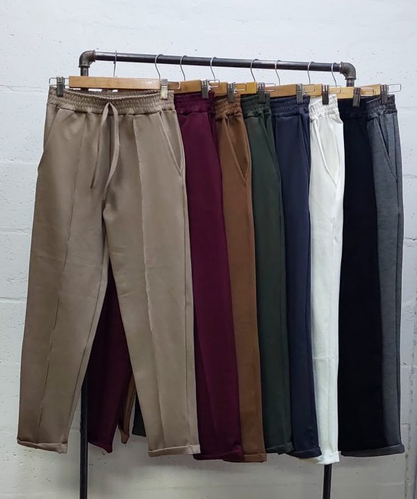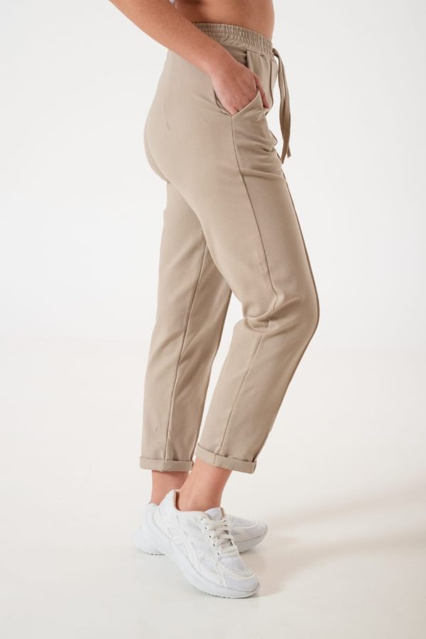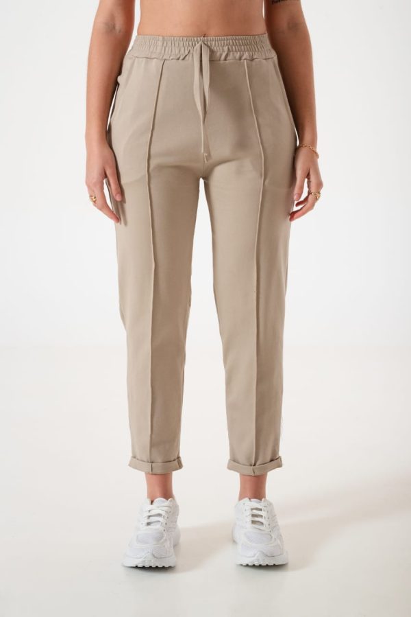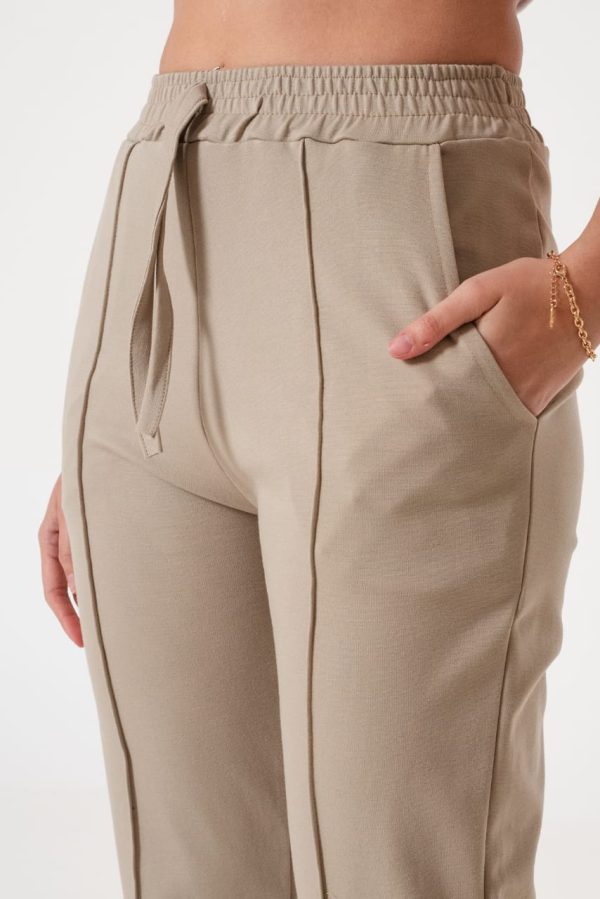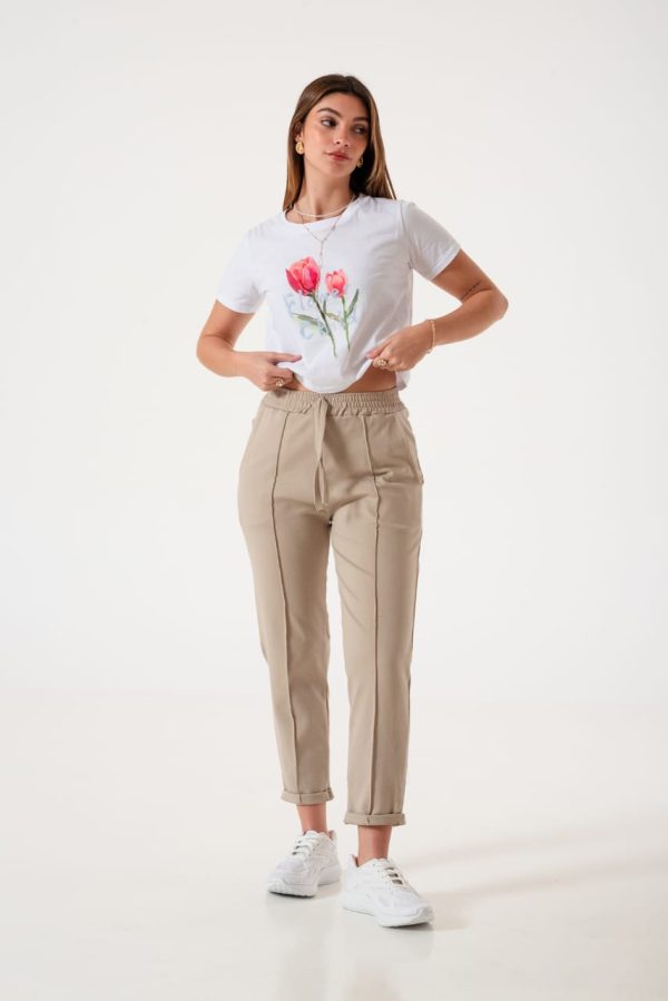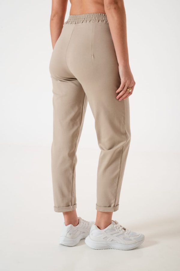 Pantalon estilo mom confeccionado en tela de punto roma con detalle de despunte delantero, cintura elastizada y bolsillos