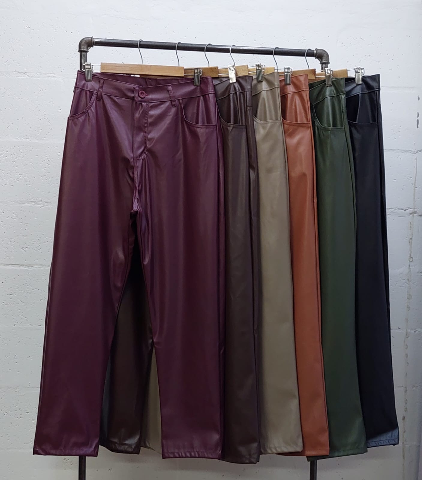 Pantalon estilo mom fit confeccionado en tela de ecocuero con detall de bolsillos, pasacinto, cierre y boton.
