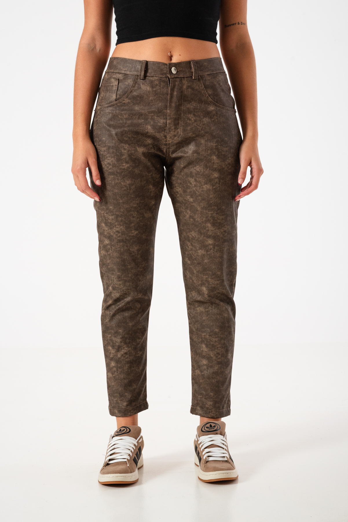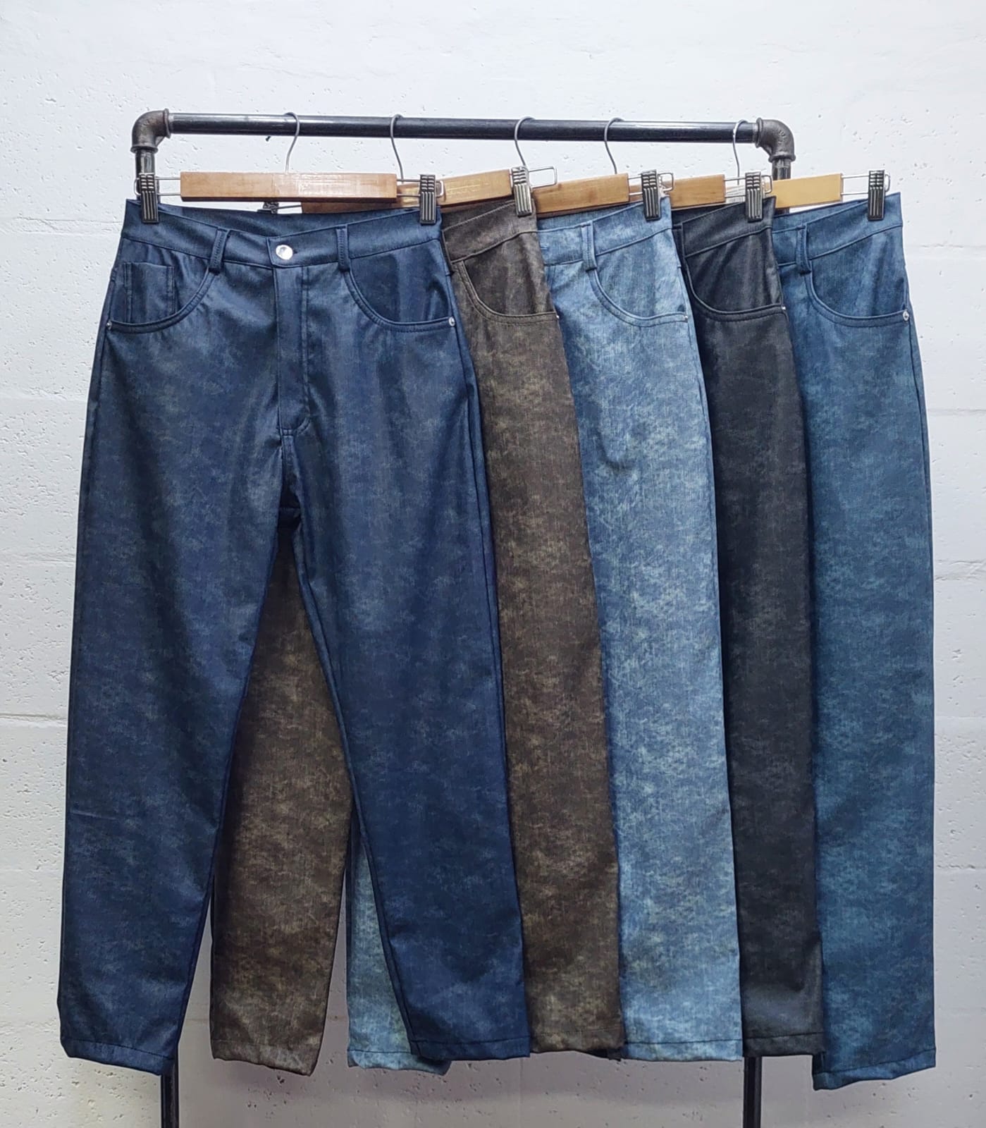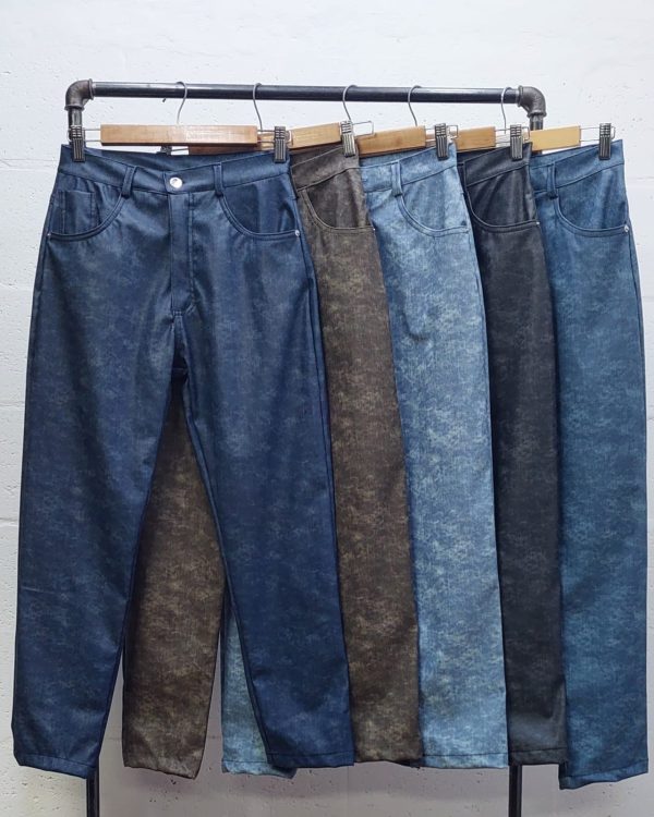 Pantalon estilo mom confeccionado en tela de engomado jean con detalle de bolsillos, pasacinto, cierre y boton.